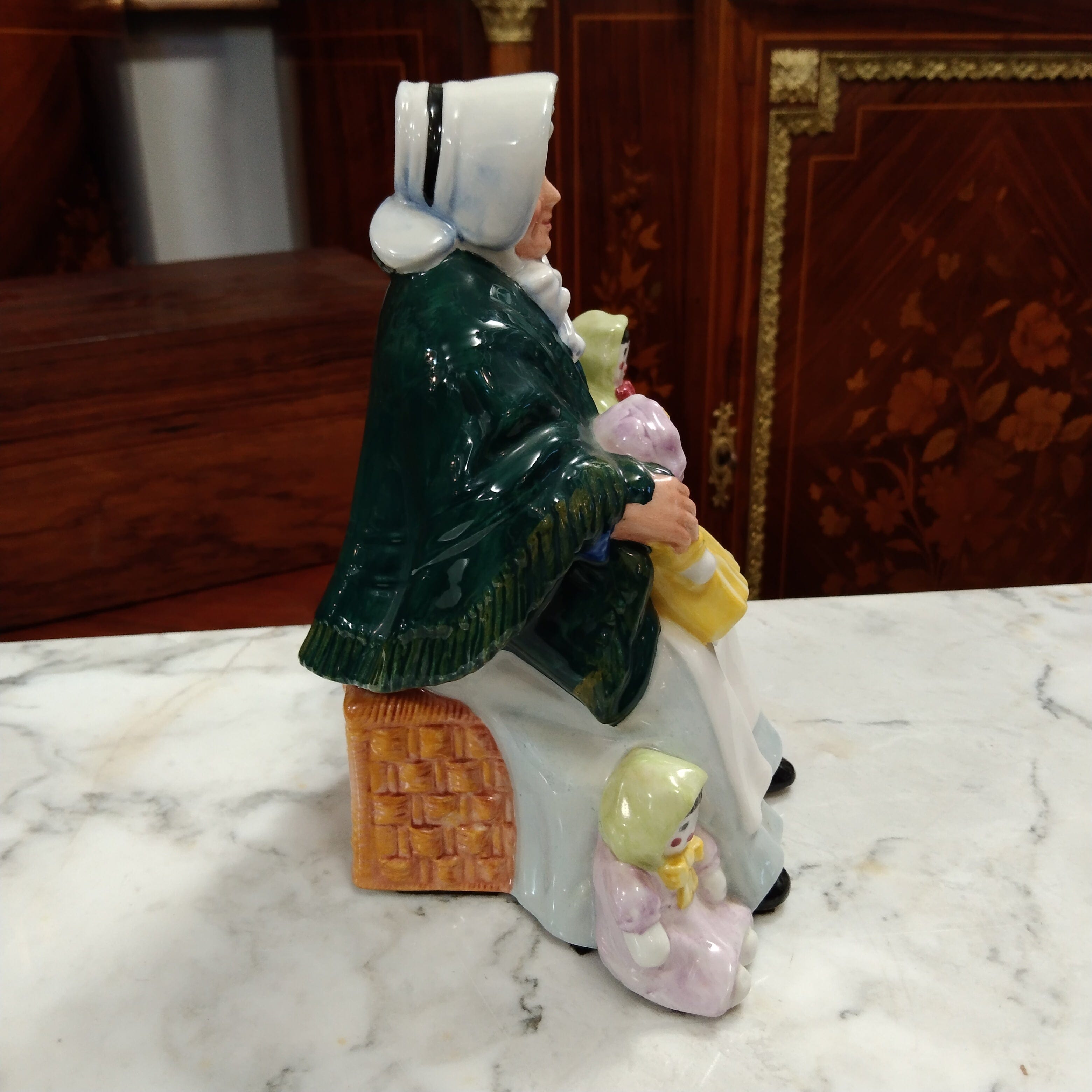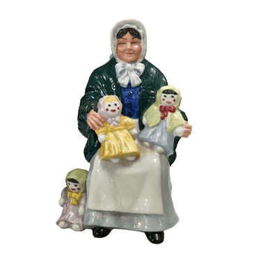 Bella figura de porcelana de la reconocida marca inglesa Royal Doulton, fabricada y pintada a mano en 1989. La figura representa a una mujer, con un vestido y delantal, vendiendo tres muñecas de trapo en colores pasteles.