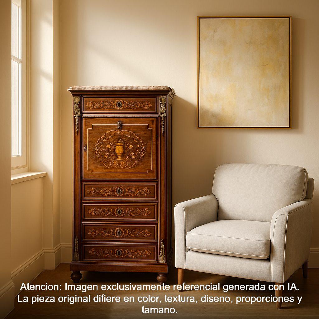 Elegante Chiffonier francés estilo Luis XVI con fina marquetería floral, aplicaciones en bronce, cubierta de mármol y escritorio interior de cuero ruleteado de color rojo. La pieza tiene un cajón superior, cuatro cajones inferiores y una puerta de acceso a su zona de escritorio, con dos cajoncitos menores y una cubierta de cuero.