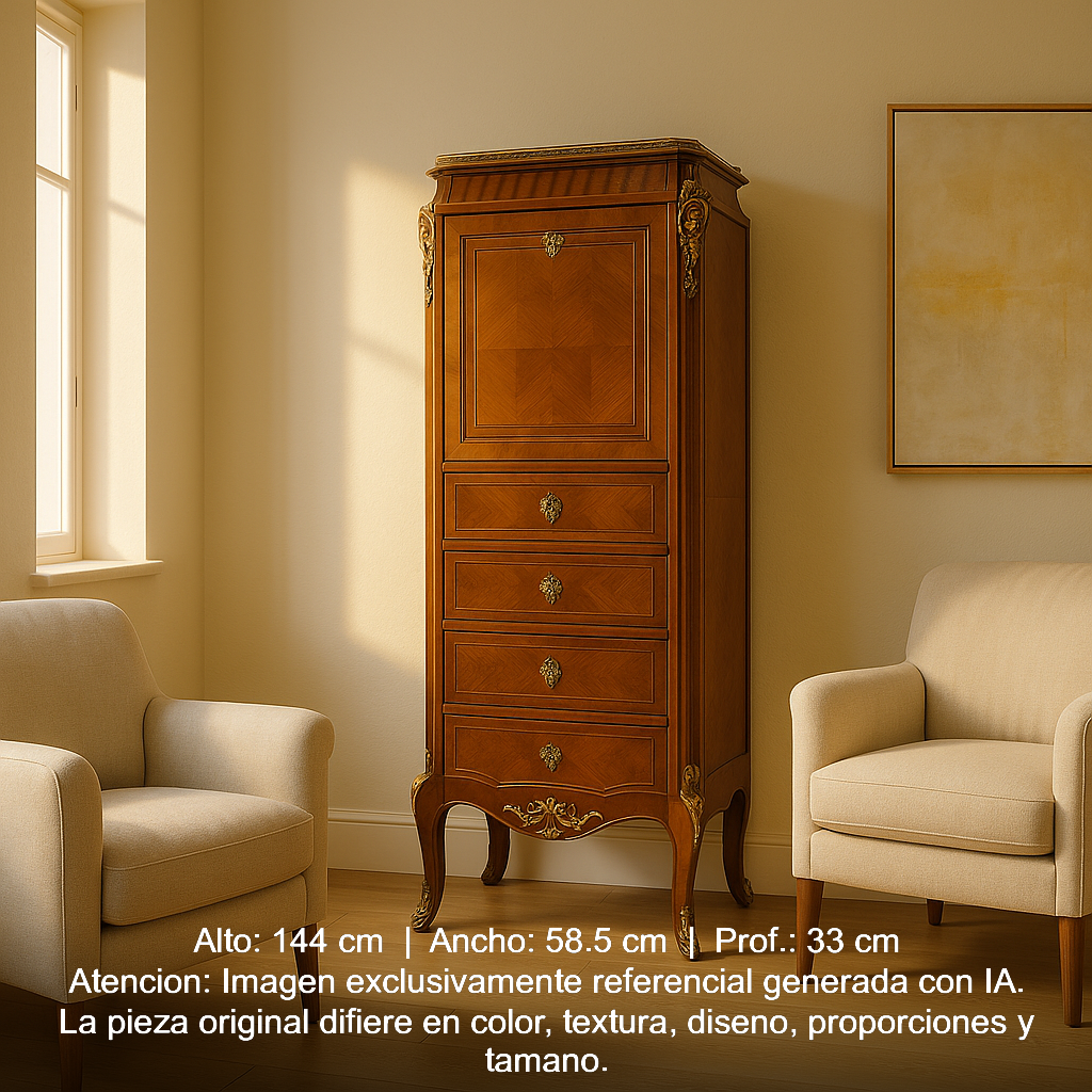 Esta pieza es un Secretario Francés de estilo Luis XV, caracterizada por su delicada marquetería de caoba, palo rosa y aplicaciones de bronce. Cuenta con un escritorio abatible y múltiples cajones externos e internos y una cubierta de mármol. Se usó comúnmente en el siglo XIX para almacenar artículos de escritura y documentos en espacios reducidos, alcanzando gran popularidad en la alta sociedad. Circa 1900