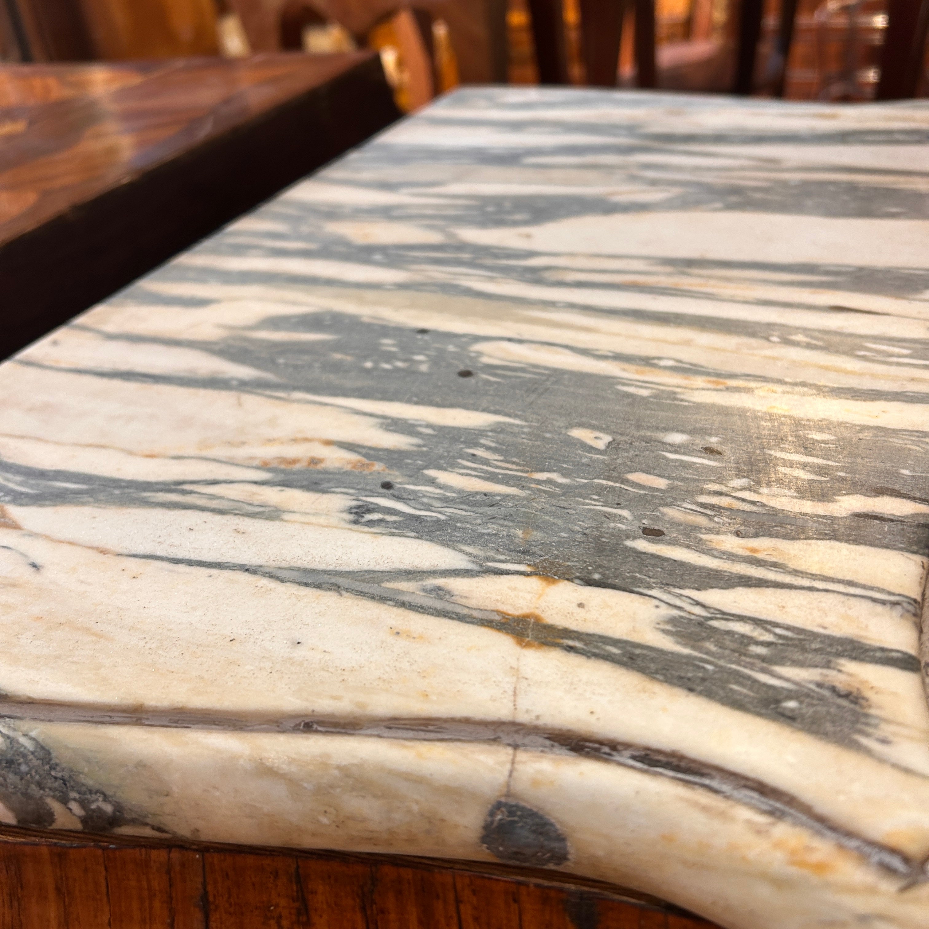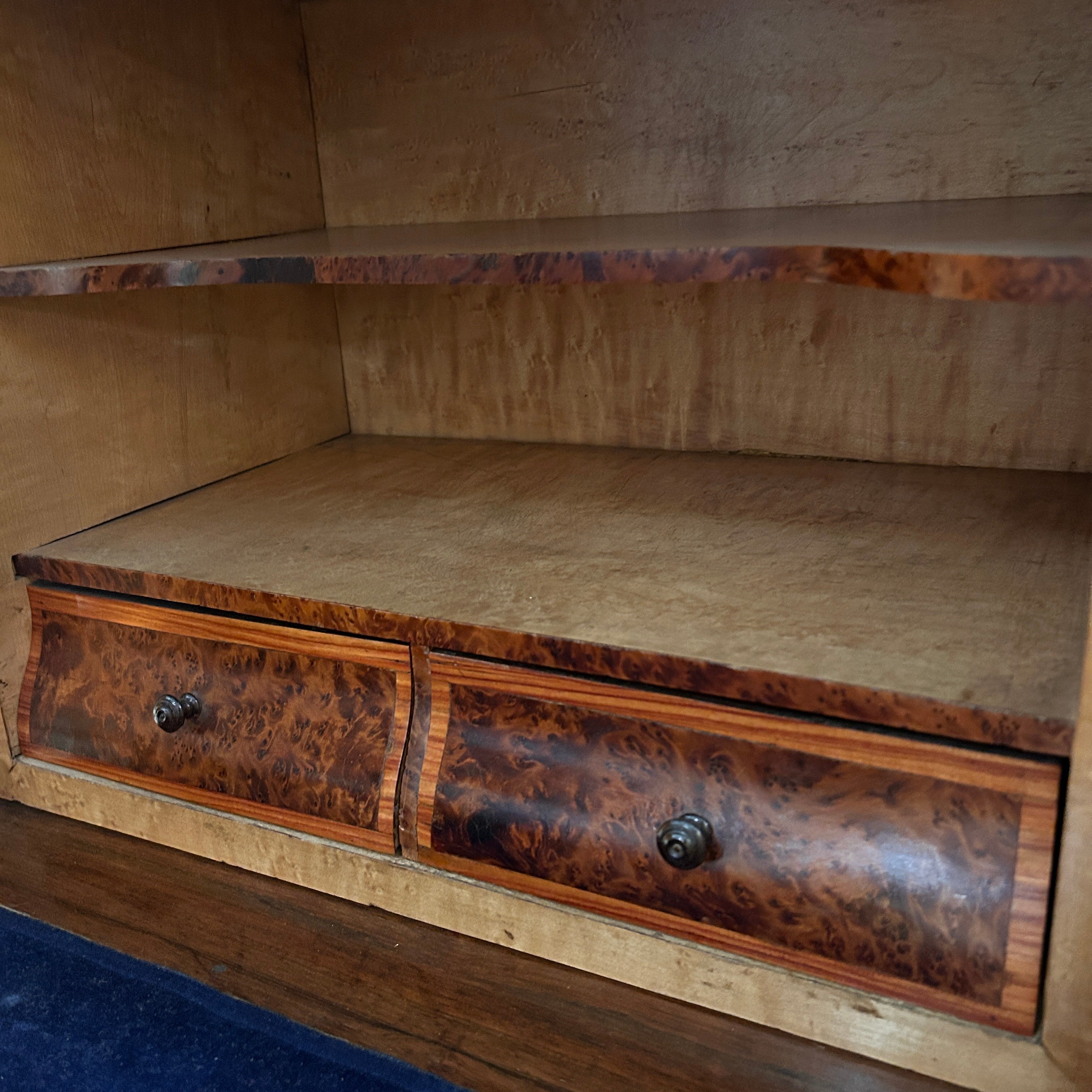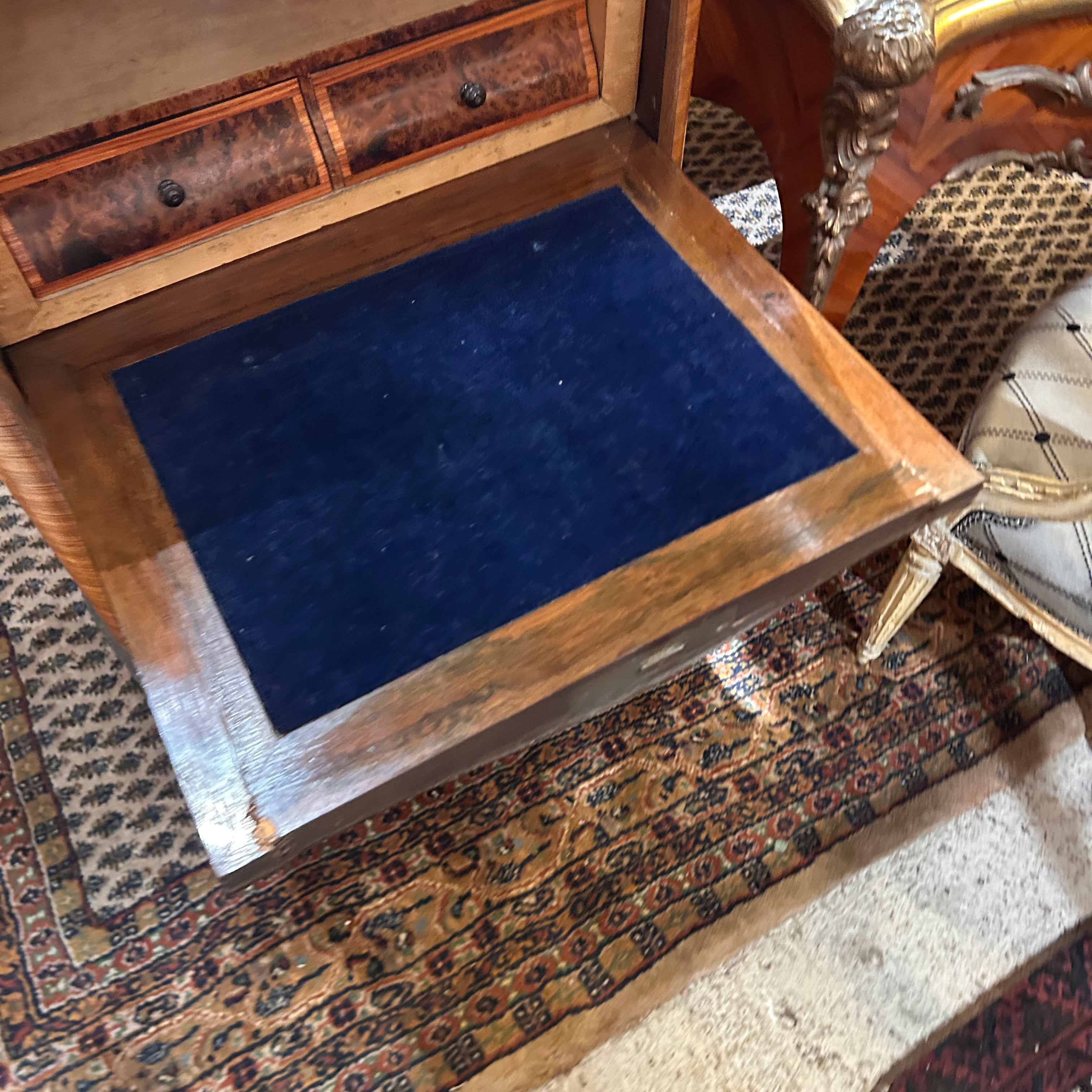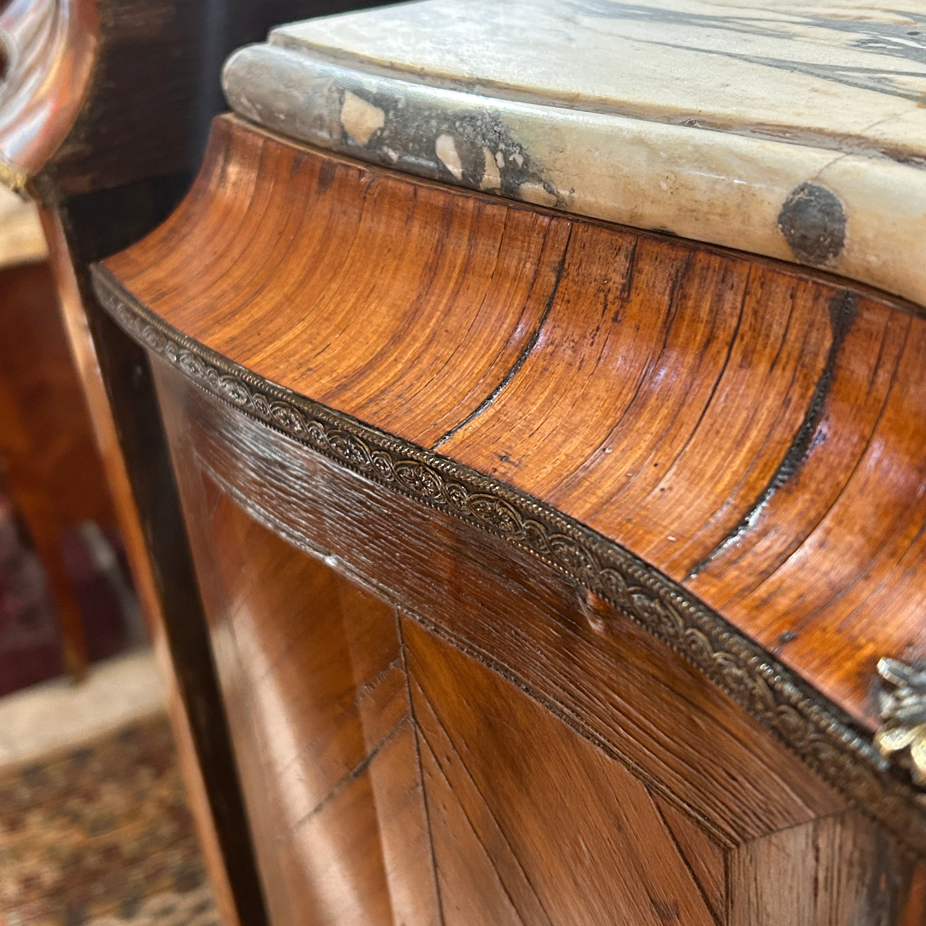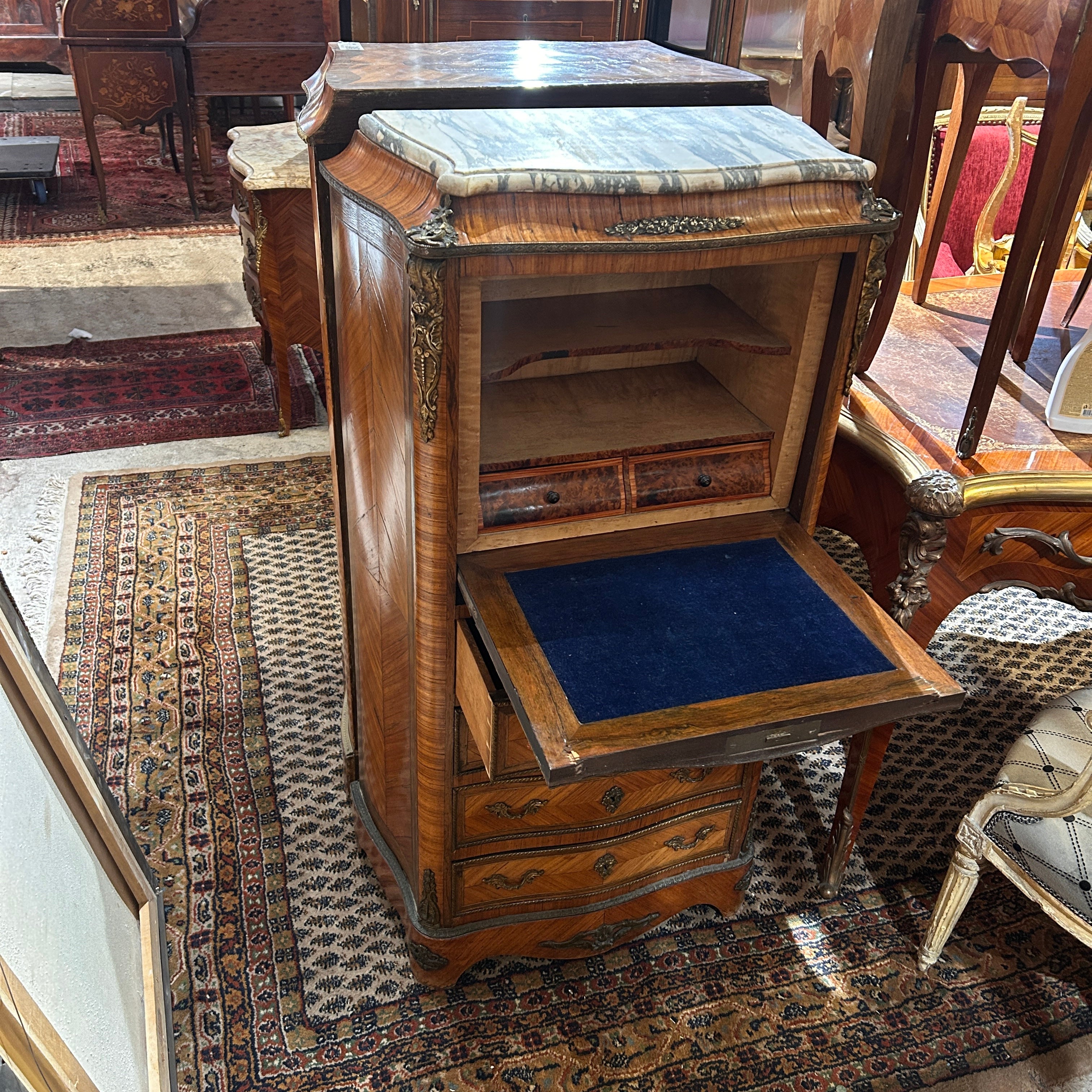 Bellísimo Chiffonier secretaire francés estilo Luis XV bombé de fines del s.XIX. En palo de rosa, raíz, erable y nogal. Elegantes aplicaciones y tiradores en bronce, y cubierta de mármol blanco con vetas plomo. Cuatro cajones inferiores de almacenaje y tres cajones superiores falsos abatibles, todos con aplicaciones en cintillo de bronce. La puerta superior abatible, abre un escritorio de cubierta, con terciopelo azul, dos repisas y dos cajoncitos pequeños. Con detalles y faltantes de uso. Se entrega barnizado.