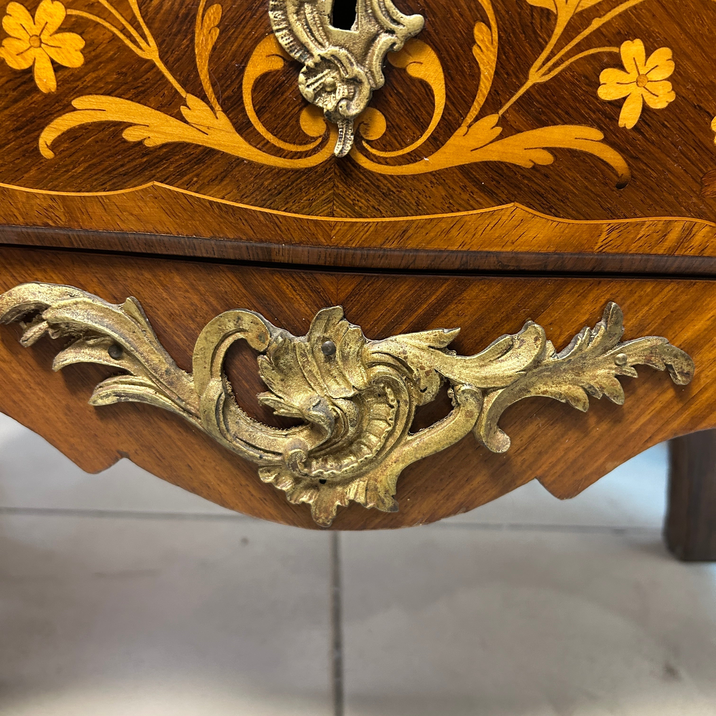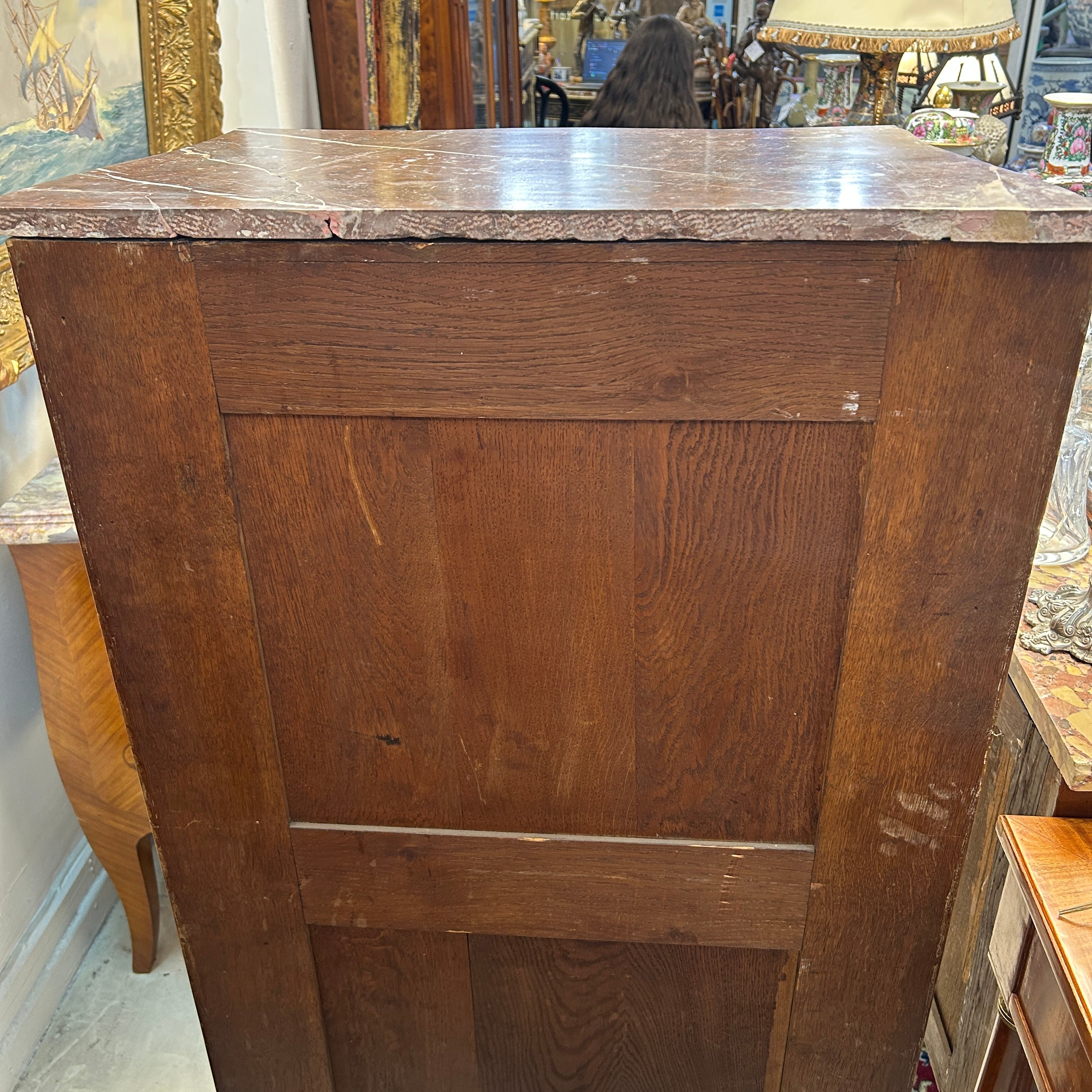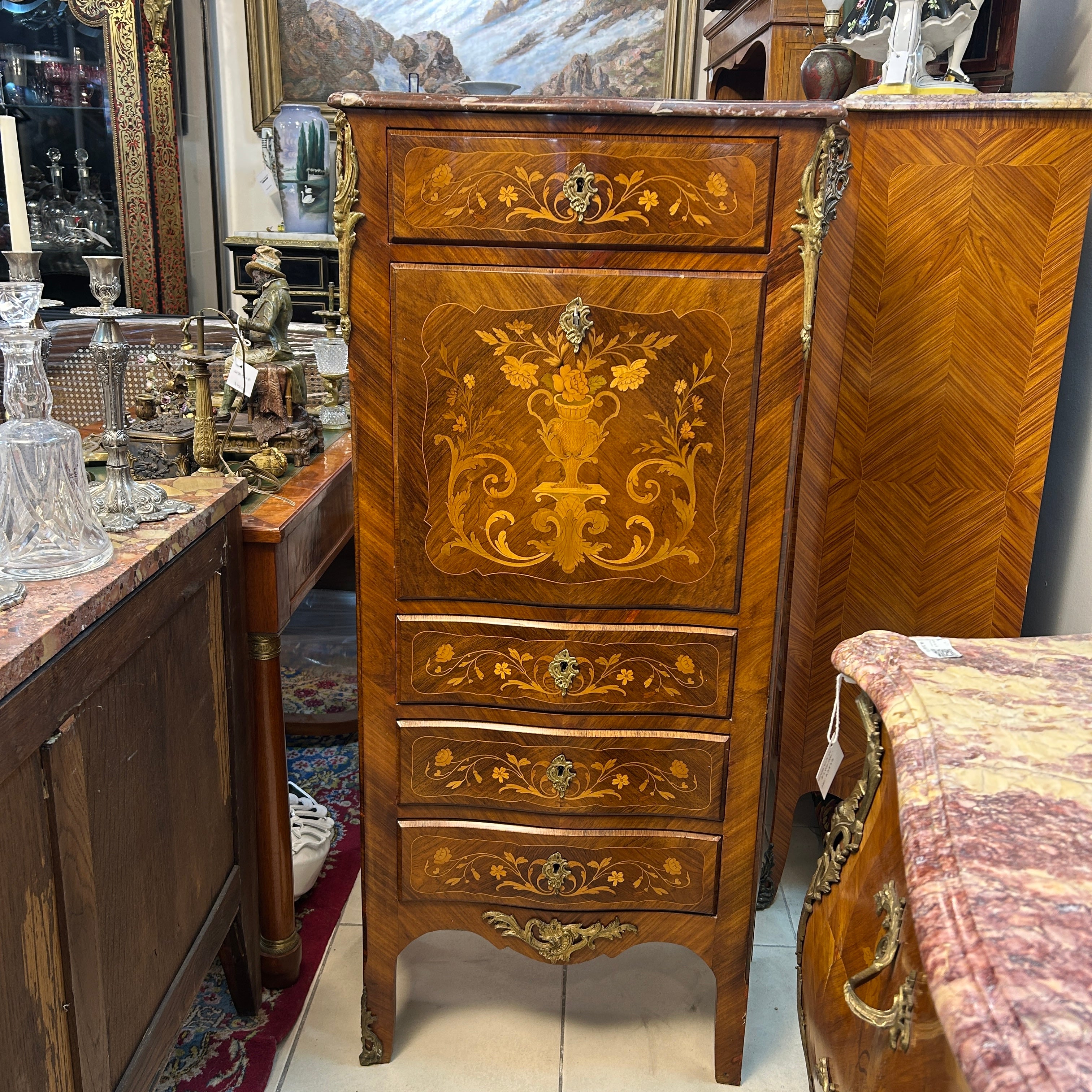 Chiffonier estilo Luis XVI, alto y estrecho. Contiene cuatro cajones, una mesa plegable con superficie de cuero con dos cajones pequeños en su interior y cubierta superior de mármol. Detallado diseño central en marquetería y detalles en bronce. Viene con el mármol original restaurado.