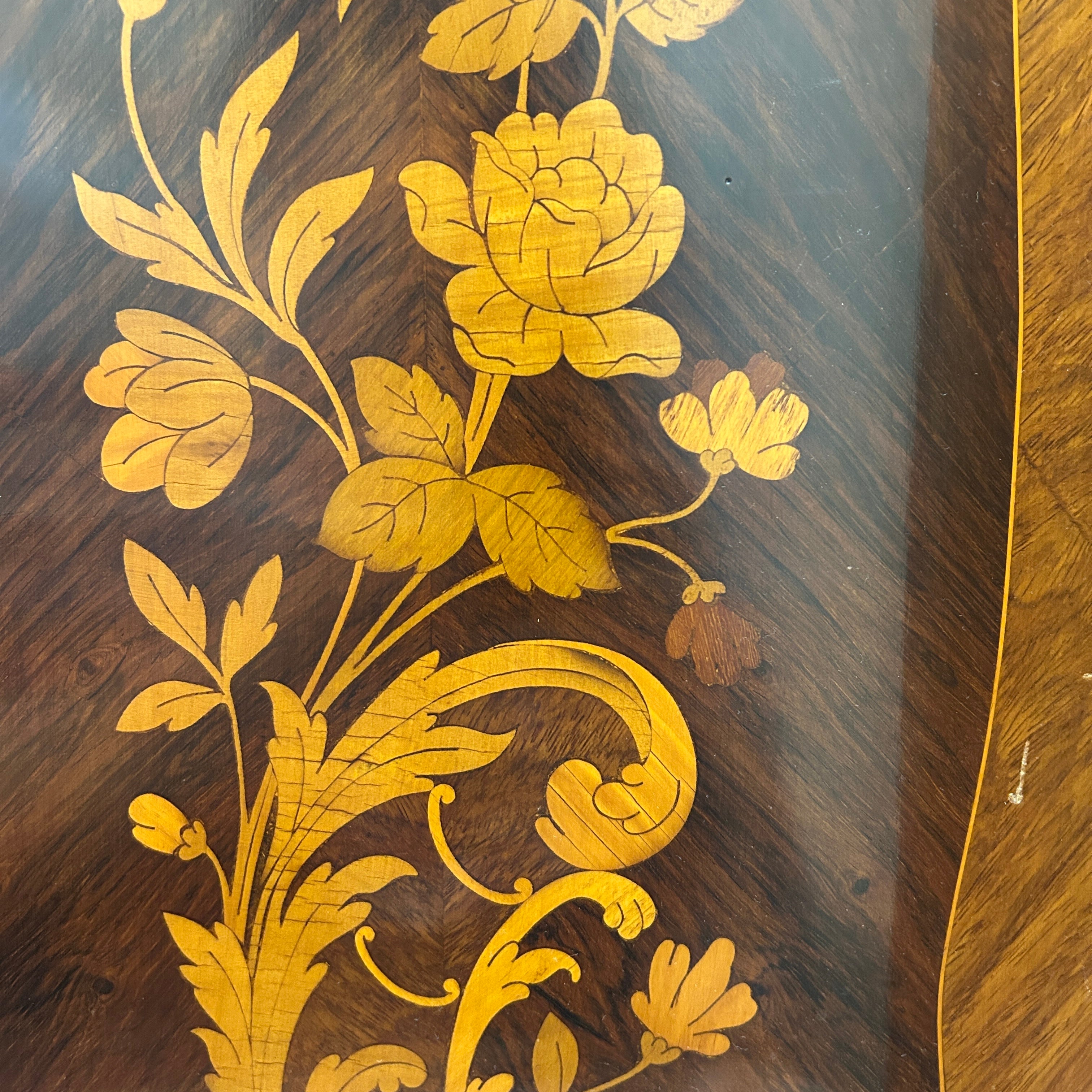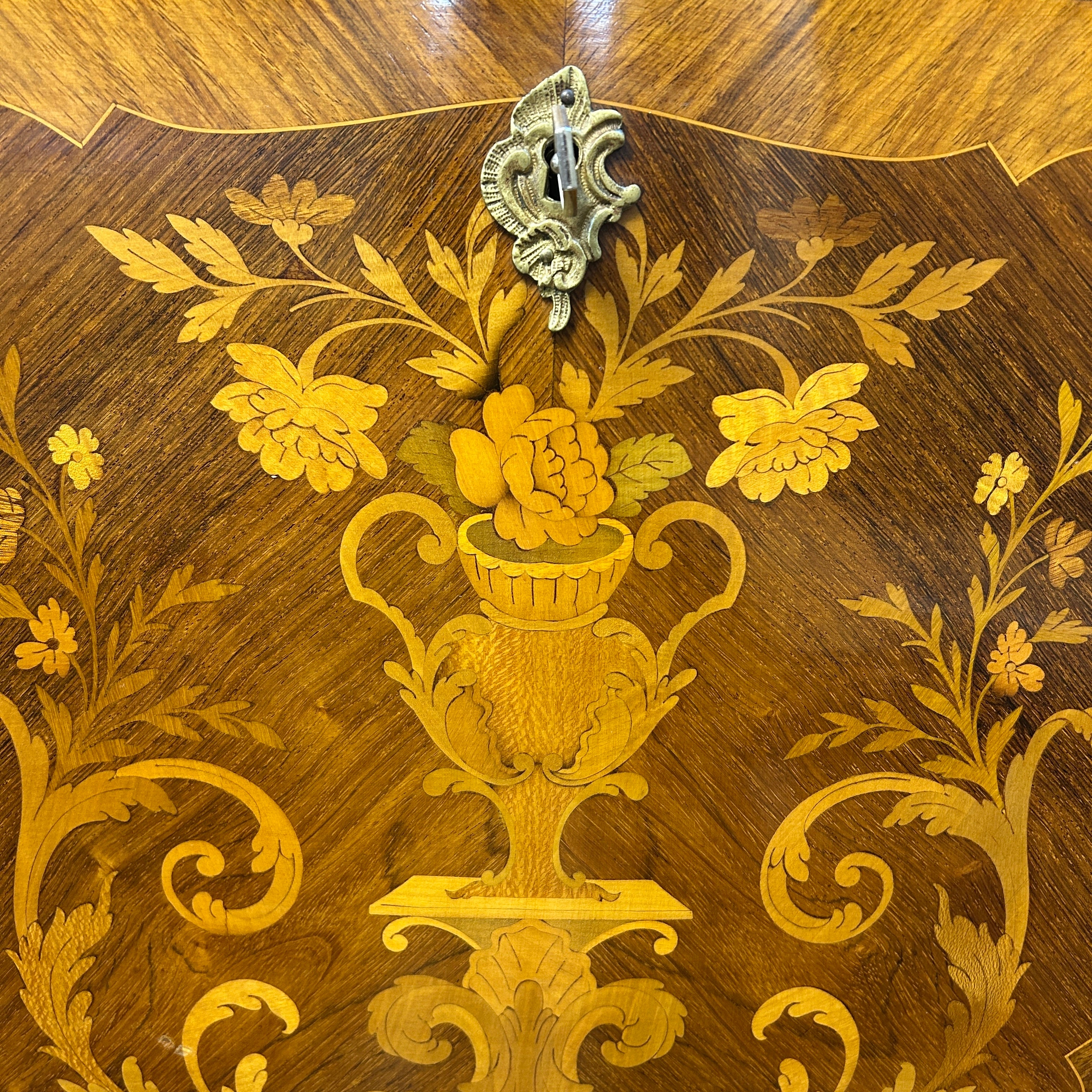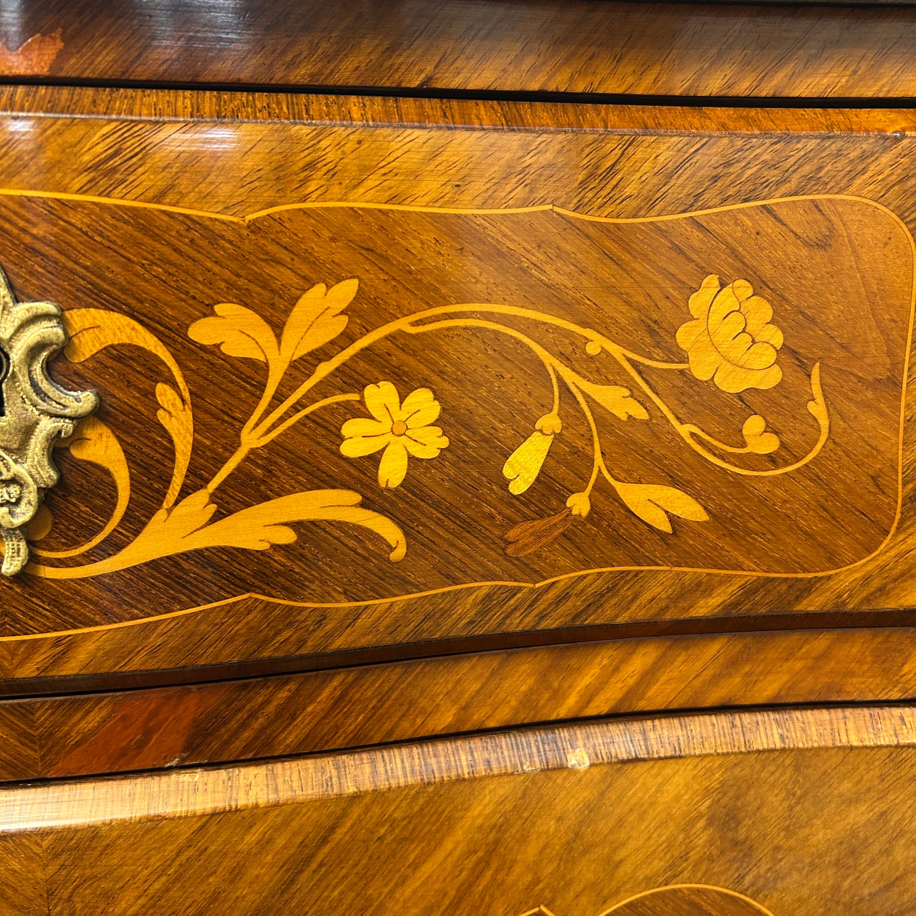 Chiffonier estilo Luis XVI, alto y estrecho. Contiene cuatro cajones, una mesa plegable con superficie de cuero con dos cajones pequeños en su interior y cubierta superior de mármol. Detallado diseño central en marquetería y detalles en bronce. Viene con el mármol original restaurado.