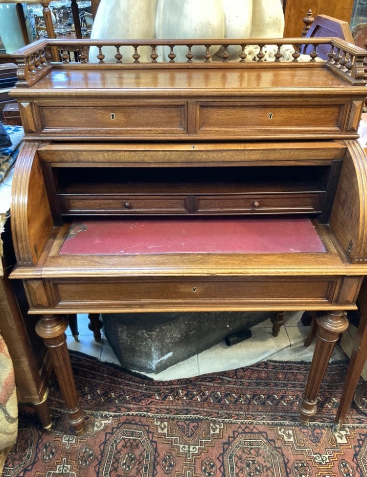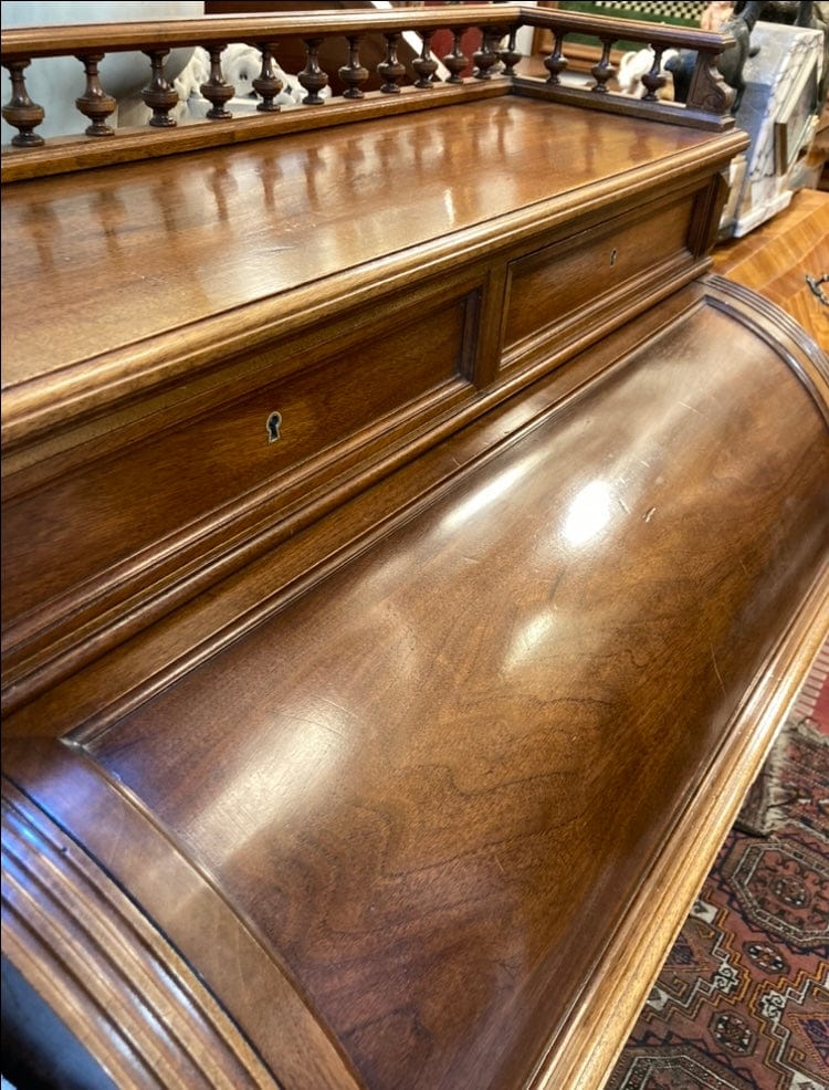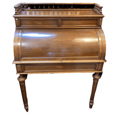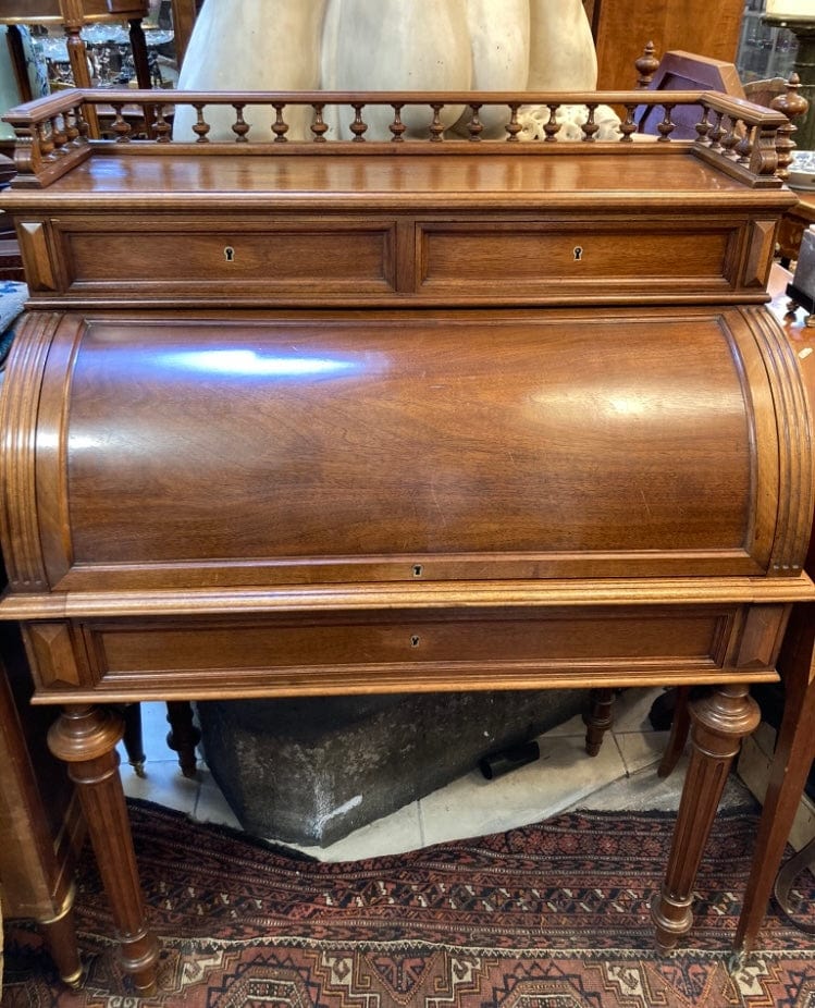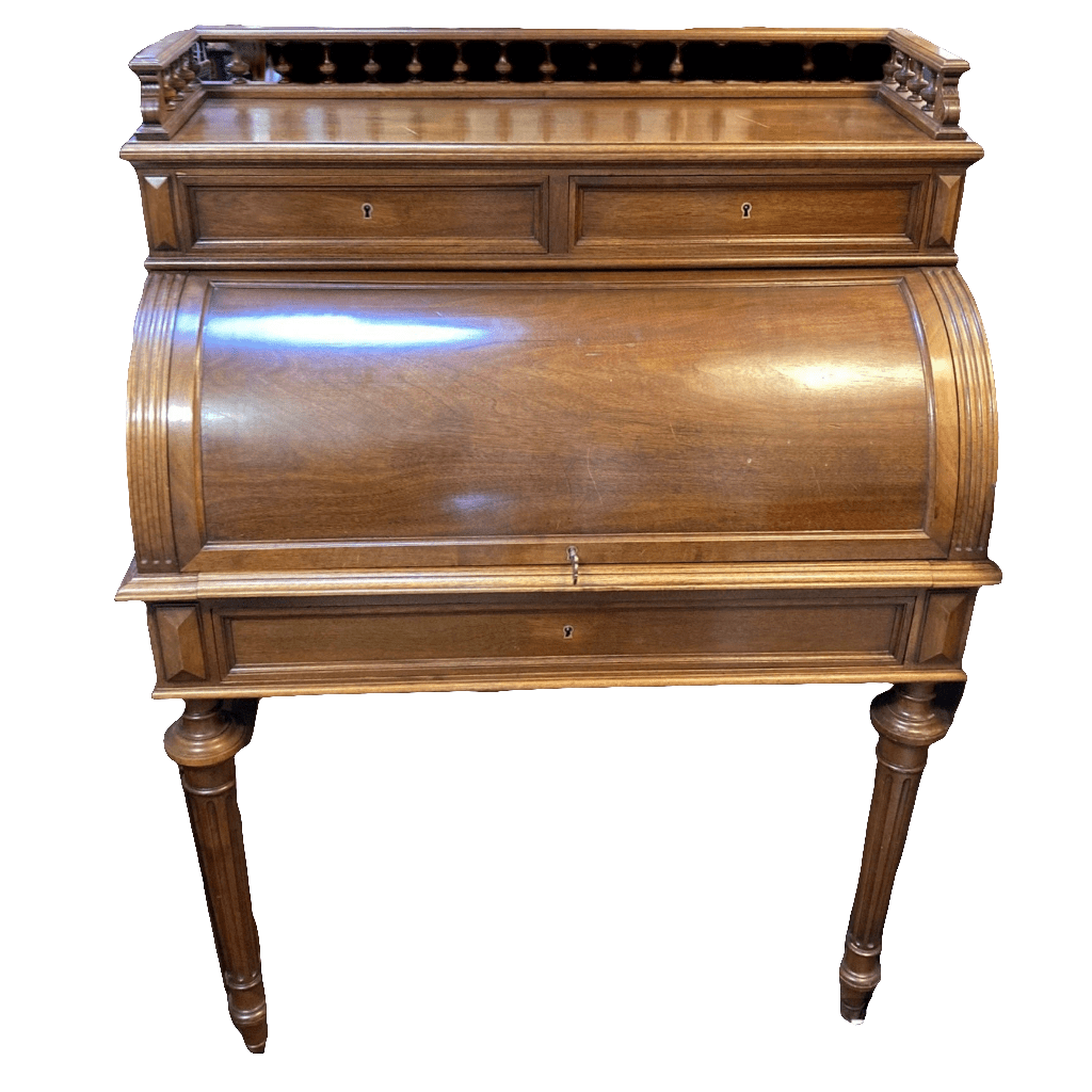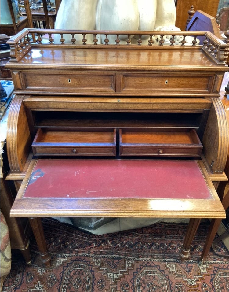Escritorio con tapa de cilindro. En su exterior cuenta con dos cajones superiores y uno de gran tamaño inferior. Por otro lado, en su interior contiene dos cajones y una mesa retráctil.
