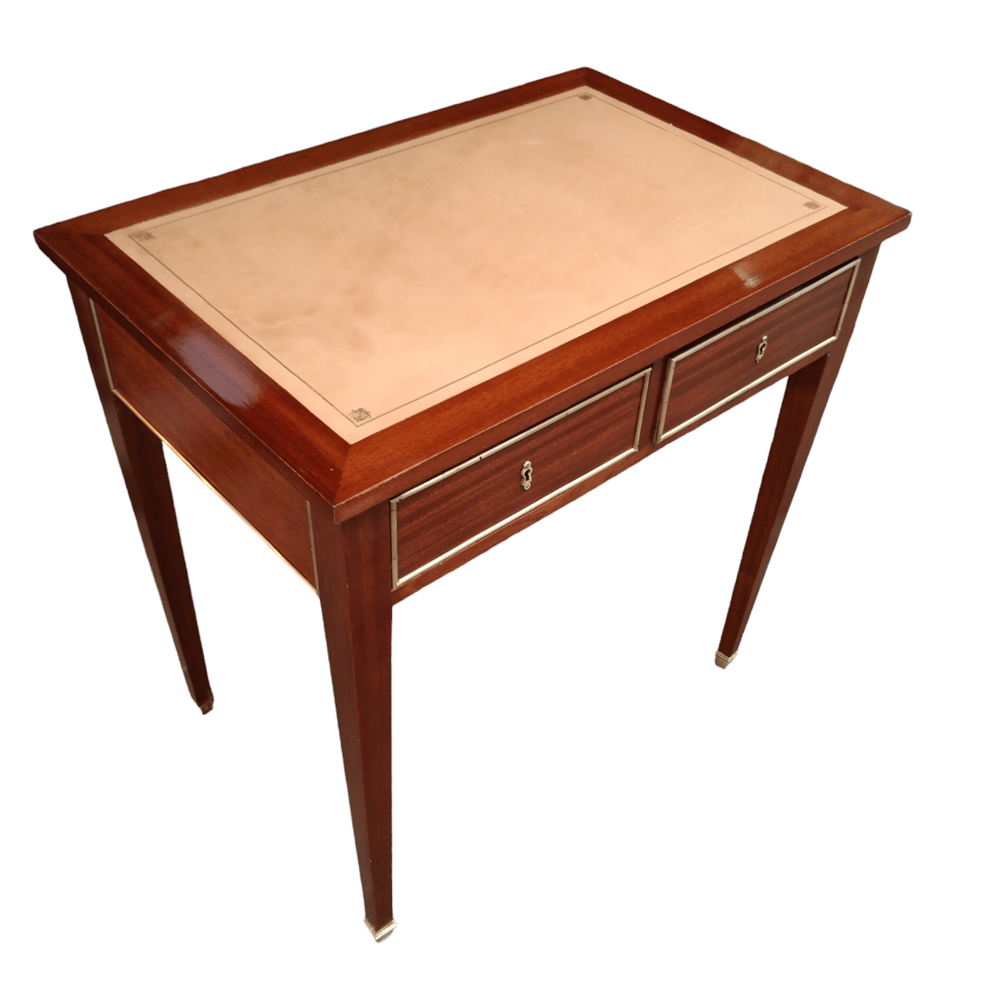 Bello escritorio estilo Luis XVI en caoba, extensible y con cubierta de cuero color crema. Elegantes detalles en bronce en sus patas y sus dos cajones.