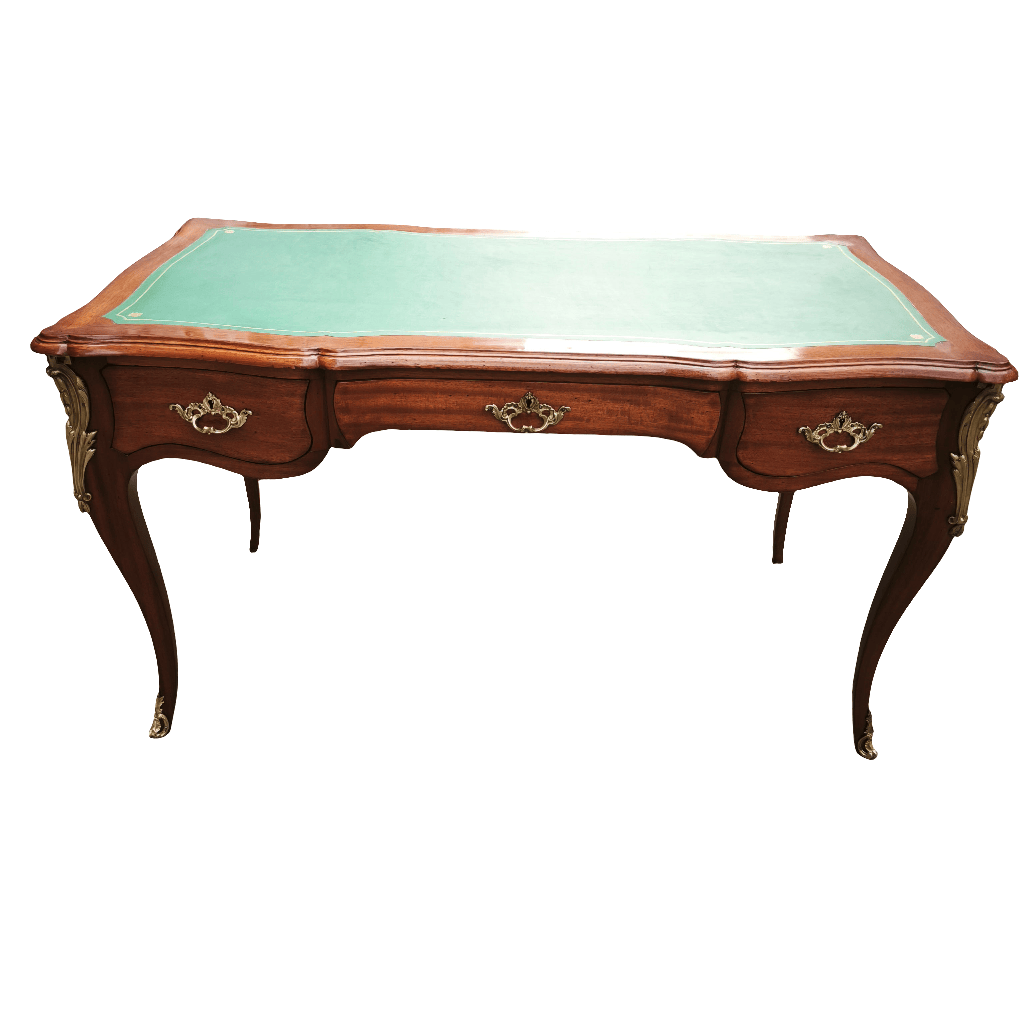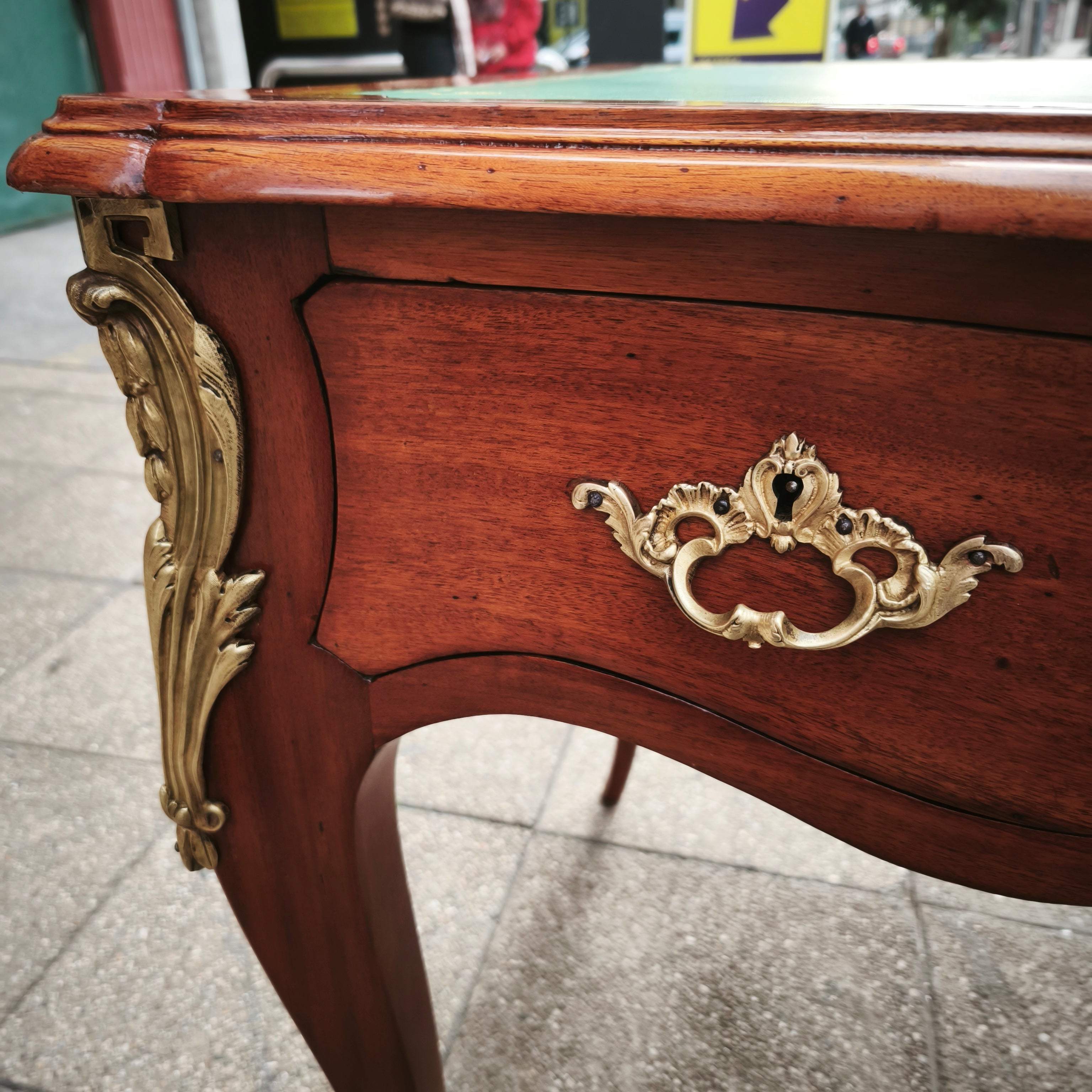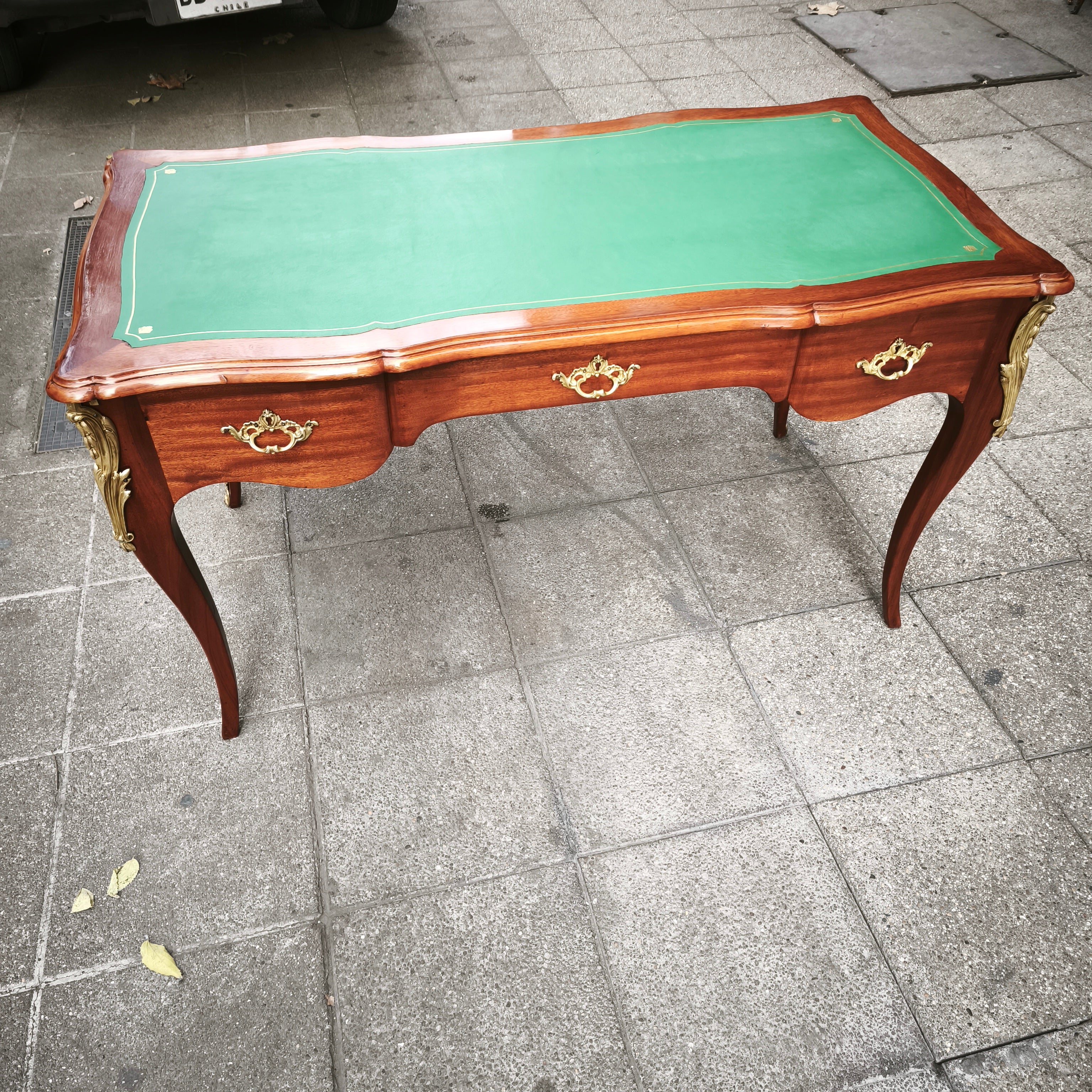 Elegante escritorio francés estilo Luis XV, en caoba rubia con interior de cajones en roble americano, bellas aplicaciones, tacos y tiradores en bronce, y cubierta de cuero verde billar con detalles en dorado. La pieza cuenta con tres cajones de almacenaje.