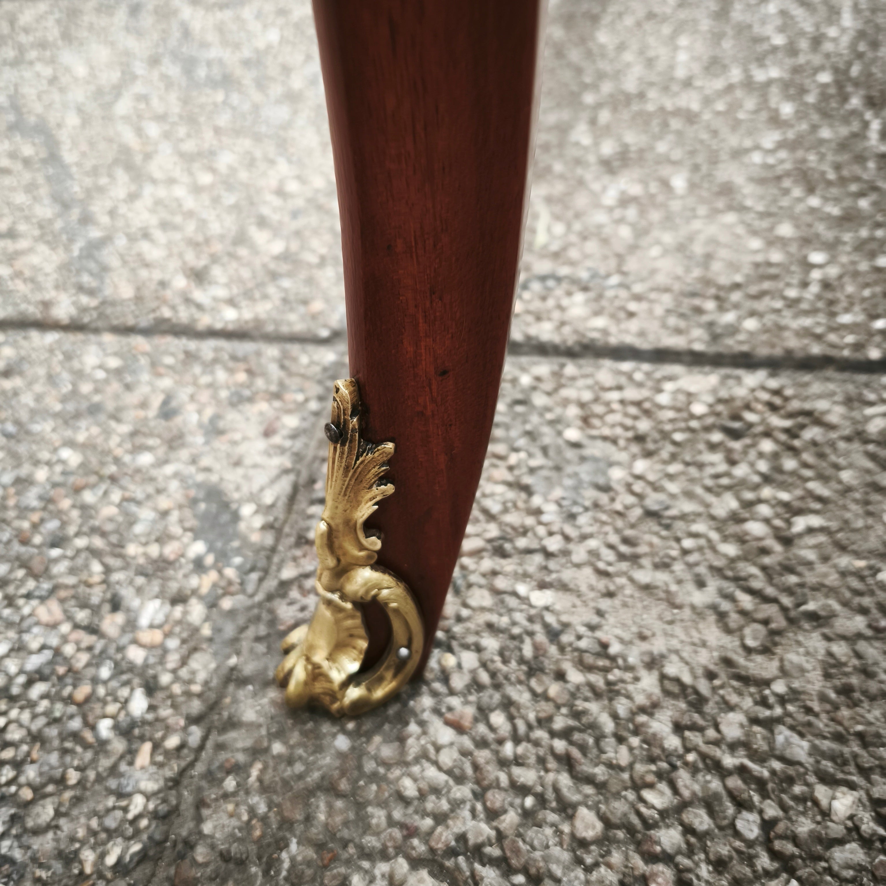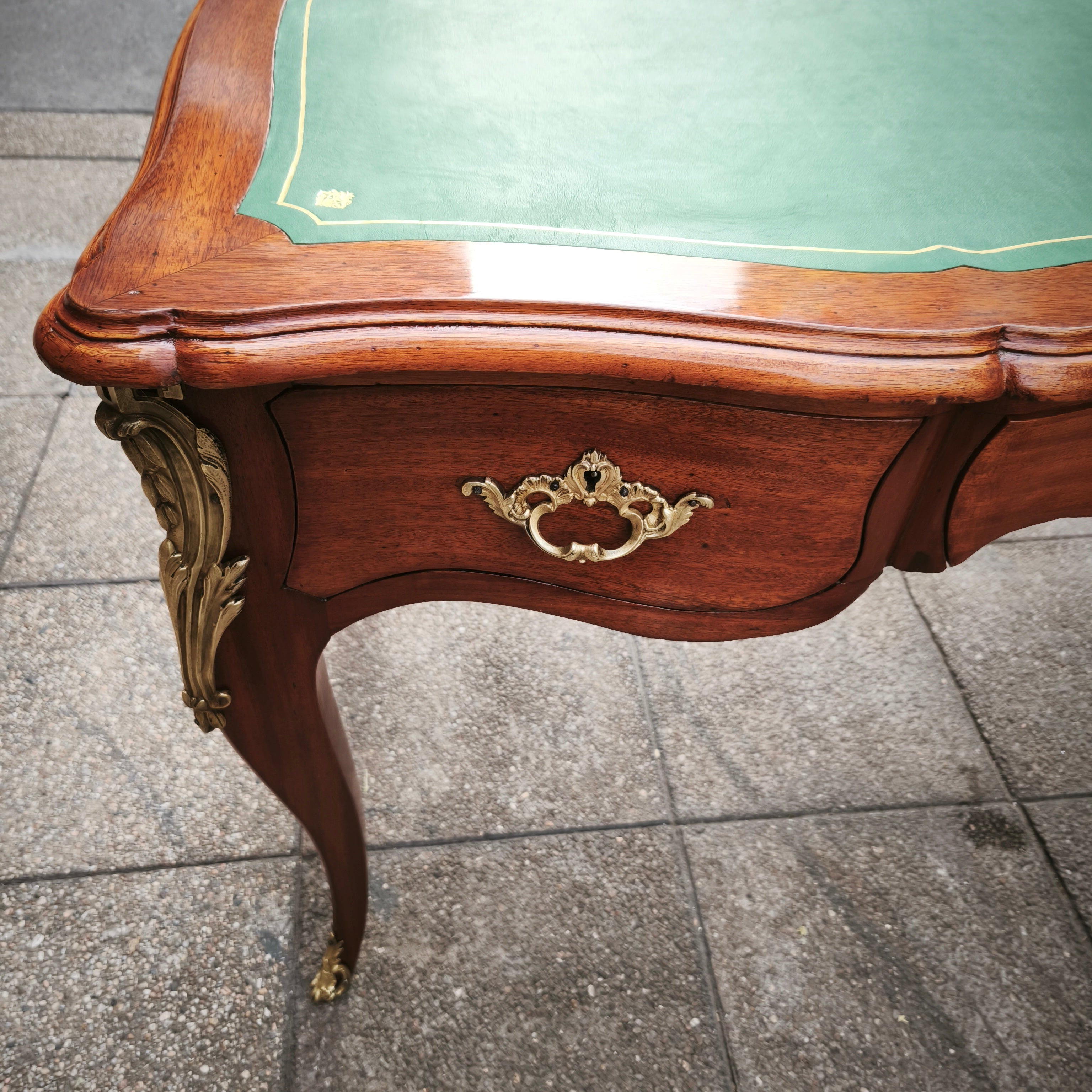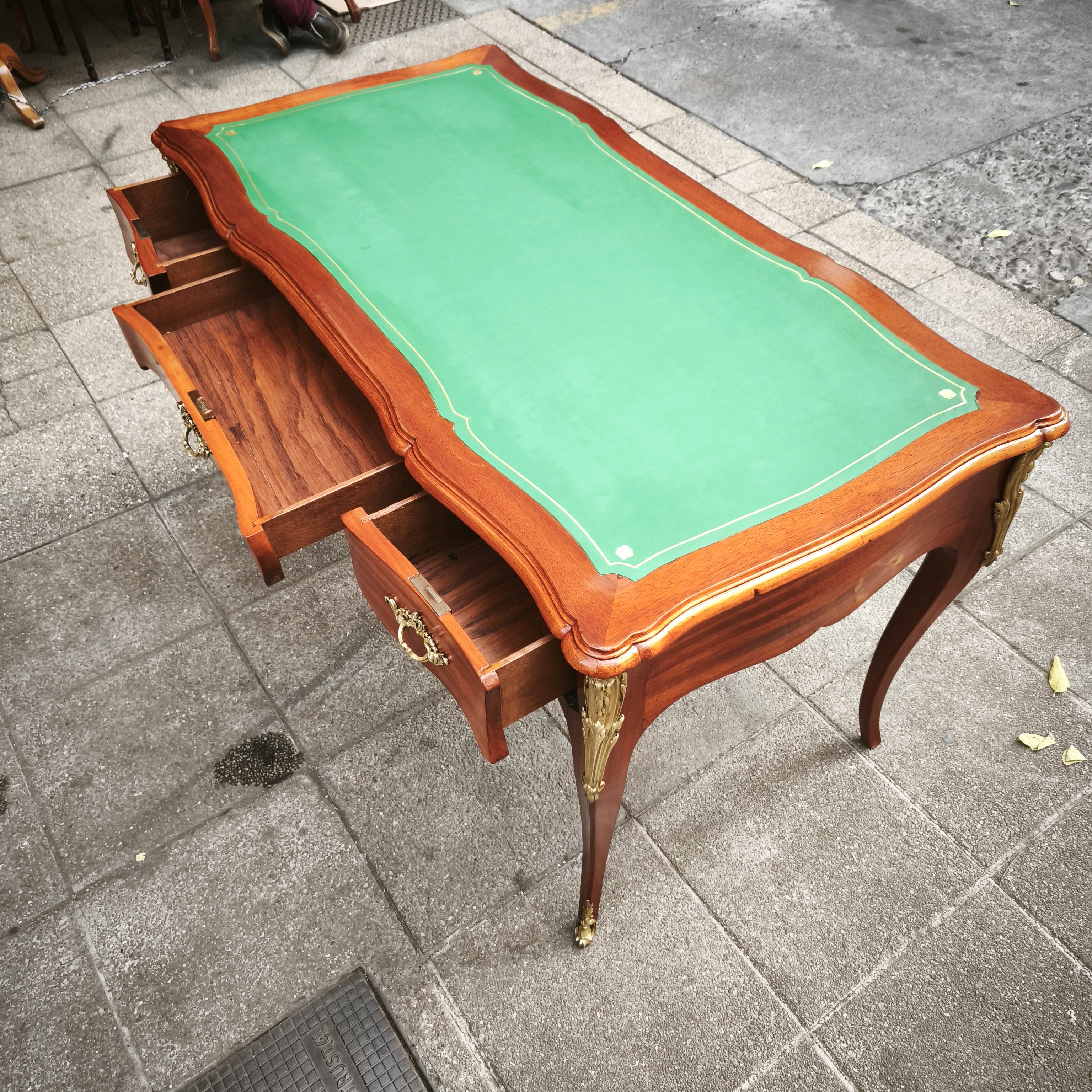 Elegante escritorio francés estilo Luis XV, en caoba rubia con interior de cajones en roble americano, bellas aplicaciones, tacos y tiradores en bronce, y cubierta de cuero verde billar con detalles en dorado. La pieza cuenta con tres cajones de almacenaje.