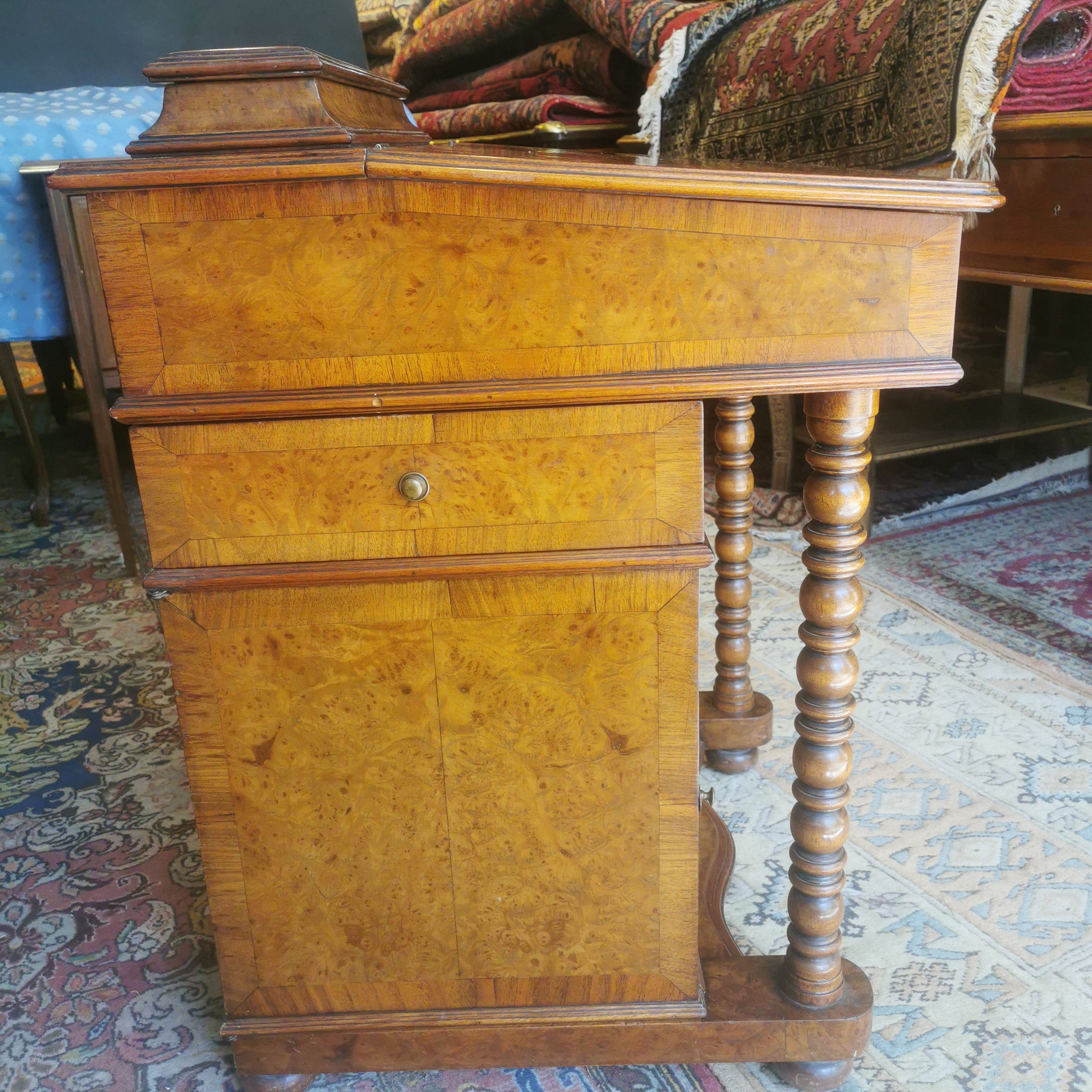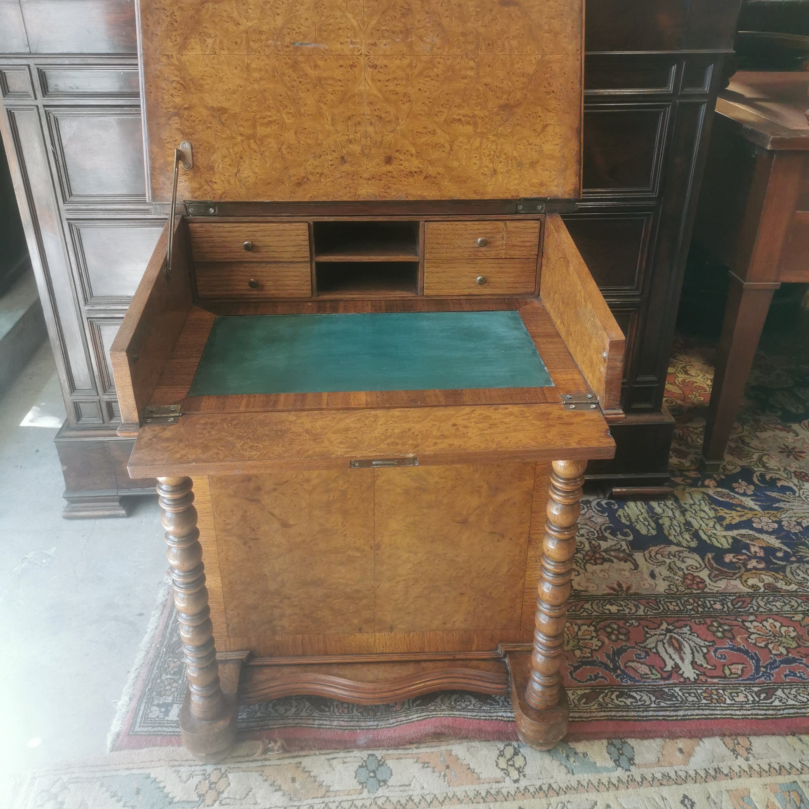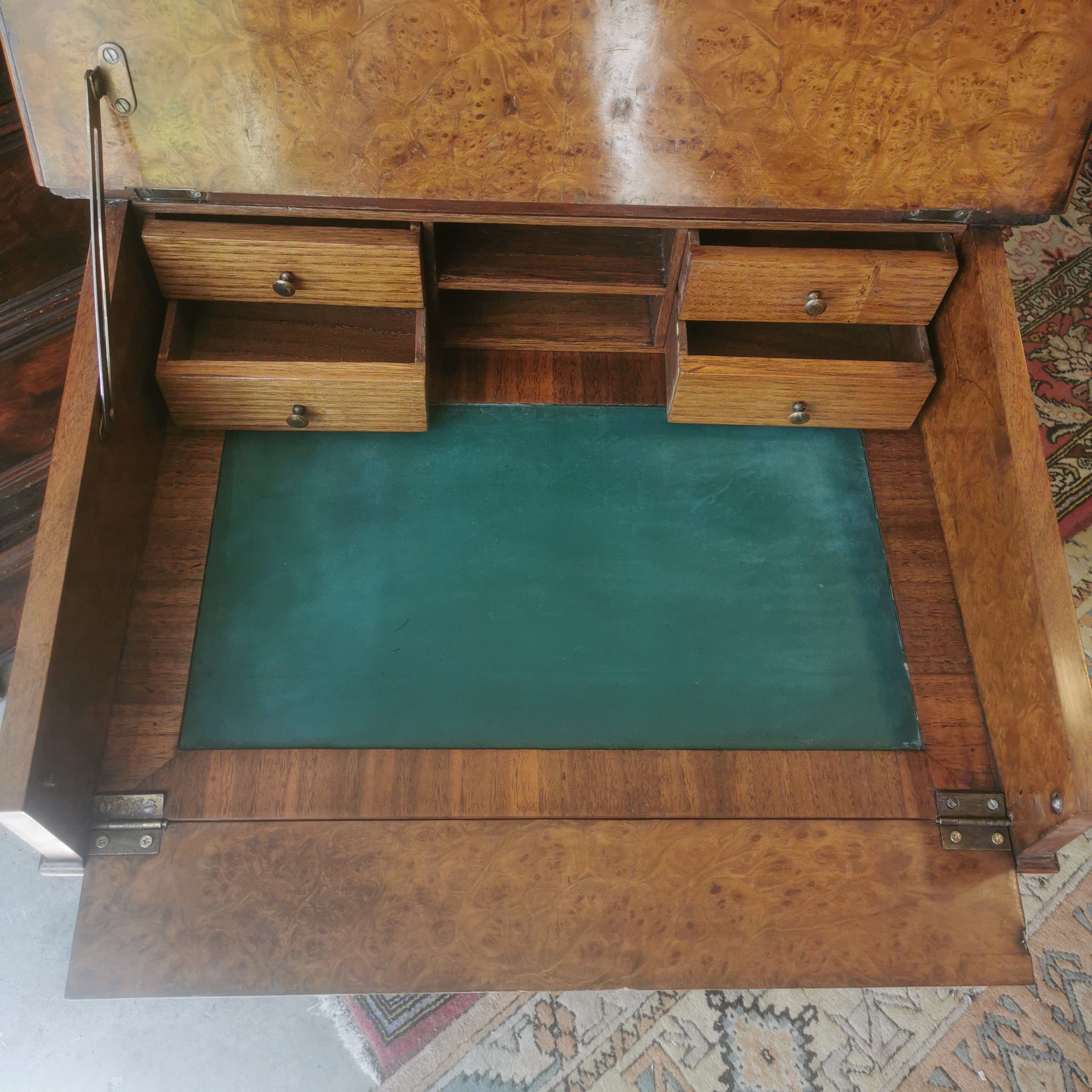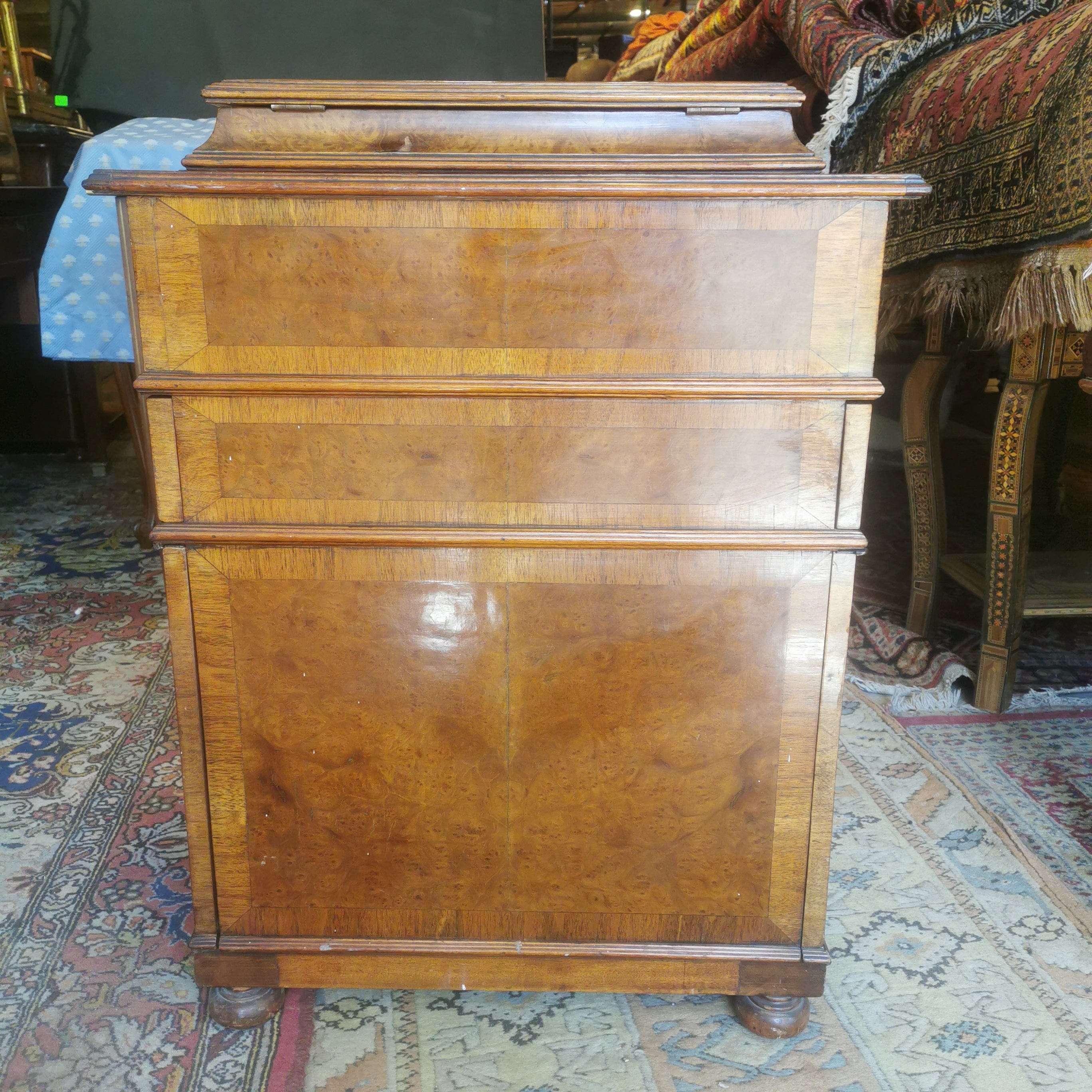Especial escritorio Inglés Davenport, de la década del 50s. De madera de nogal y raíz de nogal. Tiene cuatro cajoncitos interiores más 2 compartimentos pequeños, apertura abatible, cubierta de cuero verde, puertas laterales con 2 y 3 compartimentos cada uno más un gran cajón a cada lado. En la parte superior tiene un portatintero y porta lapicera.