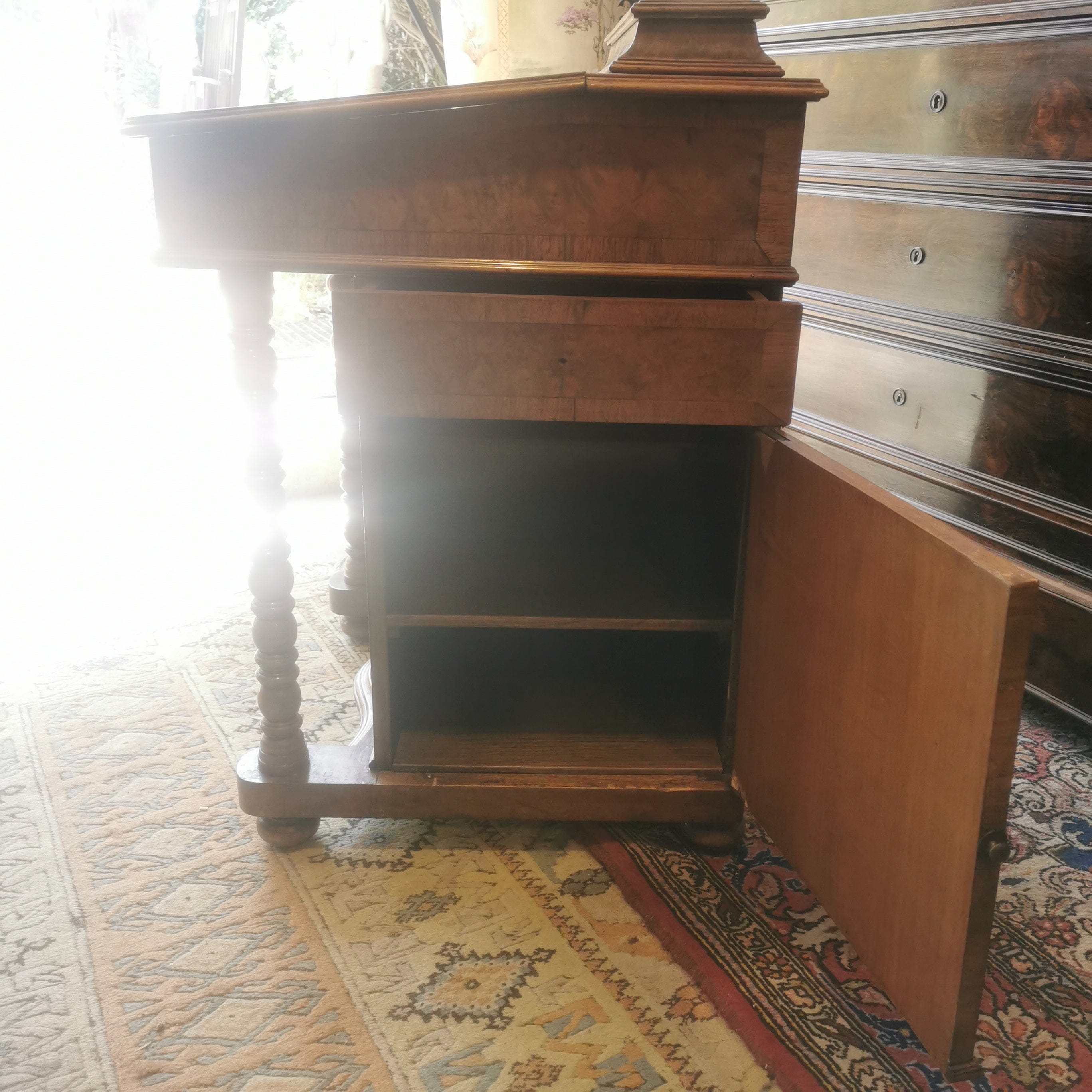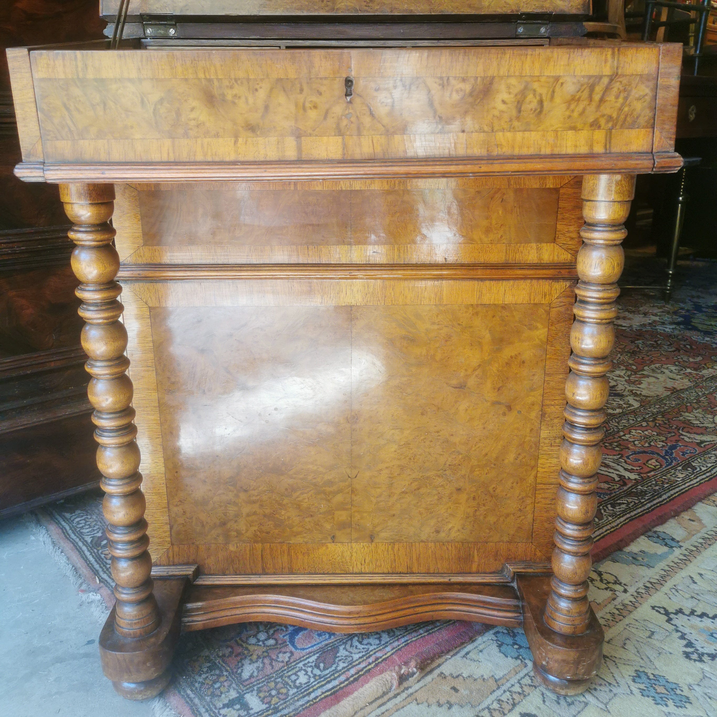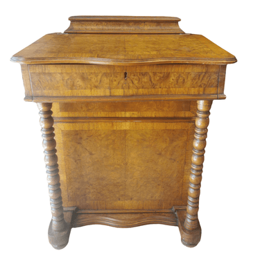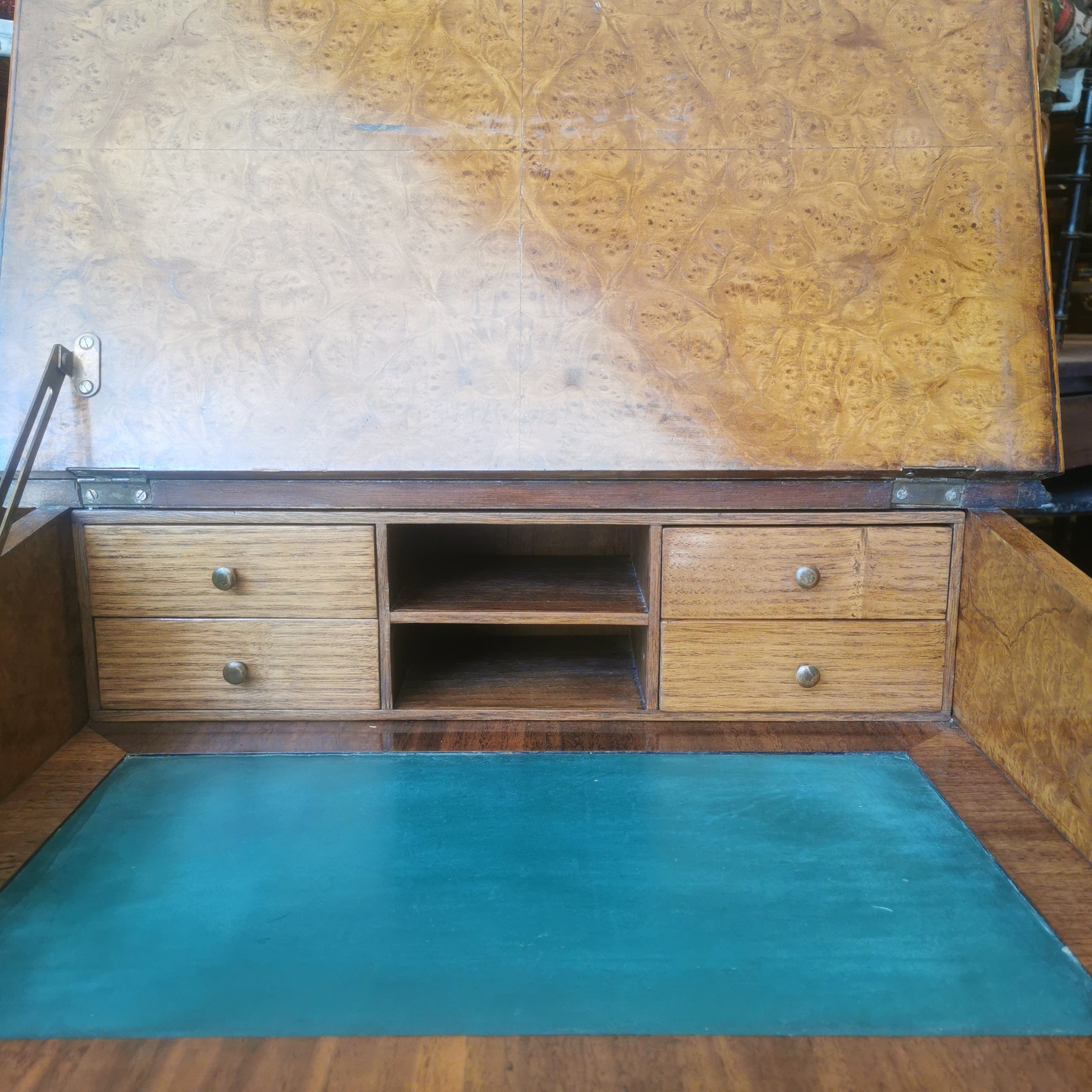 Especial escritorio Inglés Davenport, de la década del 50s. De madera de nogal y raíz de nogal. Tiene cuatro cajoncitos interiores más 2 compartimentos pequeños, apertura abatible, cubierta de cuero verde, puertas laterales con 2 y 3 compartimentos cada uno más un gran cajón a cada lado. En la parte superior tiene un portatintero y porta lapicera.