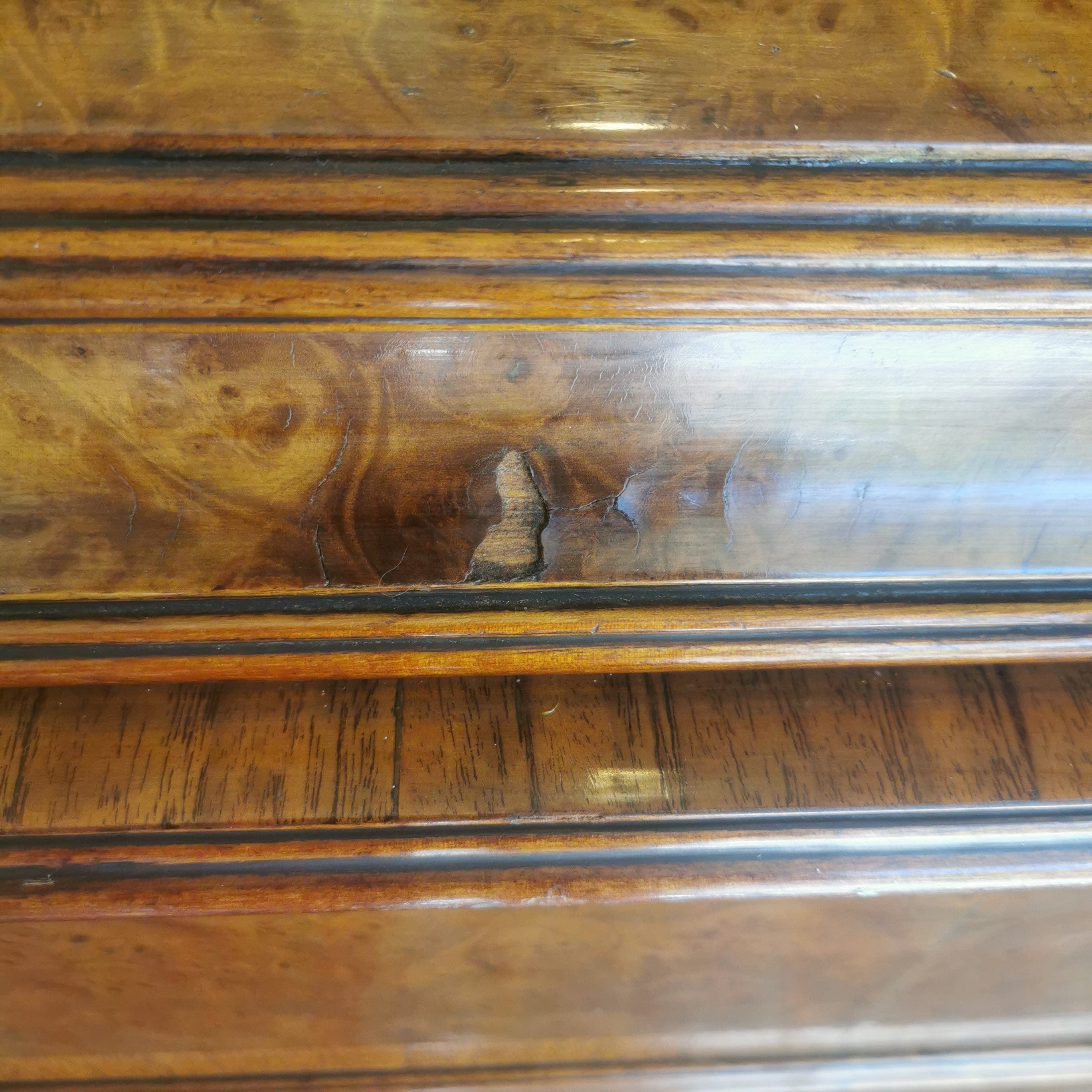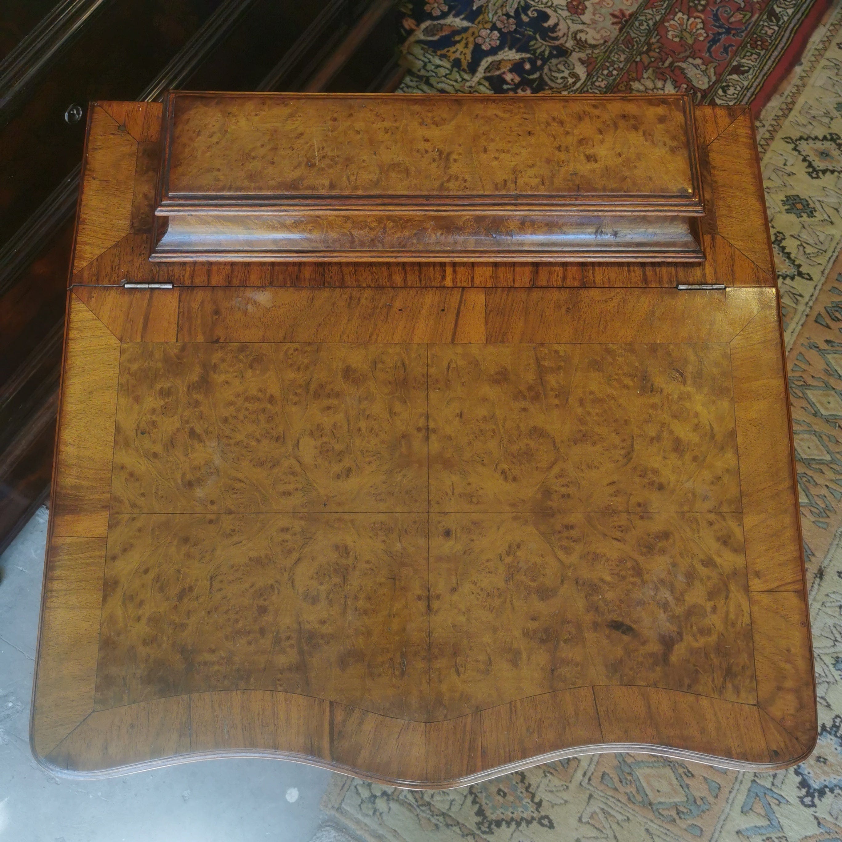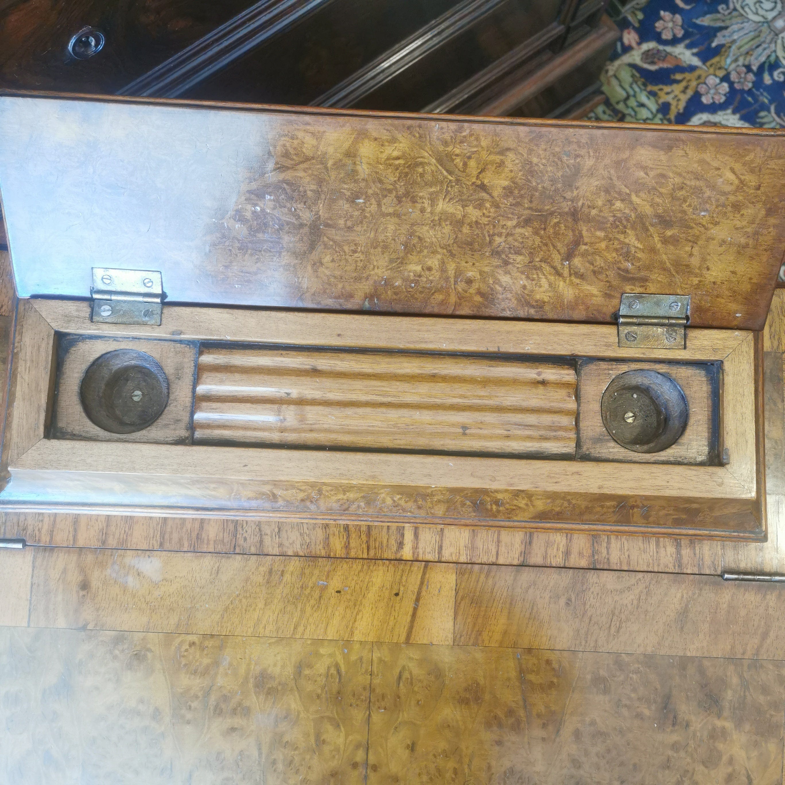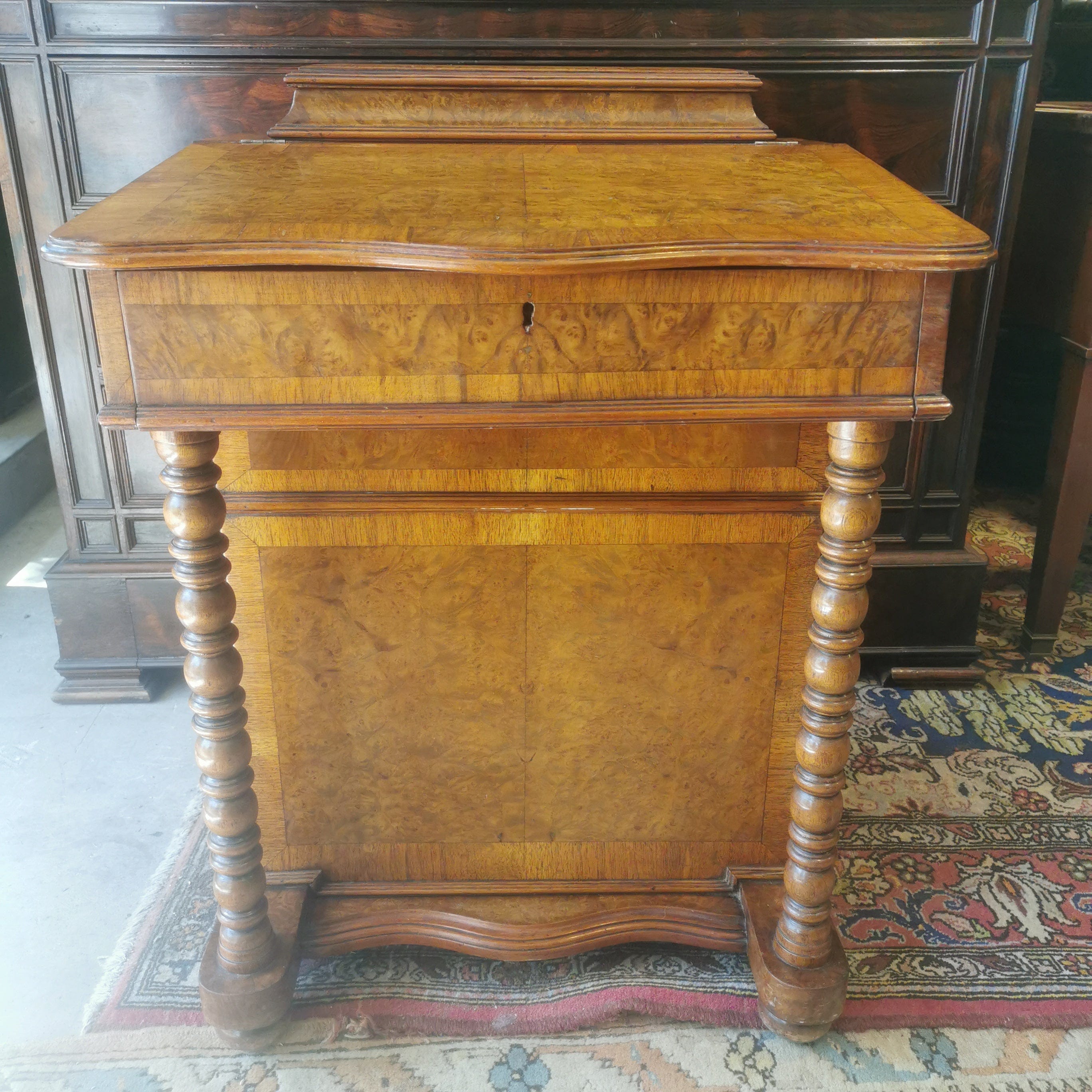 Especial escritorio Inglés Davenport, de la década del 50s. De madera de nogal y raíz de nogal. Tiene cuatro cajoncitos interiores más 2 compartimentos pequeños, apertura abatible, cubierta de cuero verde, puertas laterales con 2 y 3 compartimentos cada uno más un gran cajón a cada lado. En la parte superior tiene un portatintero y porta lapicera.