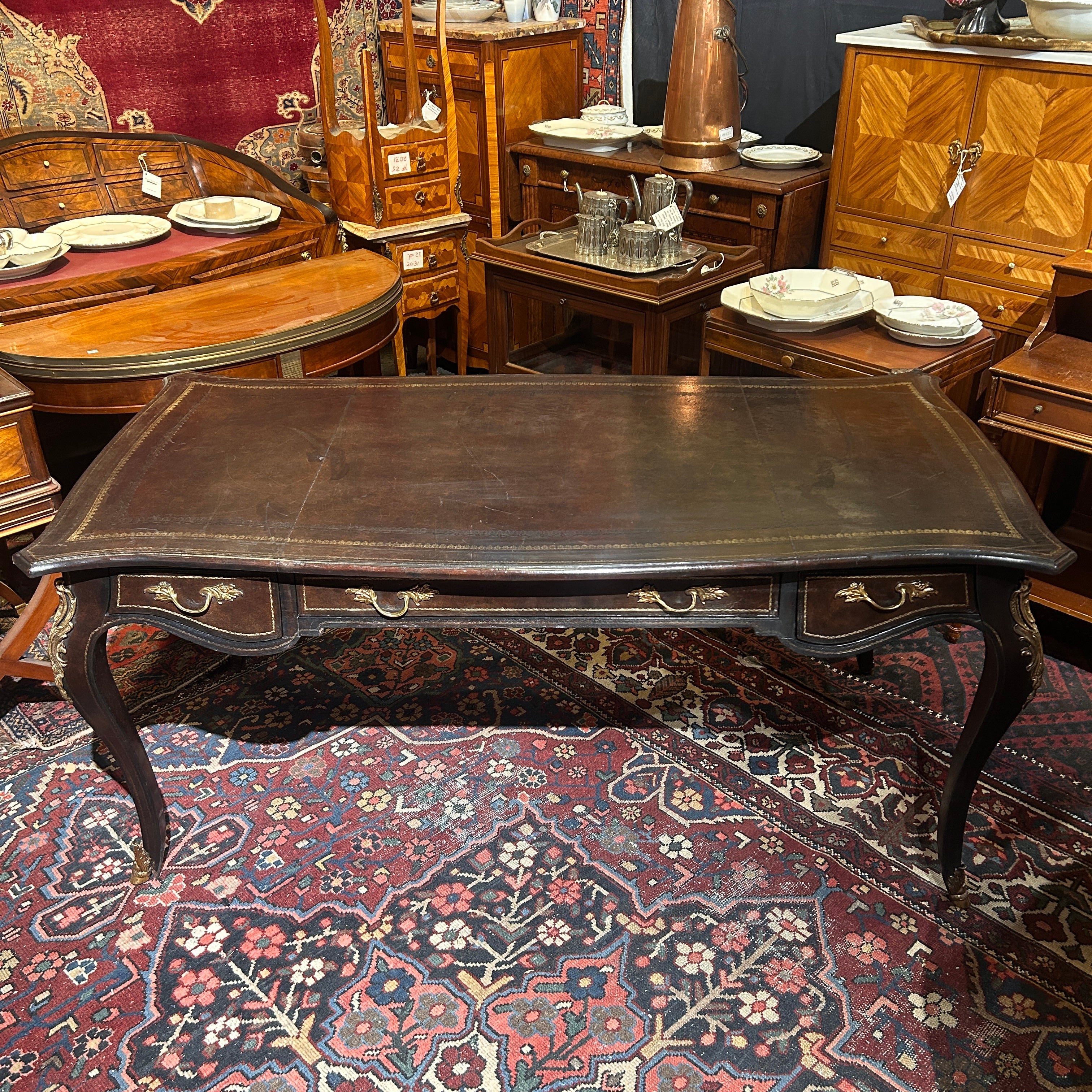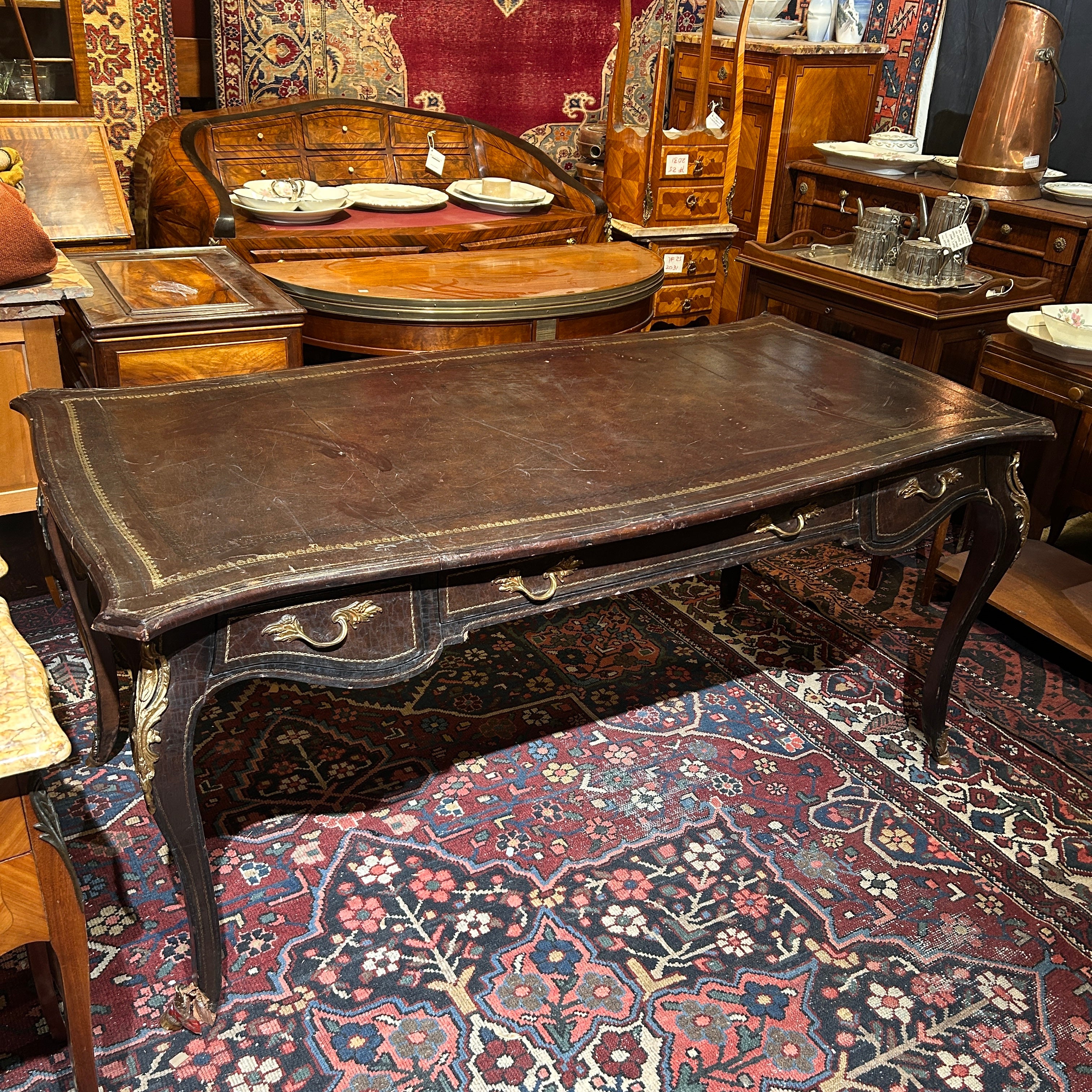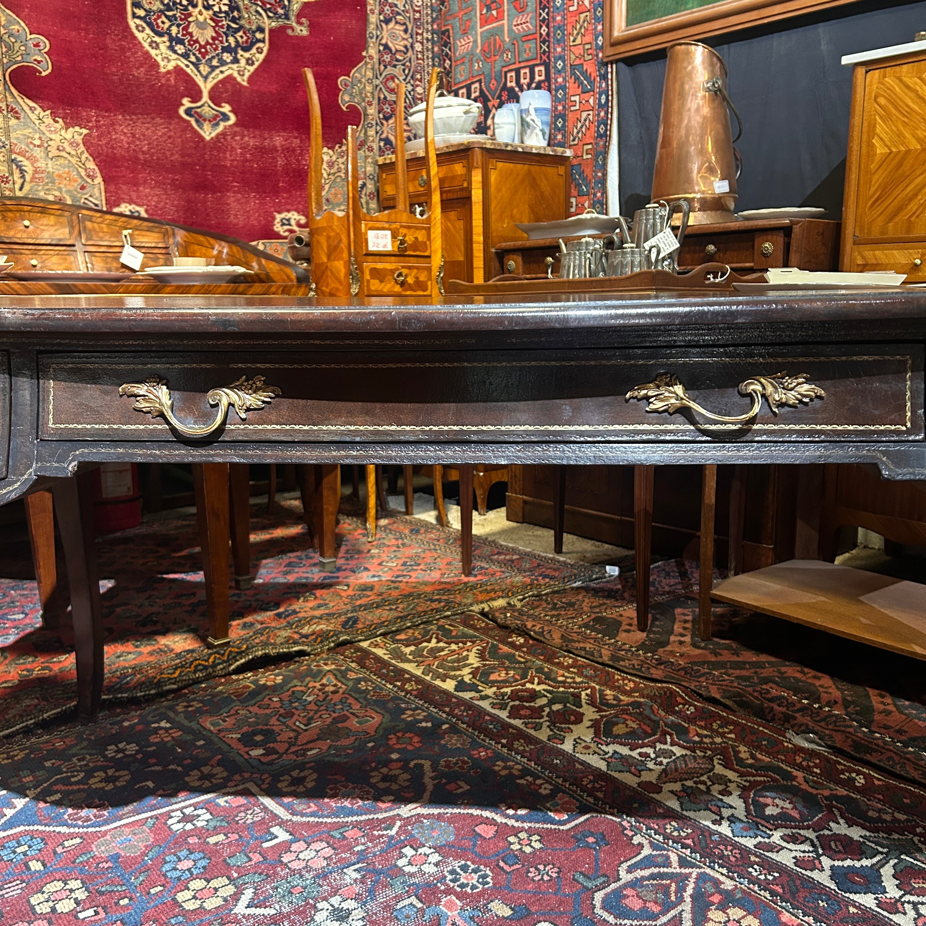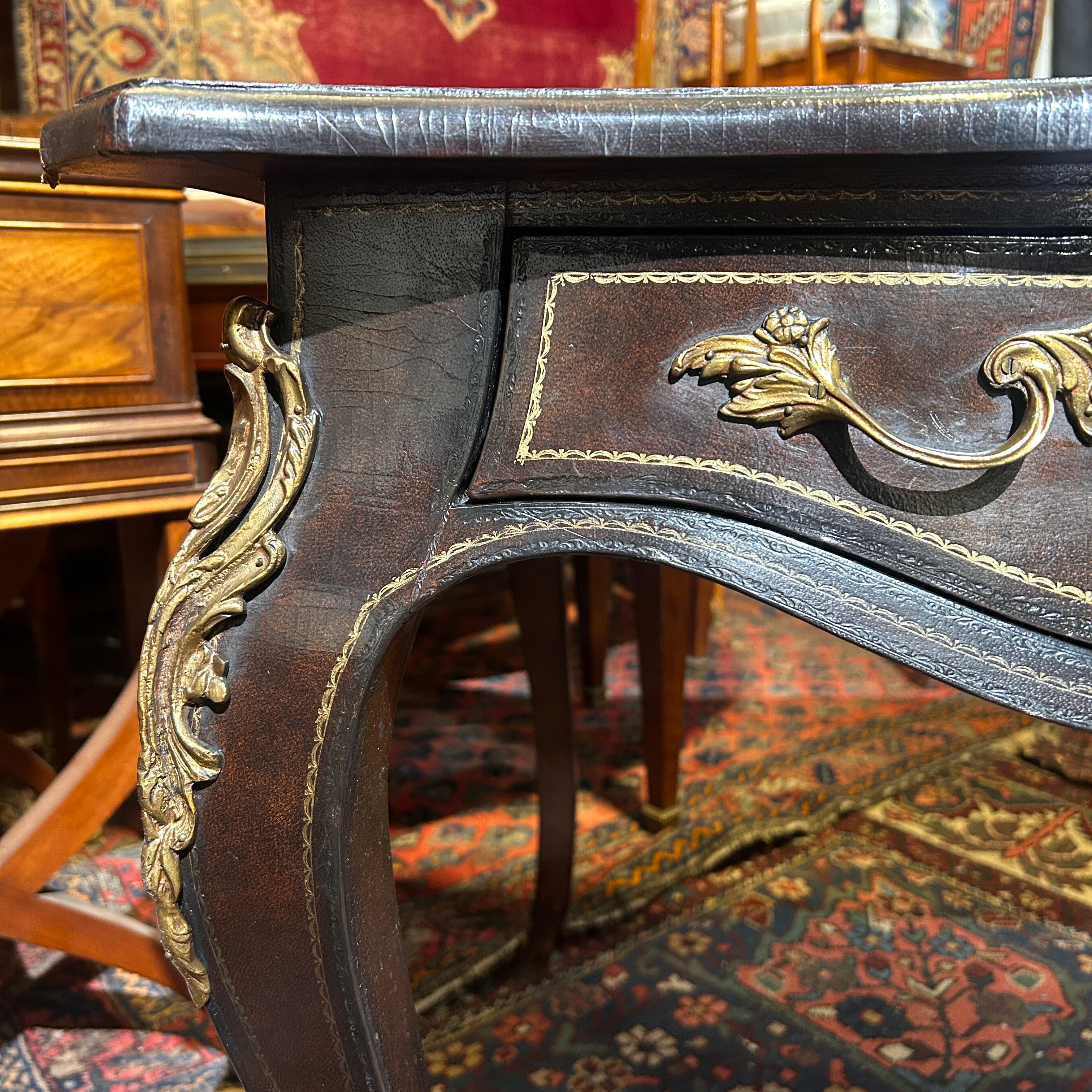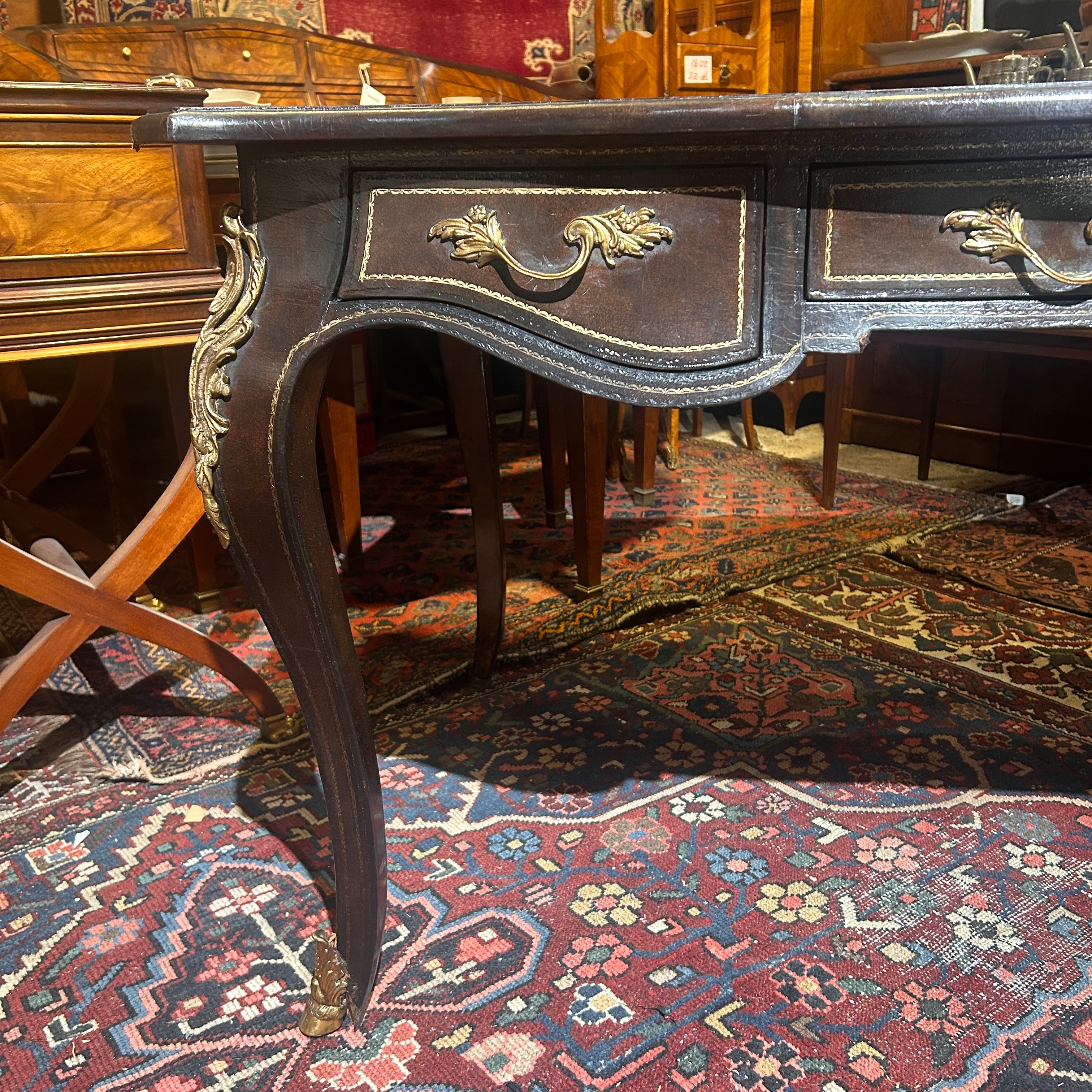 Elegante escritorio bureau-plat francés contemporáneo estilo Luís XV, con cubierta de cuero extendida y enchapado en su totalidad en cuero. Tiene dos cajones esquineros y un profundo cajón central todos con tiradores de bronce y tres cajones falsos posteriores. Cuenta con bellas aplicaciones en bronce en sus cuatro patas y esquinas superiores. Dentro de uno de sus cajones se encuentra la firma del atelier francés Maitland Smith. Es un precioso mueble fabricado la segunda mitad del siglo XX.
