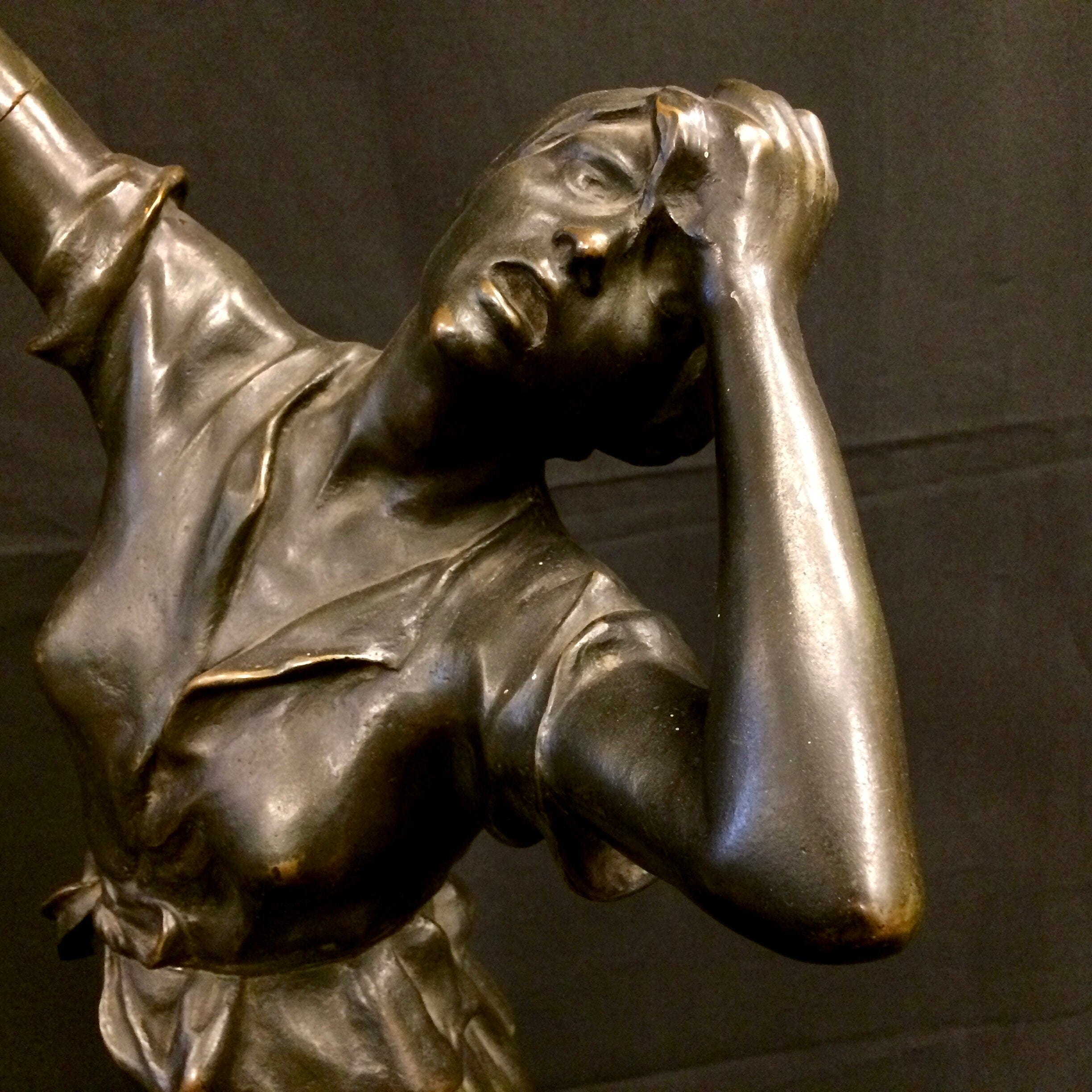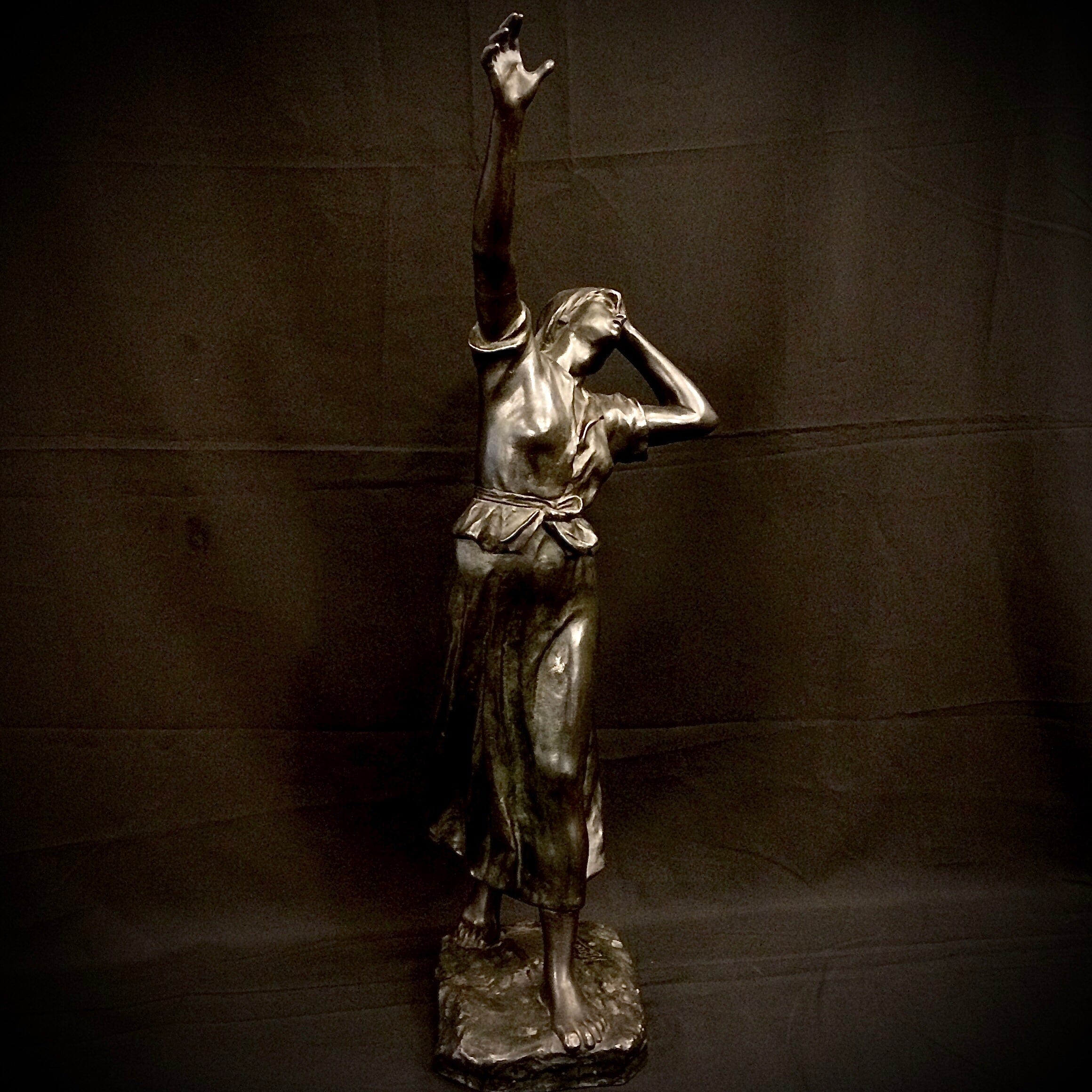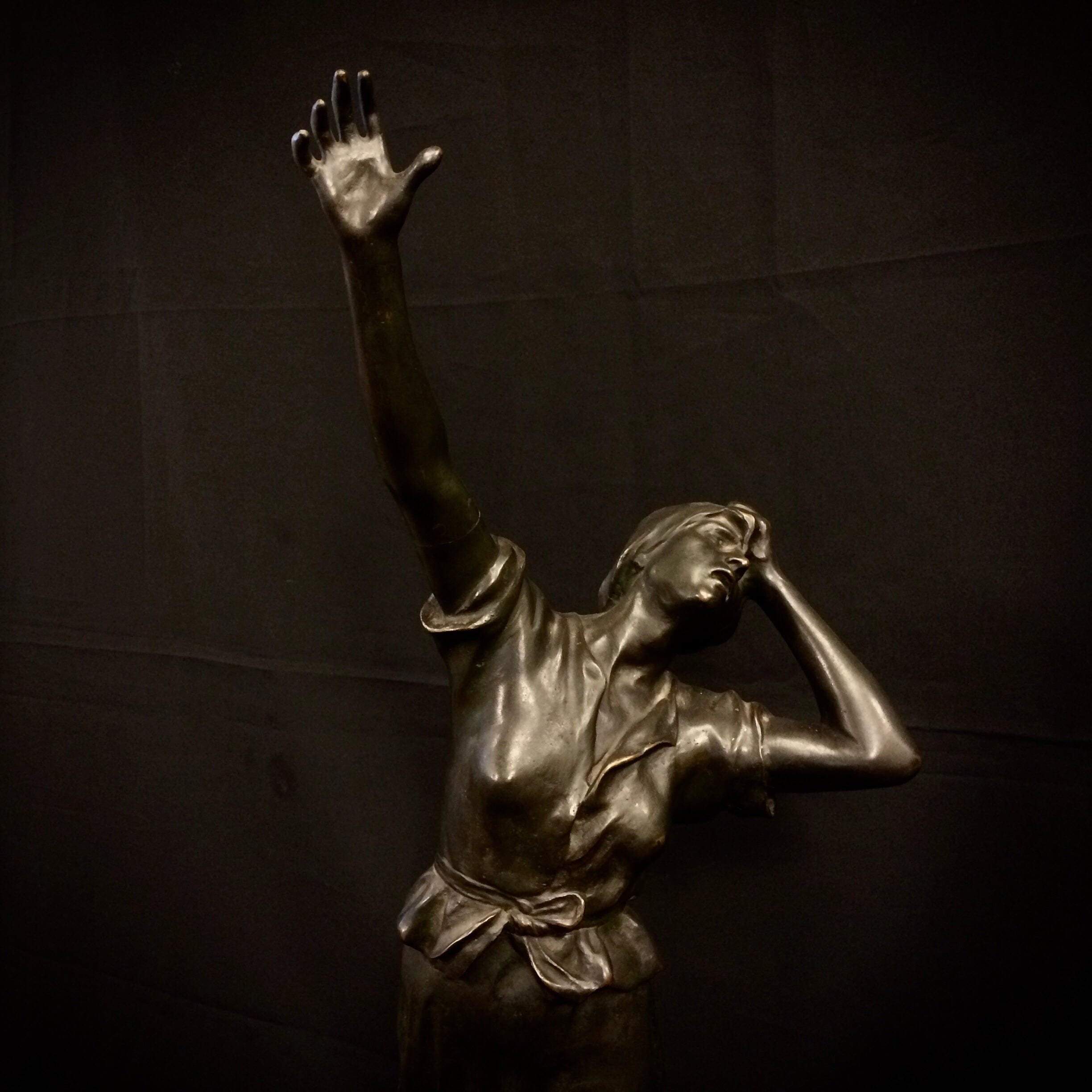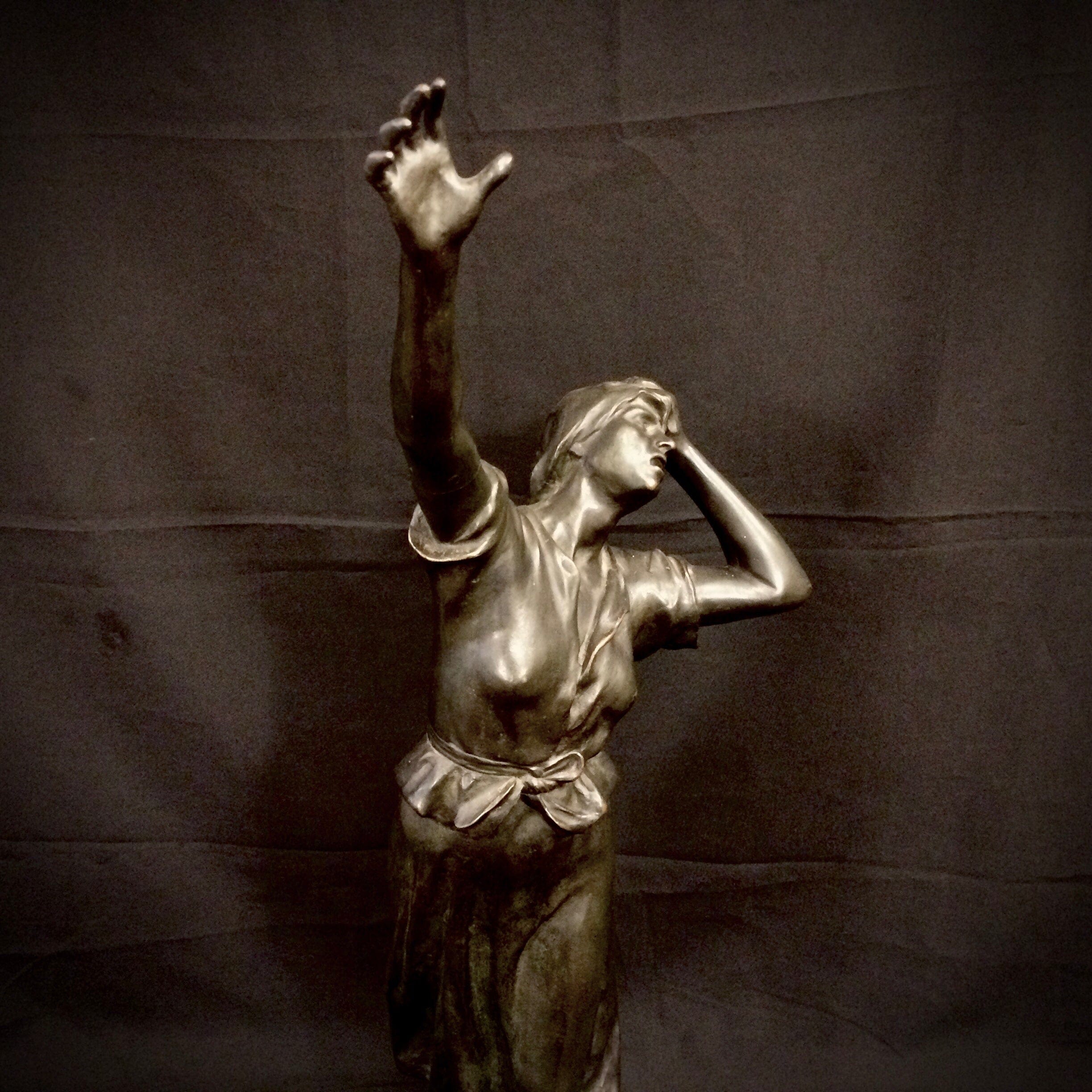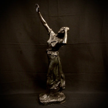 Escultura de bronce. En una expresiva línea diagonal captura bellamente el brazo extendido de la mujer. Firmada por el artista.