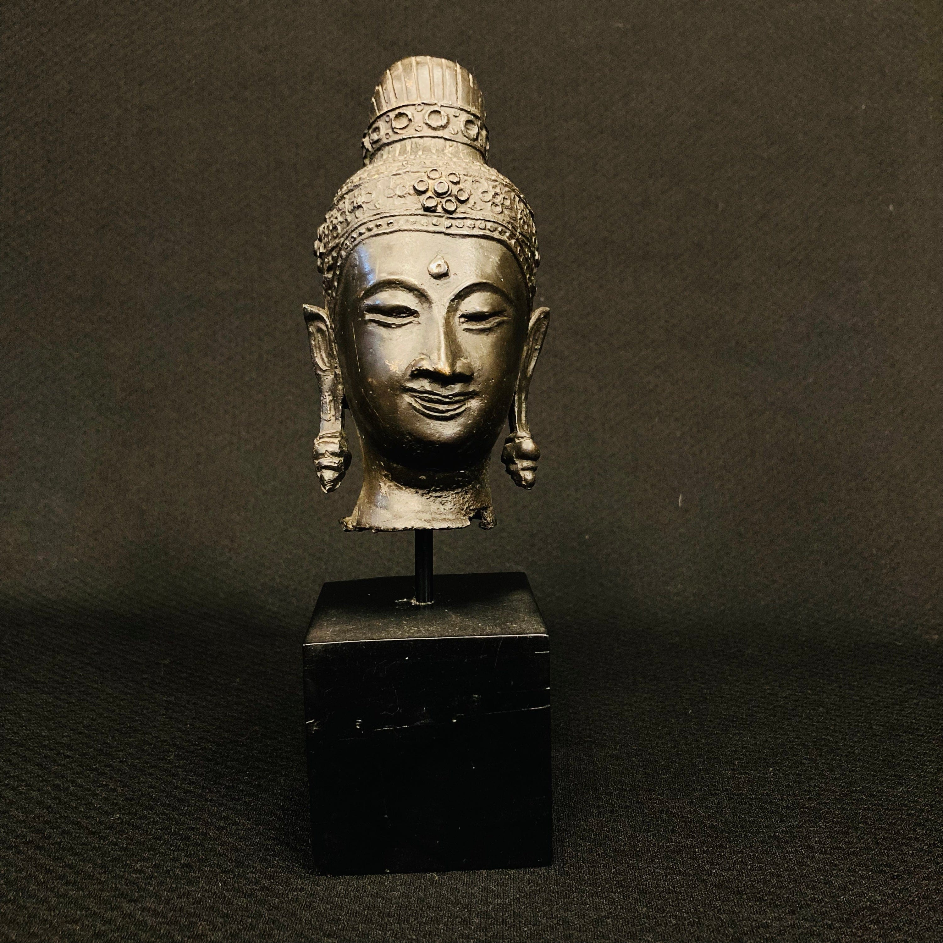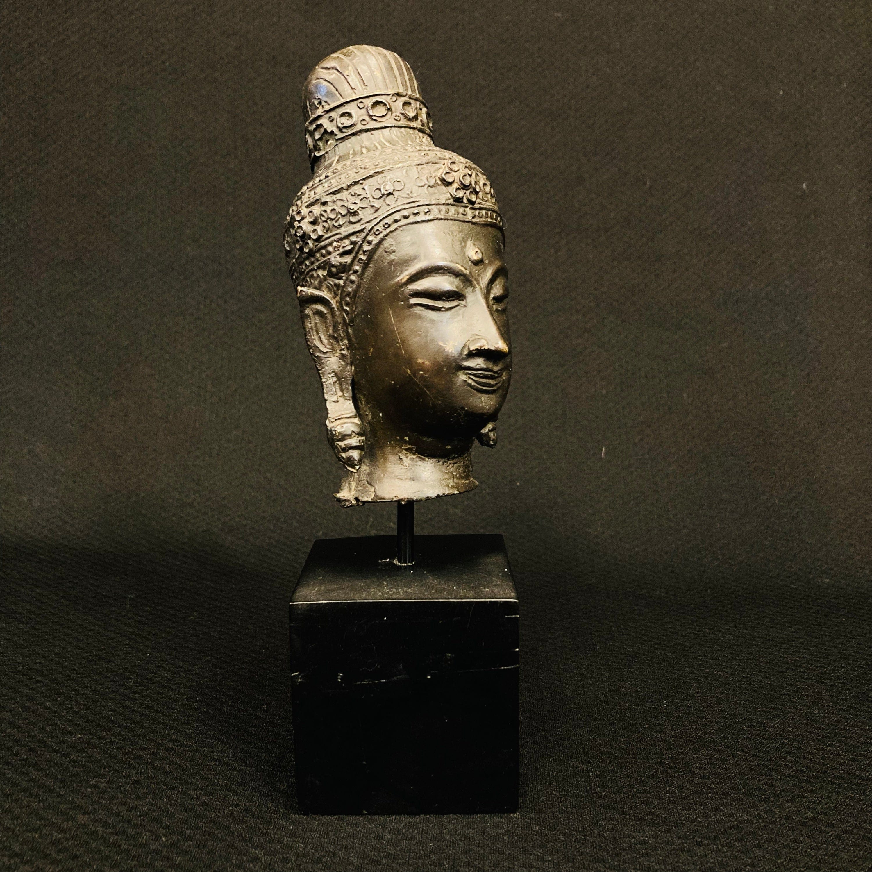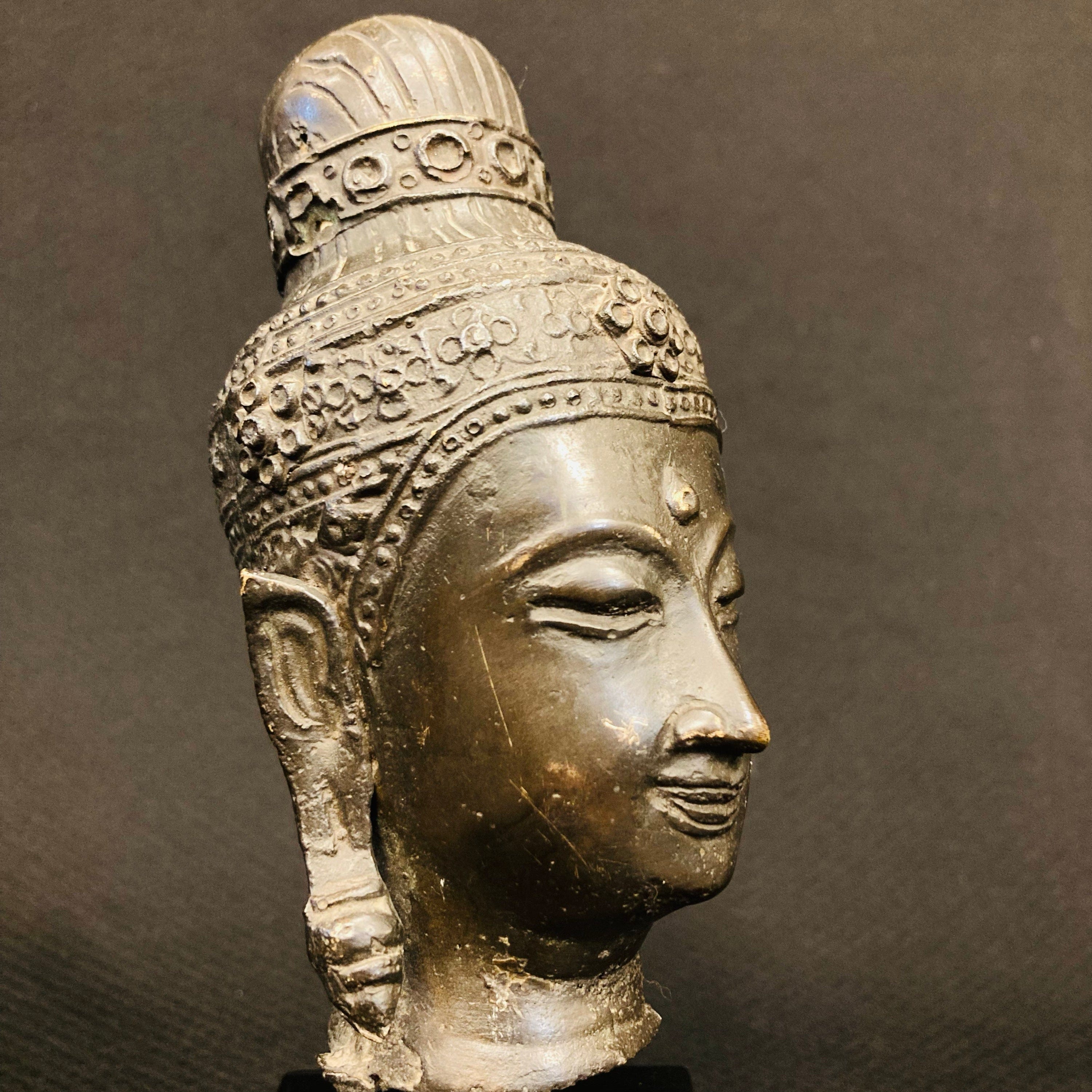 Escultura de rostro hindú. Bellos detalles trabajados en bronce policromado. Base de madera.