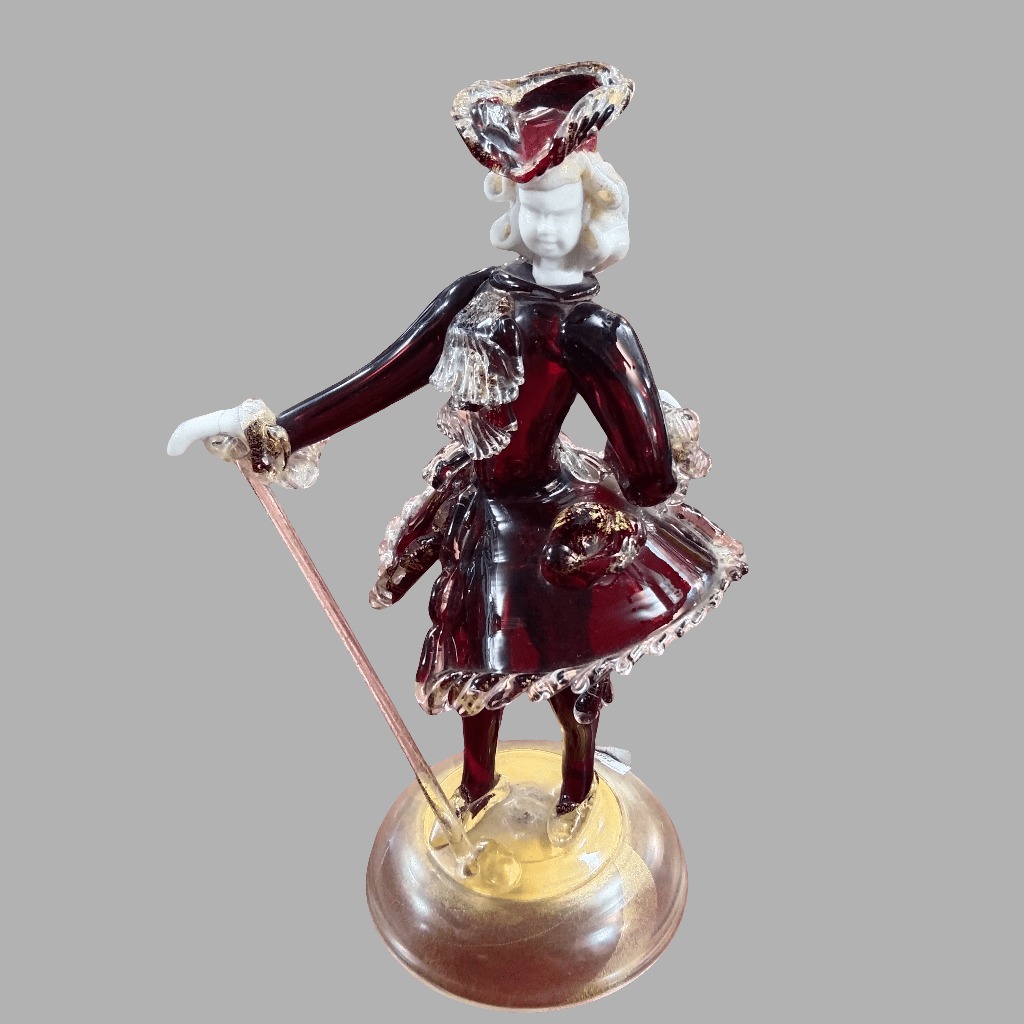Bella figura de cristal Murano representando en este tradicional estilo a un barón de la corte con un llamativo atuendo con volúmen y un bastón. La pieza tiene detalles en porcelana, como sus manos y su cabeza, junto a tonos rojizos y dorados en su cristal. La pieza está sobre una base de vidrio opaco con detalles dorados.