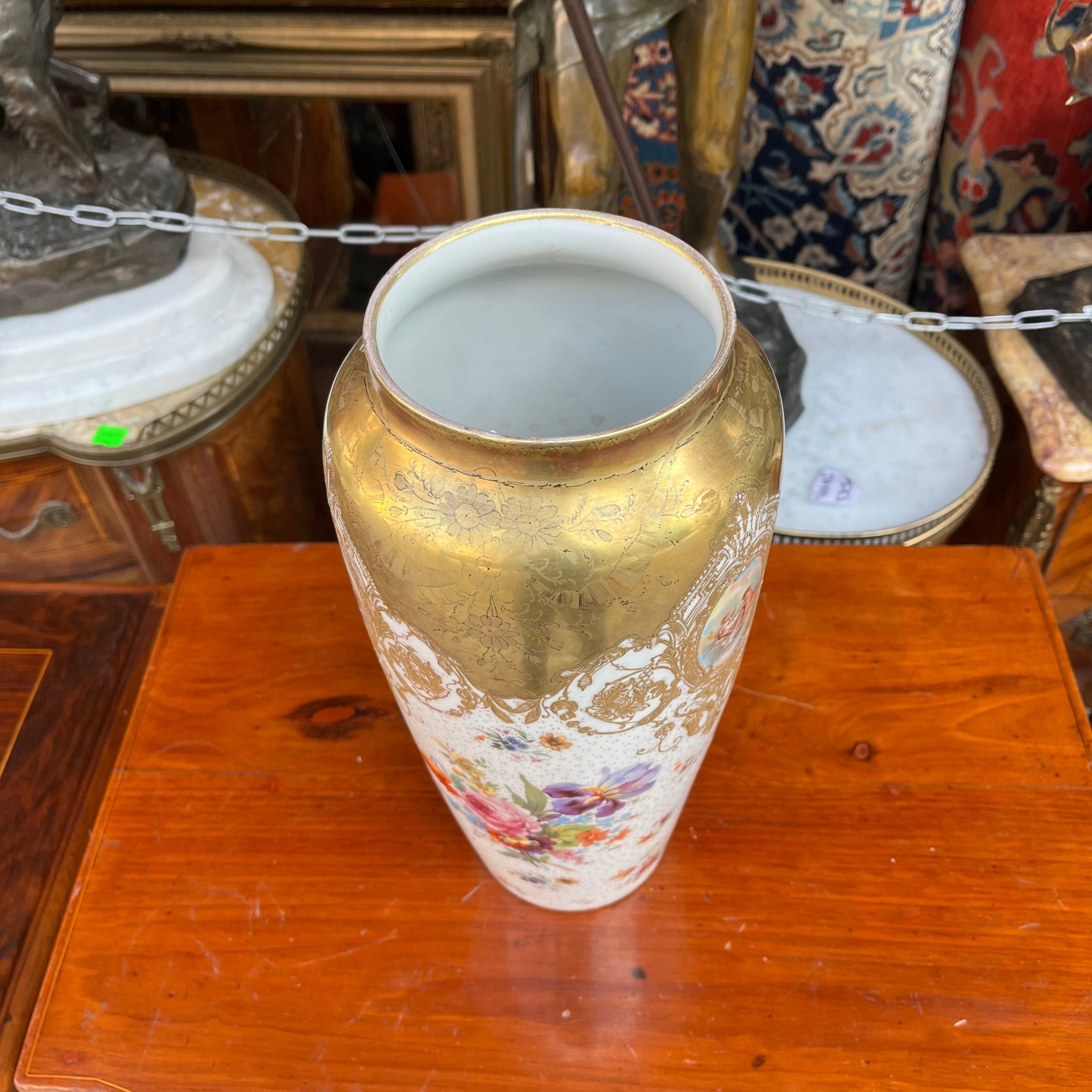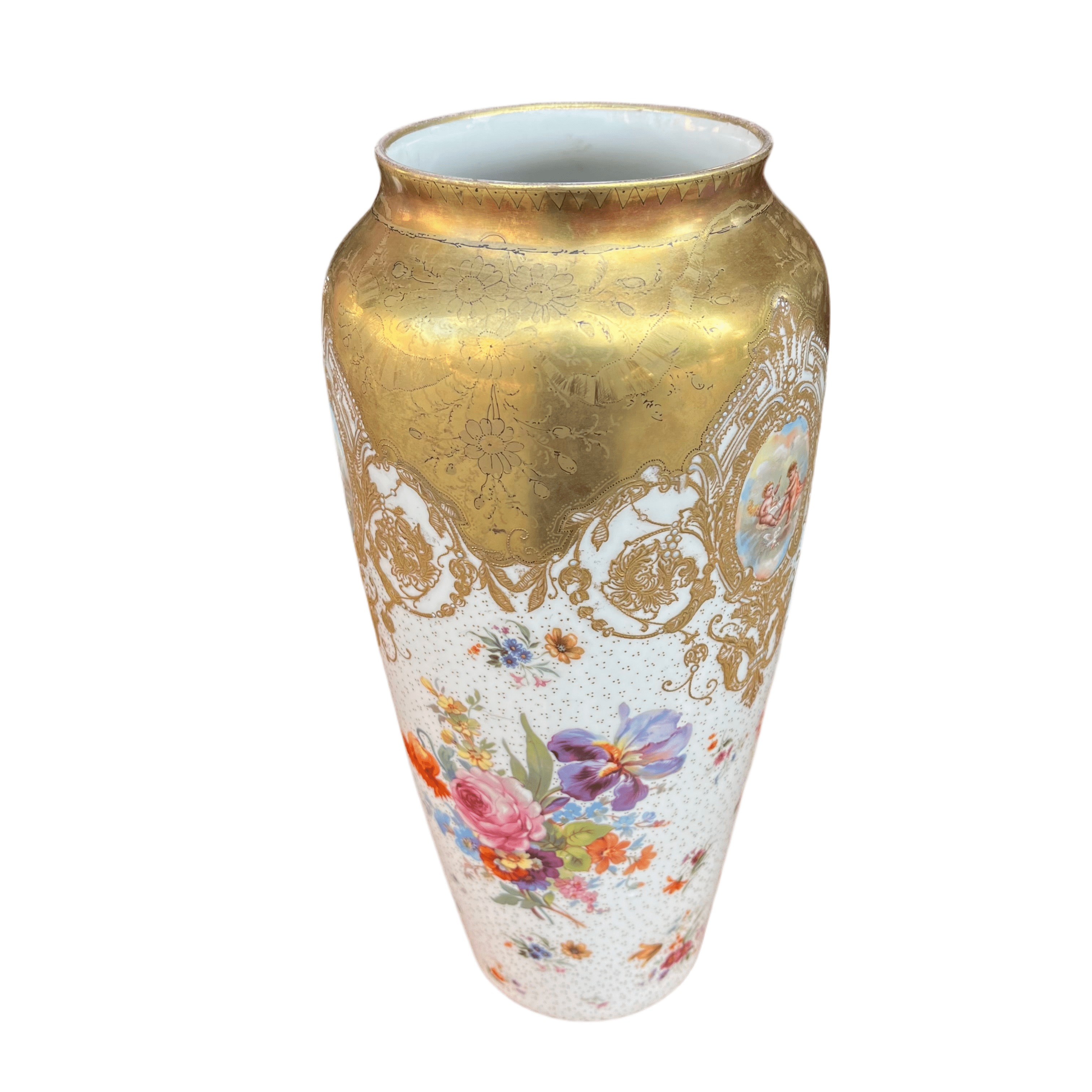 Hermoso florero de origen francés estilo Sevrès, con decoración policrómada dorada, con diseños florales y querubines.