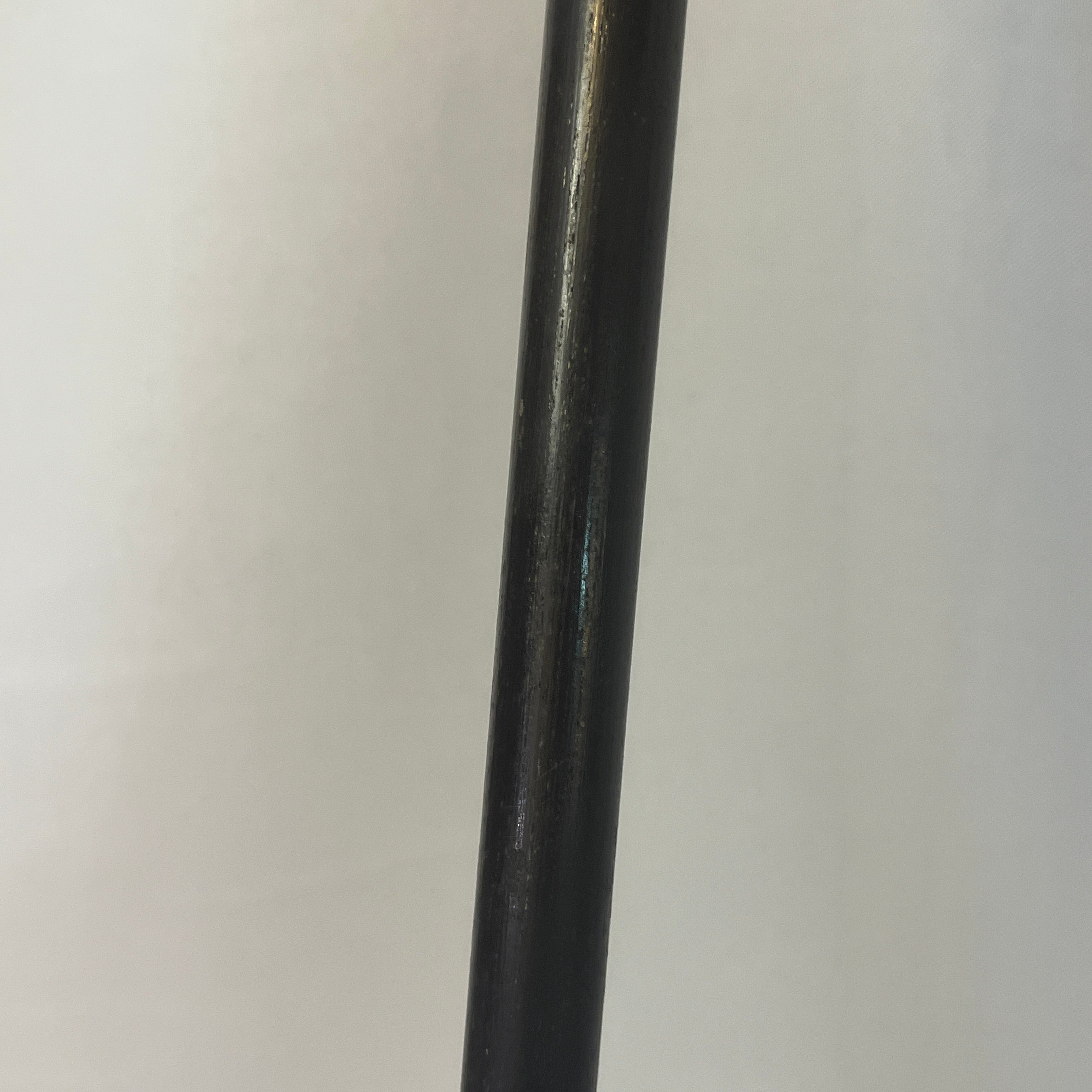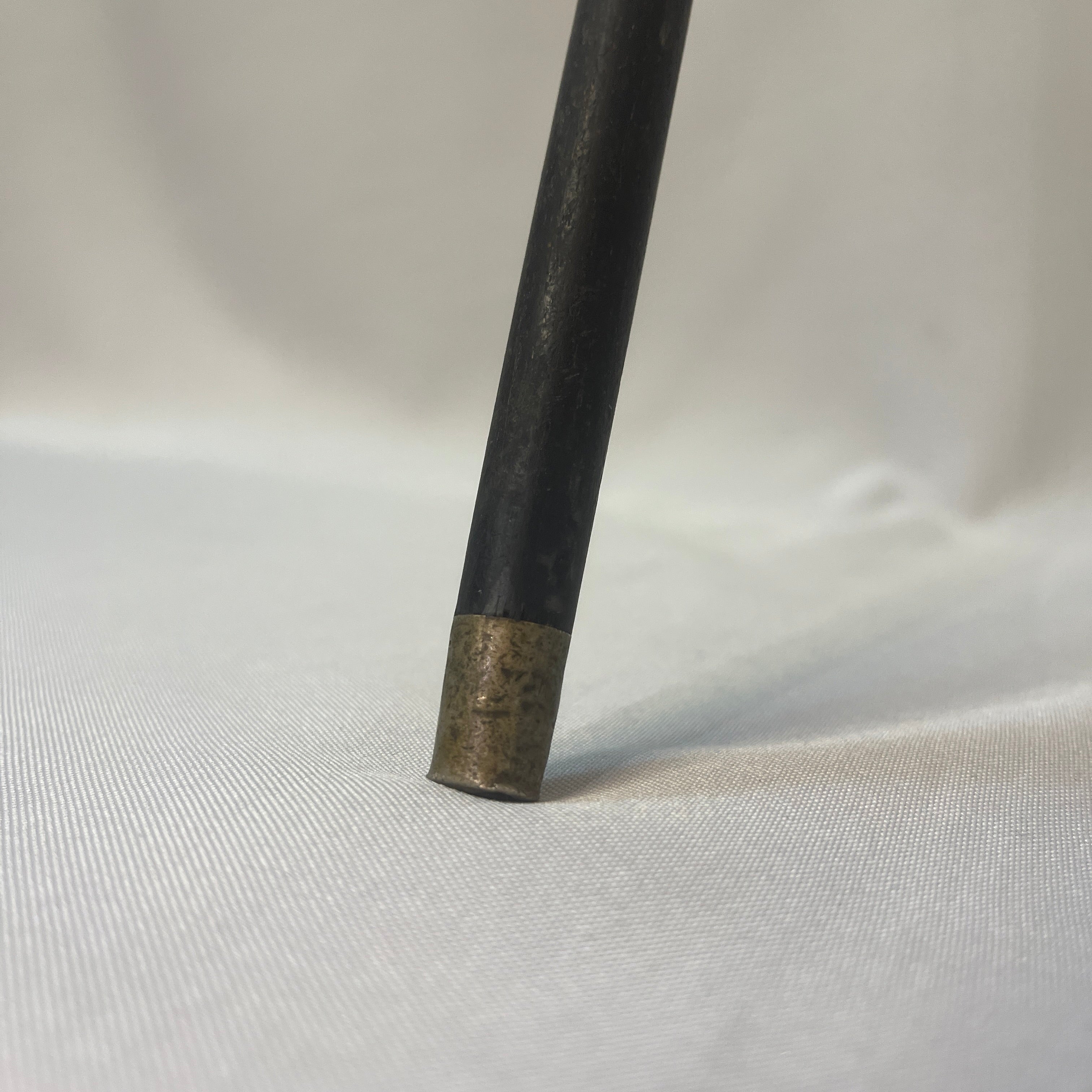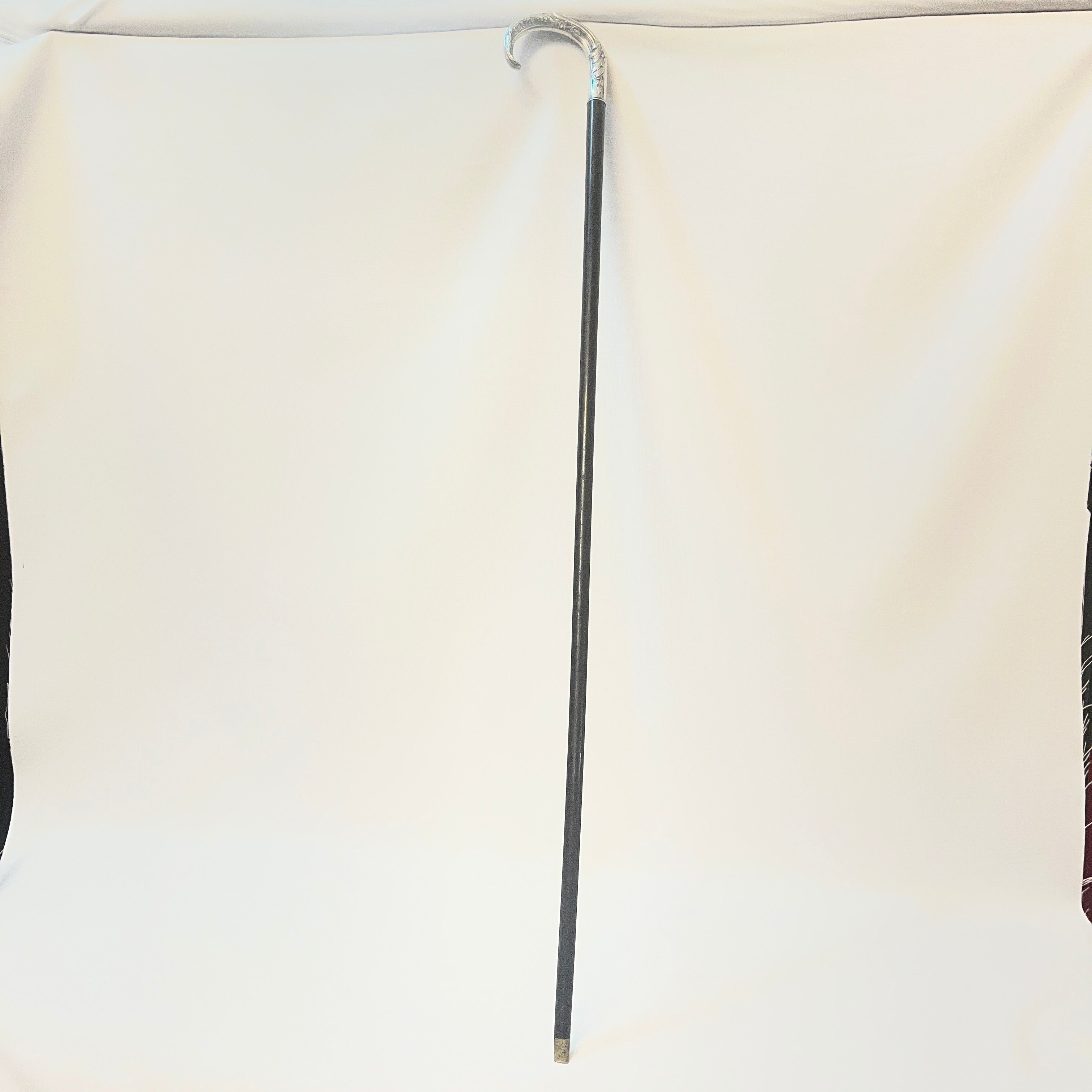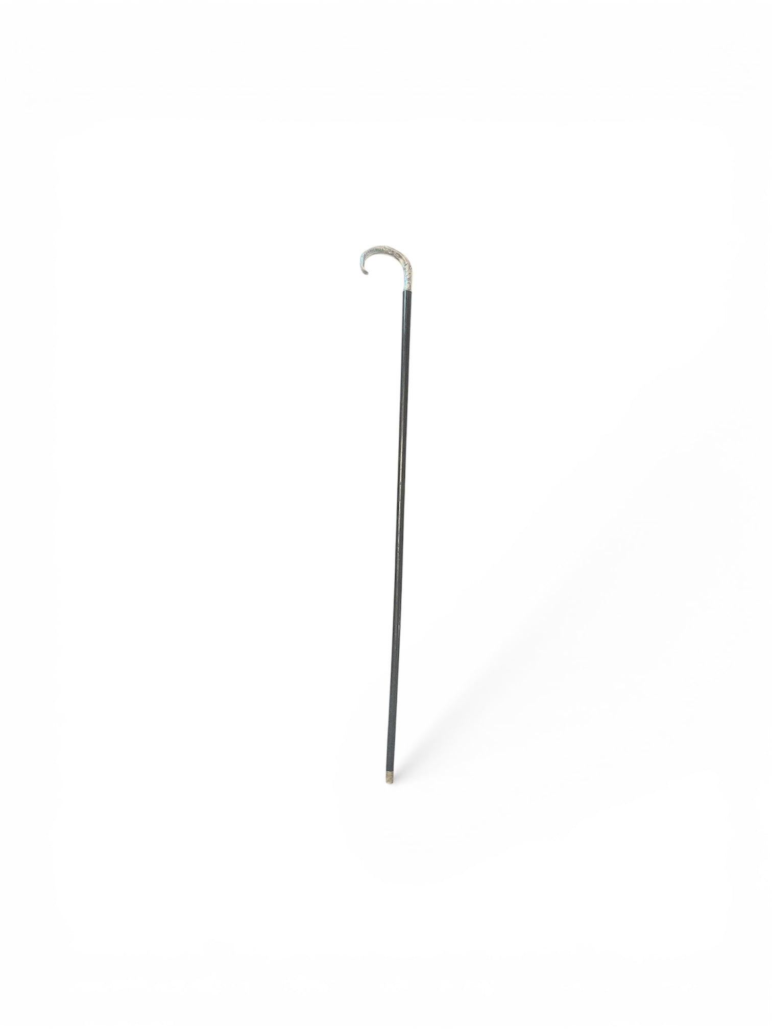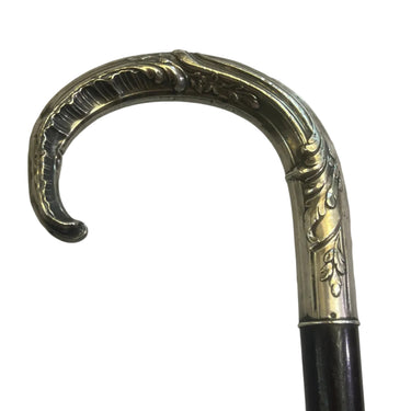 Elegante batón de paseo elaborado en madera lacada, con empuñadura curva de metal finamente decorada con delicados grabados. presenta puntero metálico en la base, elemento característico de los bastones clásicos que aporta durabilidad y estabilidad.
