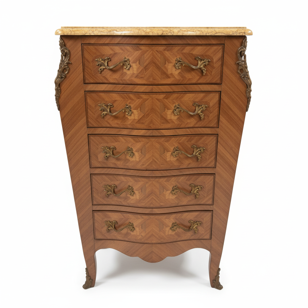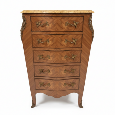 Cómoda en madera natural que abre con tres cajones; tiradores en latón; etiqueta moderna “MARQUANT”. Francia, fabricación contemporánea