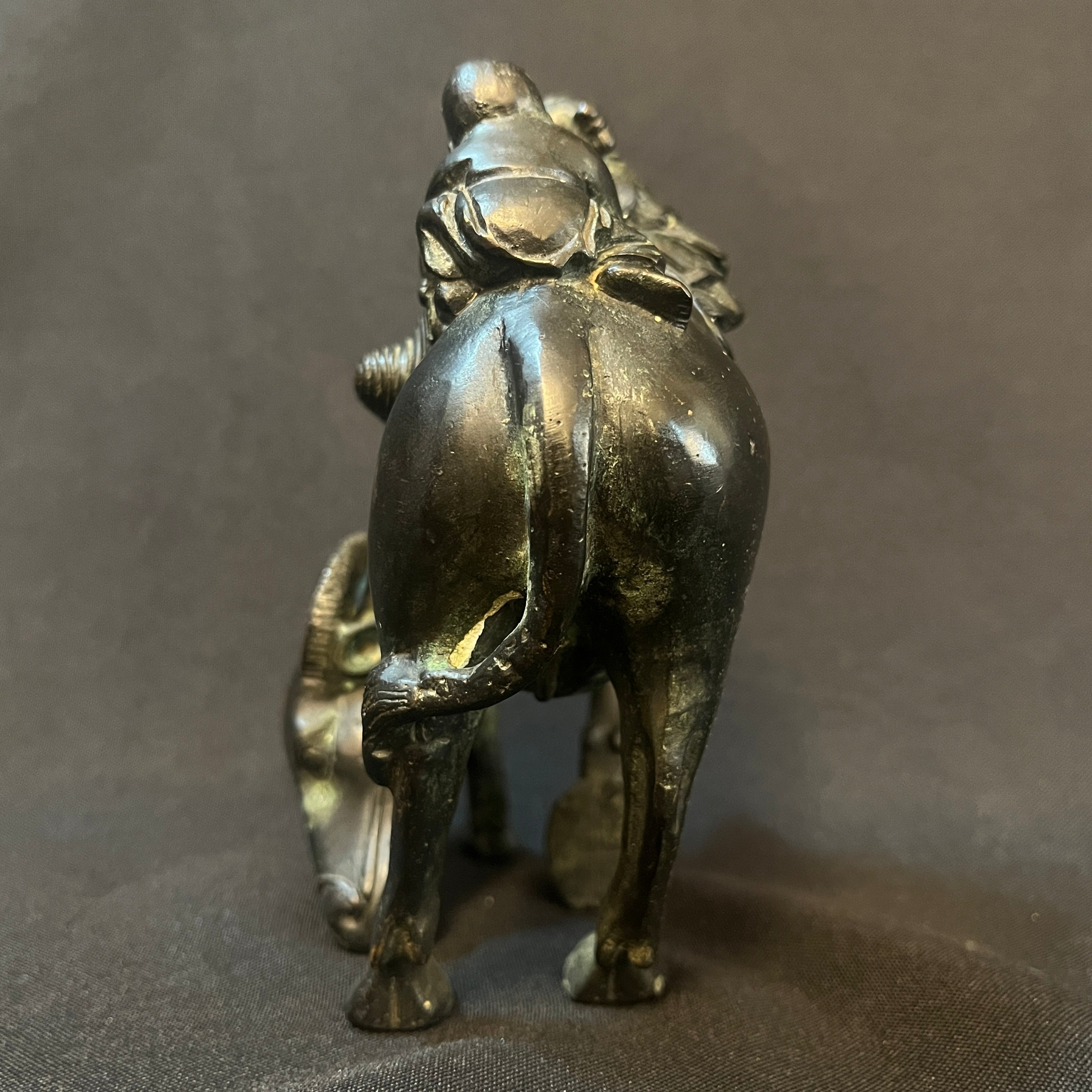 Bella escultura china de bronce tallado y patinado, representando a dos niños montados sobe un búfalo. Es una figura tradicional en la artesanía china, siendo esta temática representada en distintos materiales y estilos. La pieza se encuentra en buen estado con los signos propios de su uso y antigüedad.