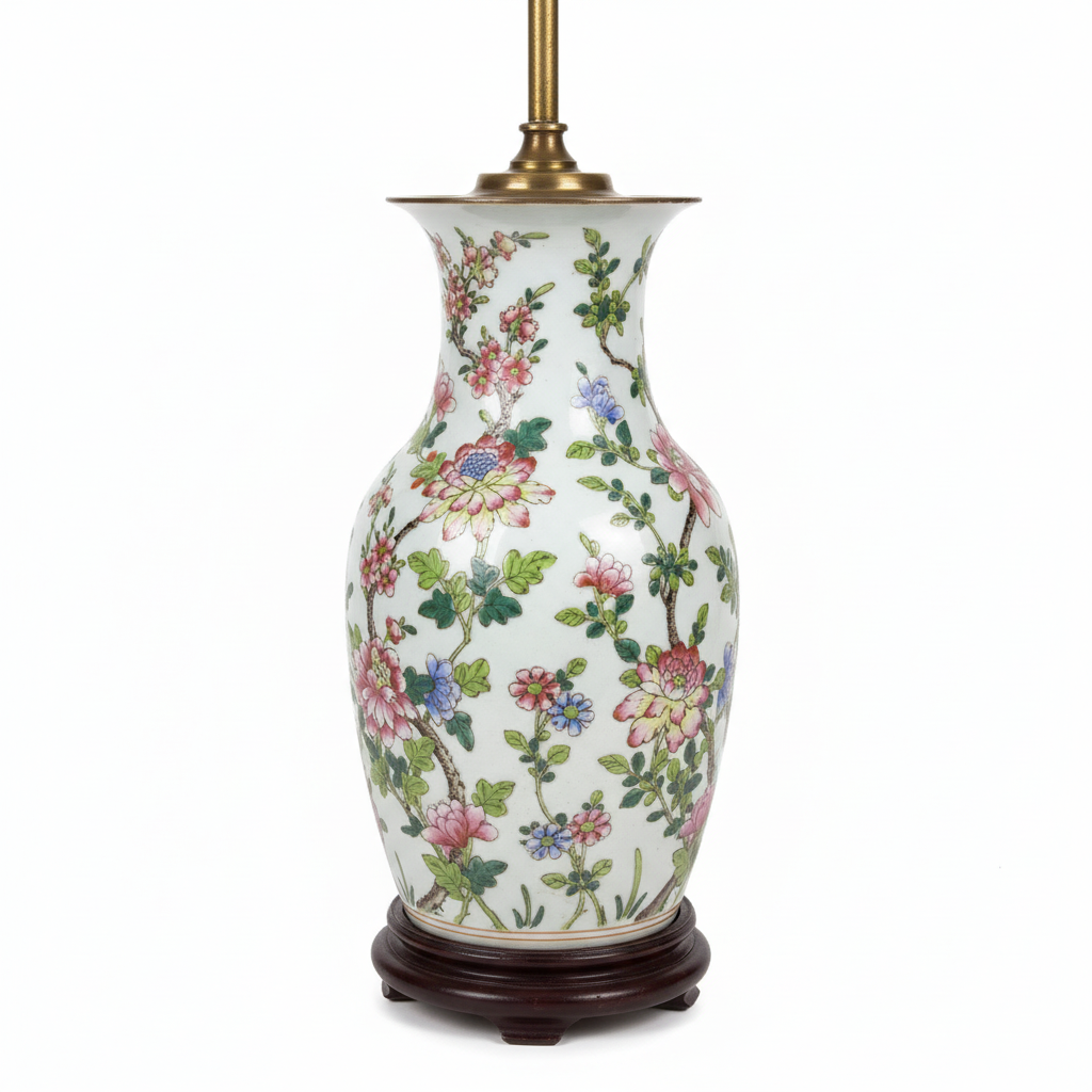 Jarrón chino polícromo con flores montado en lámpara