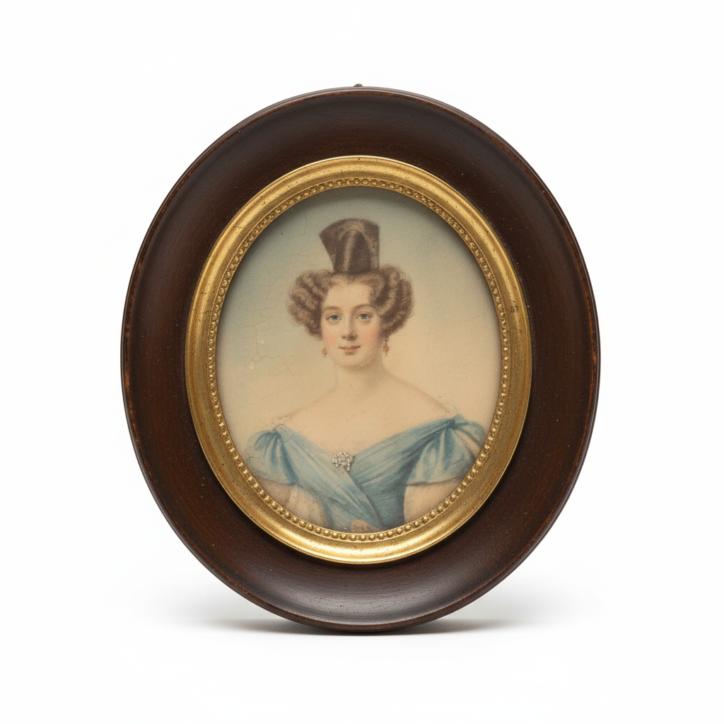 Miniatura oval (grabado) titulada “Joven mujer”.