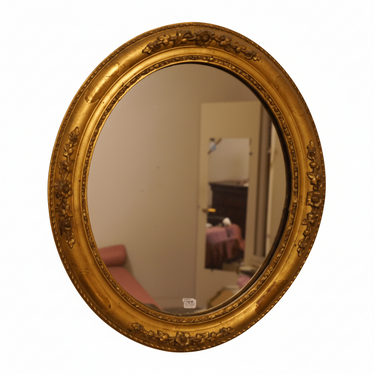 Pequeño espejo ovalado con marco en estuco dorado.