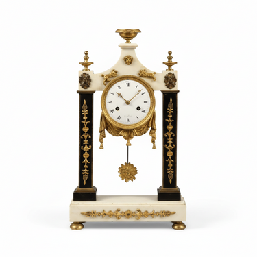 Reloj portique en mármol blanco y negro; esfera esmaltada firmada “A Paris”; ornamentos en bronce dorado aplicado; movimiento a hilo; estilo Directorio.