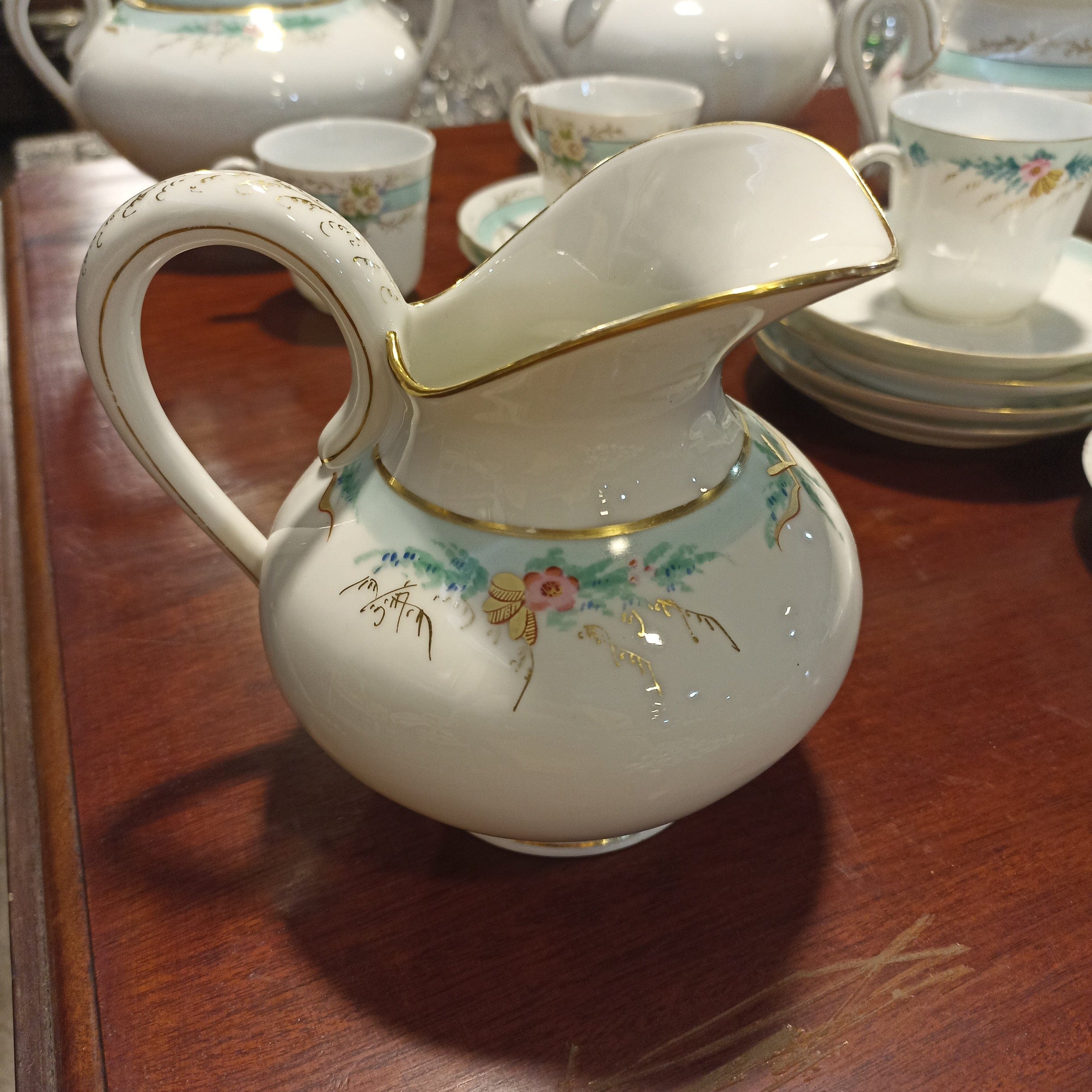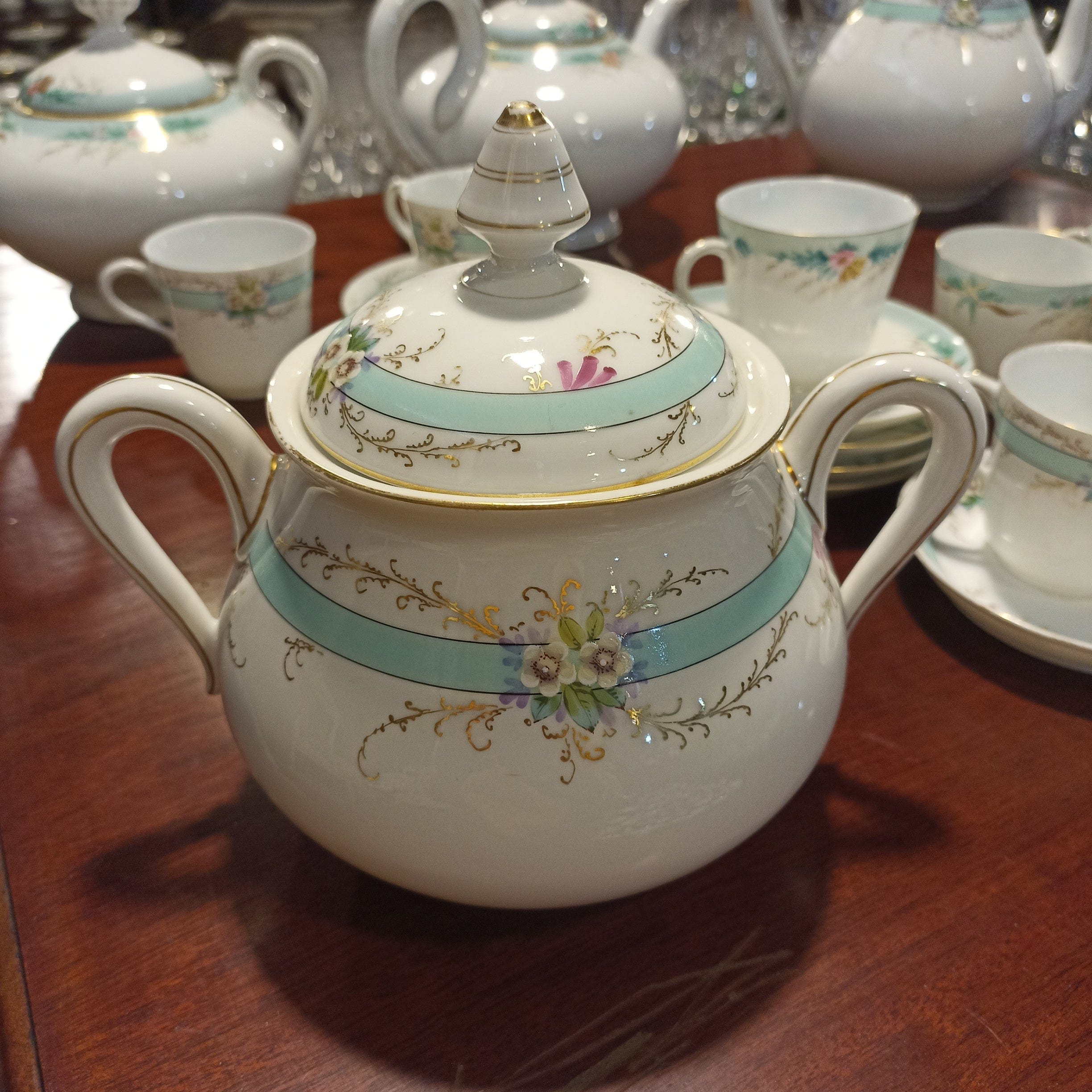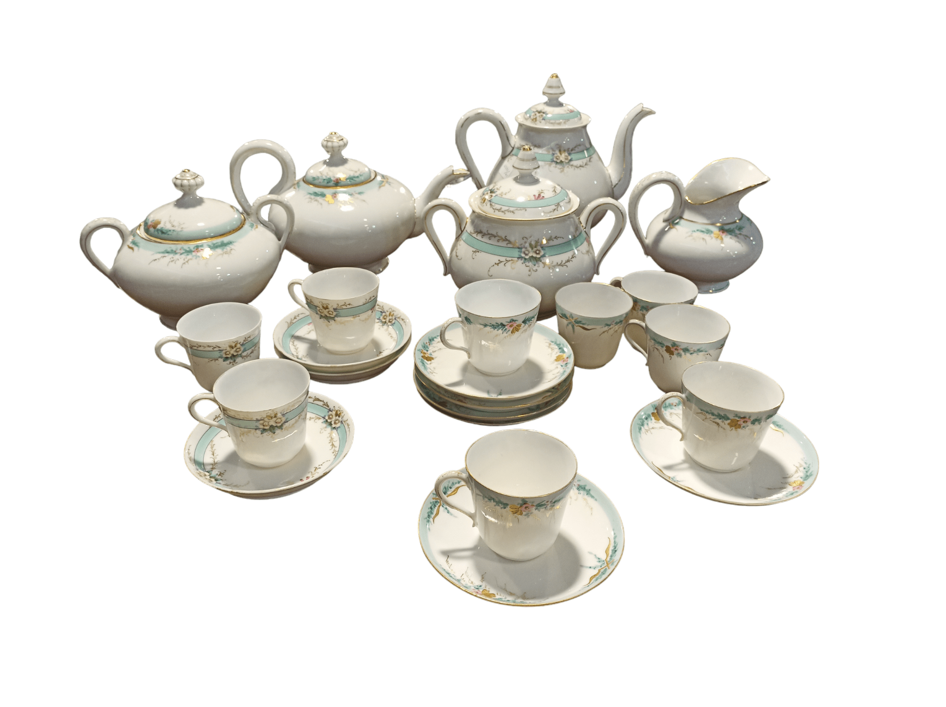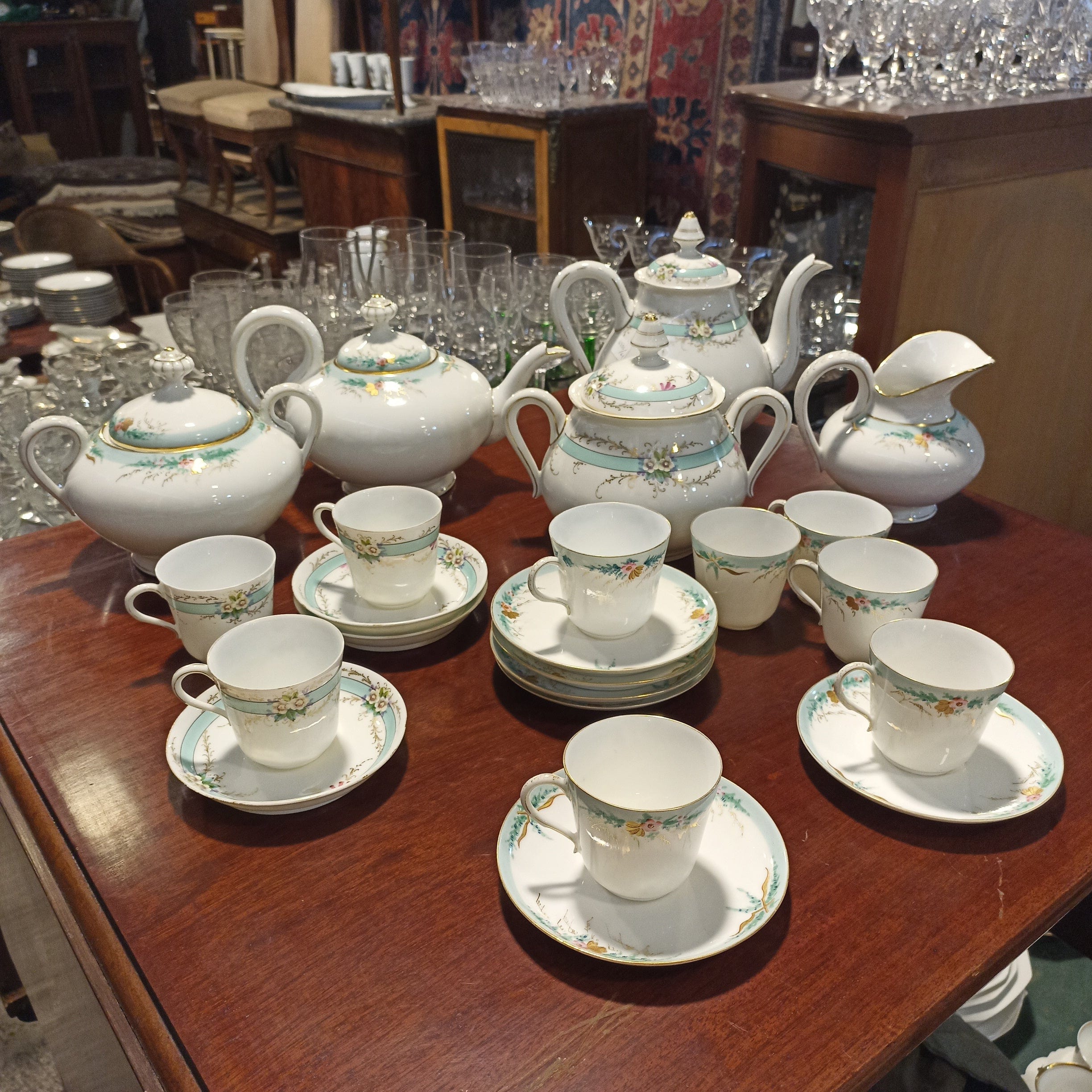 Precioso conjunto de té y café para ocho personas, en dos diseños. Producido por la fábrica francesa Lefèvre Fils, en París.
