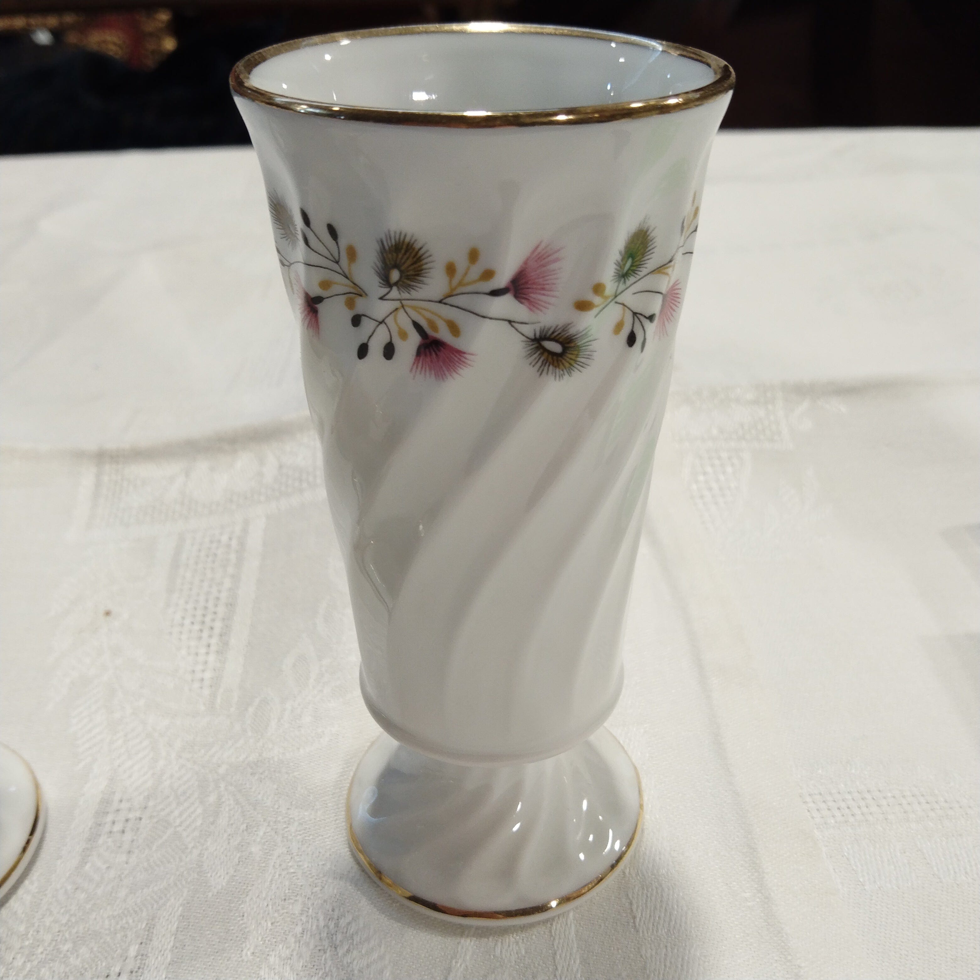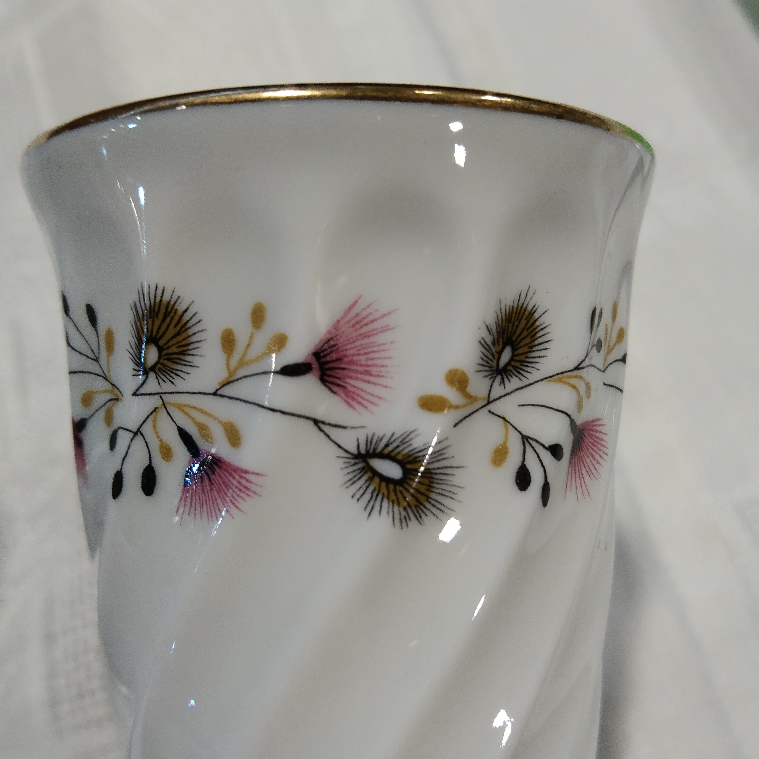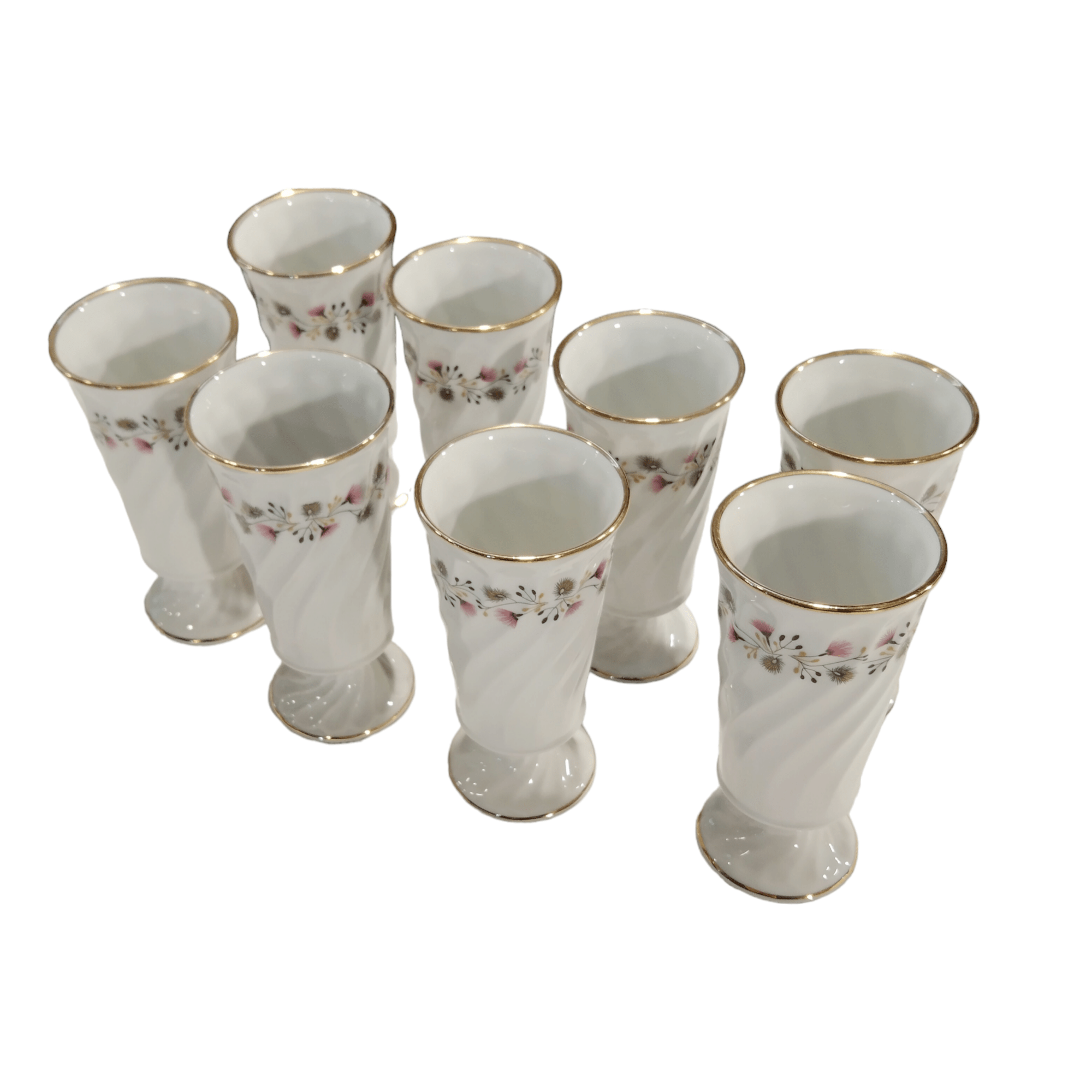 Bellísimo juego de copas de café mazagrán de porcelana francesa Limoges, para 8 personas. Elegante diseño floral con detalles en rosa y dorado.