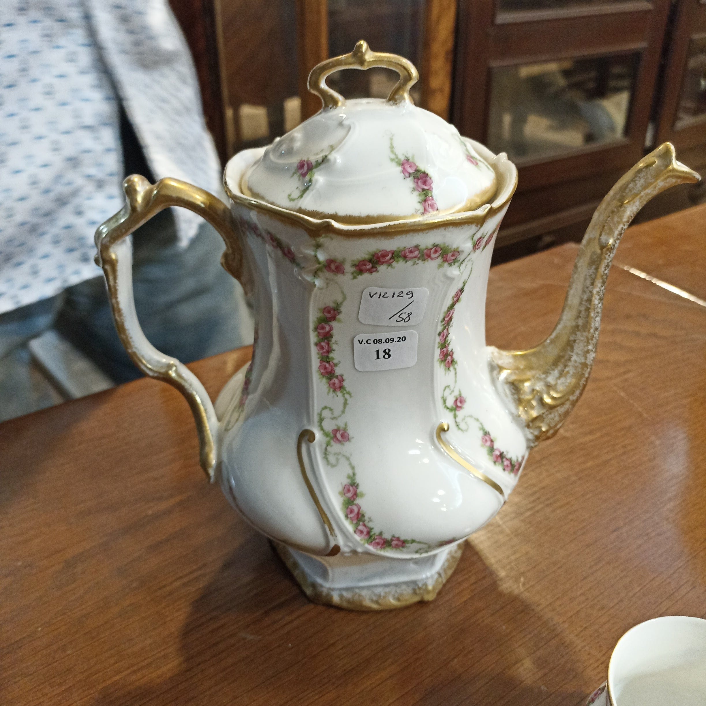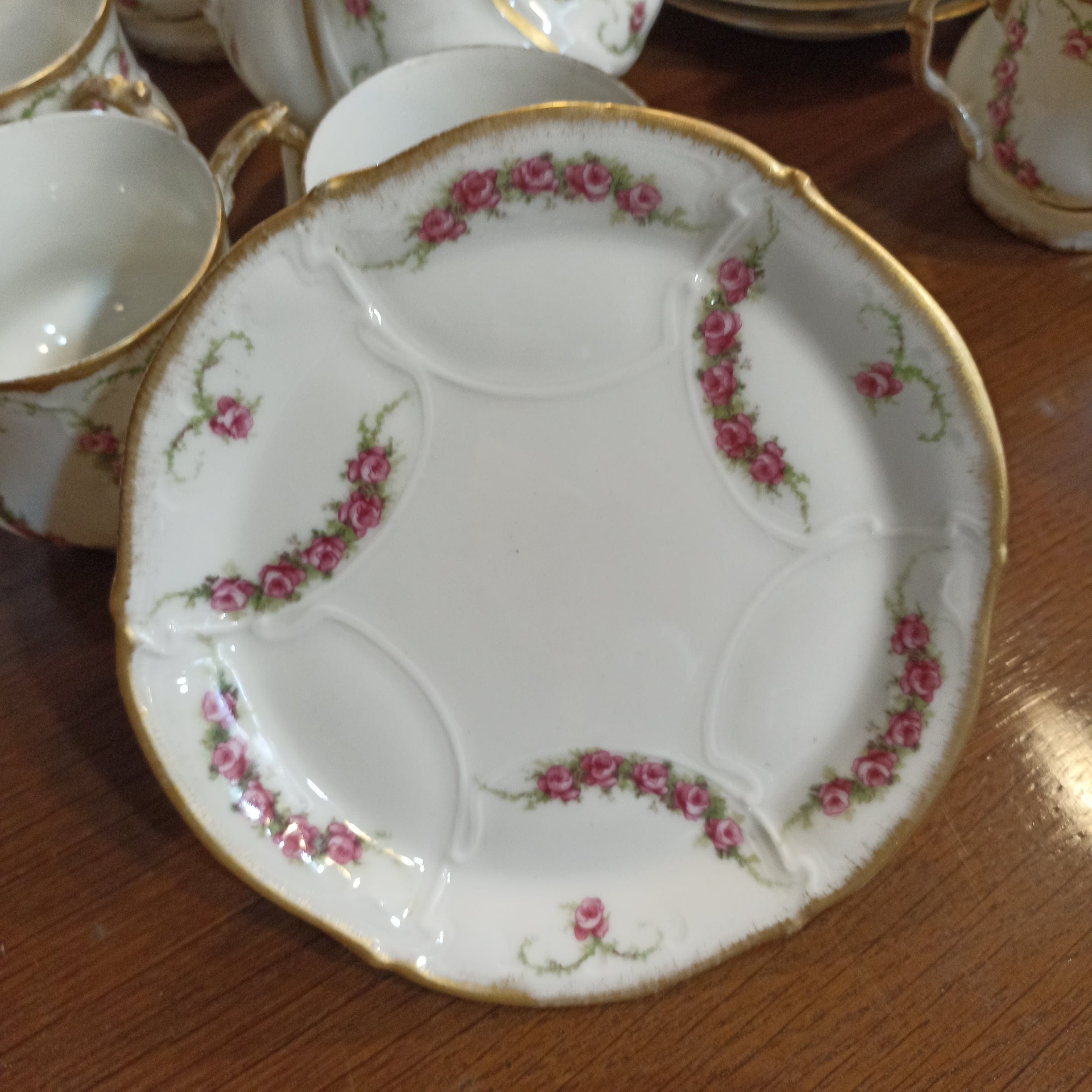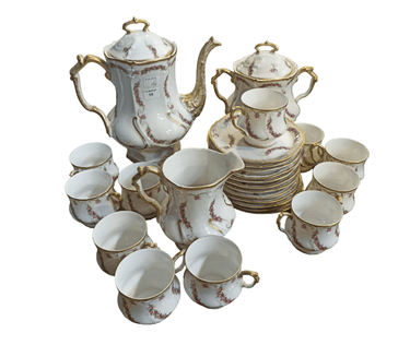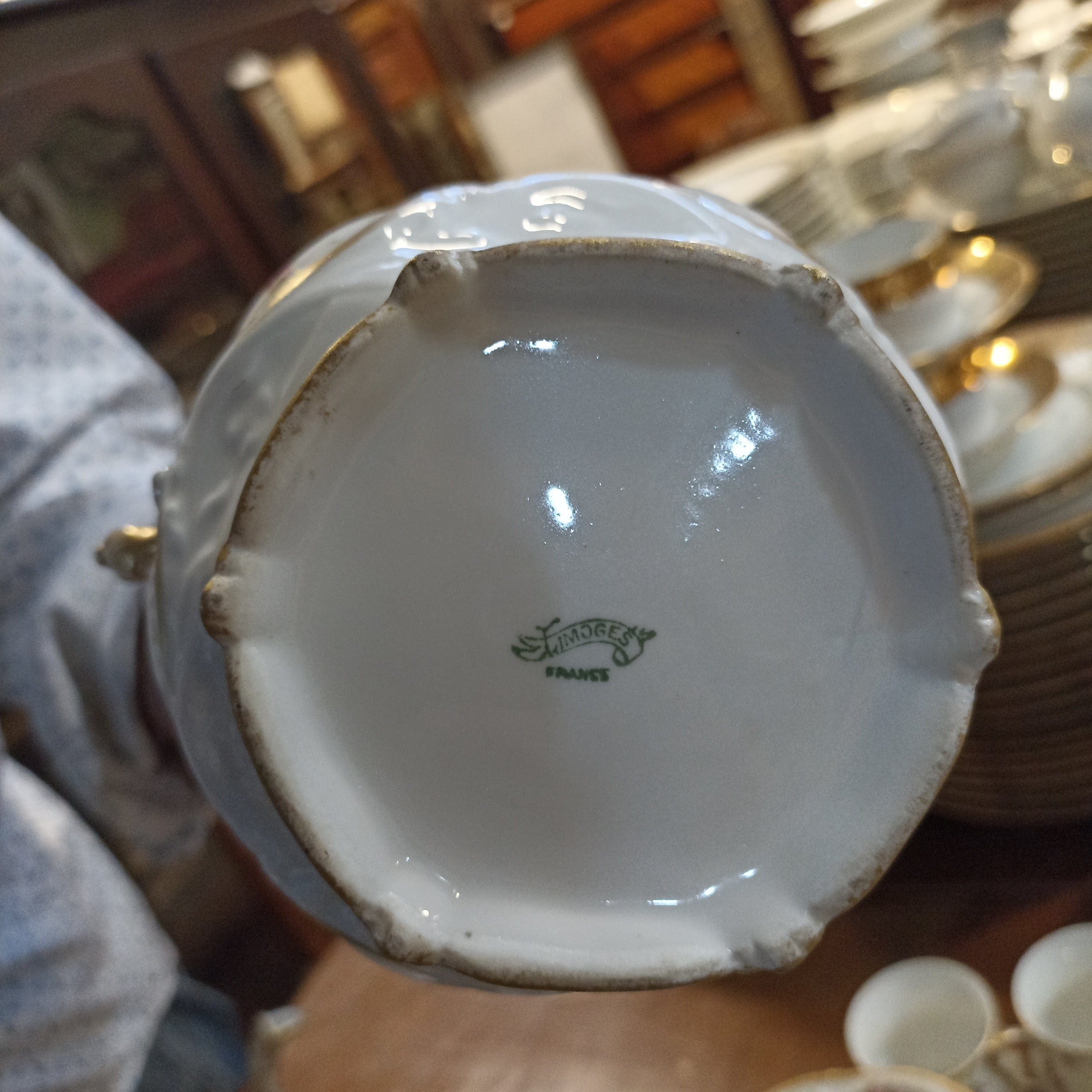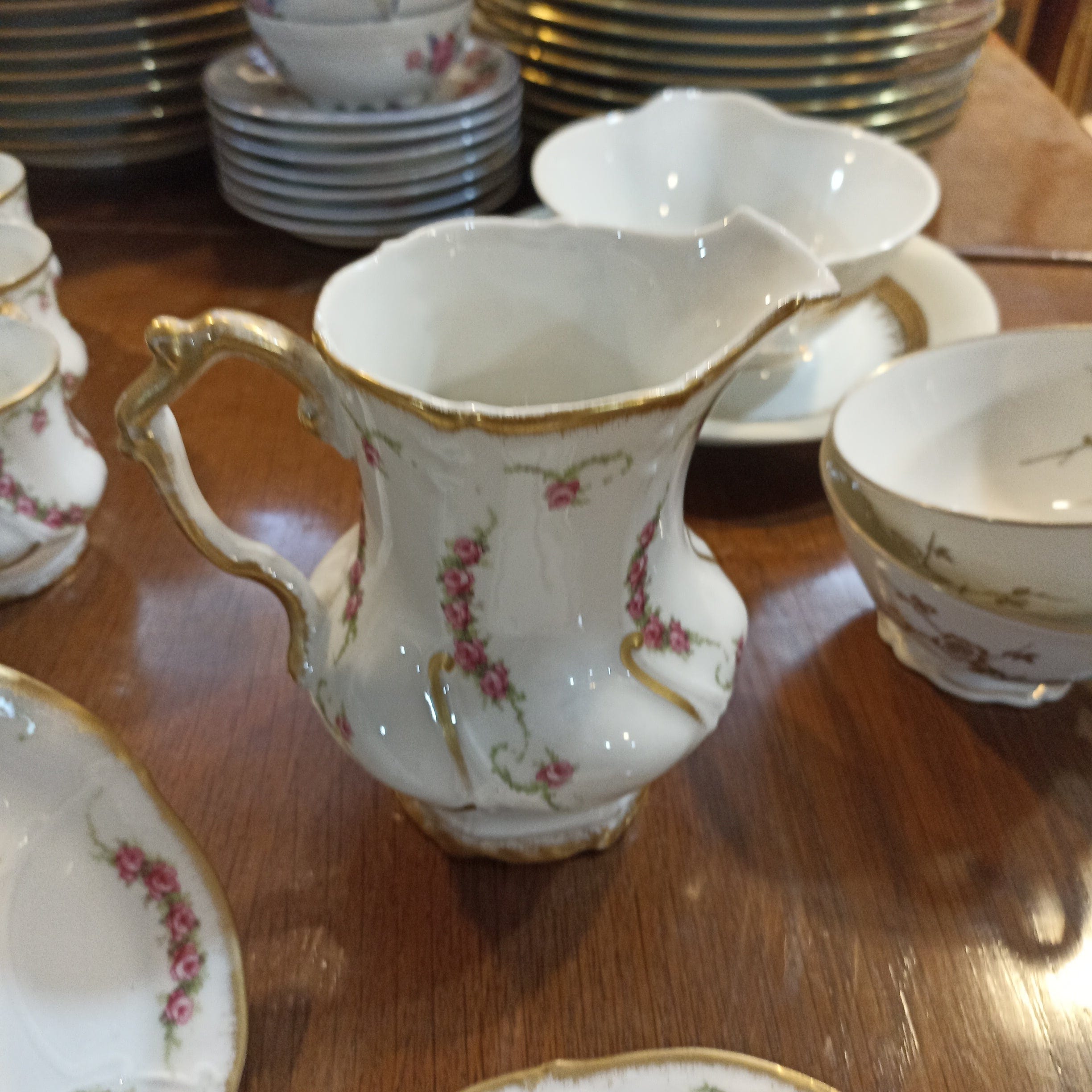 Hermoso juego de café de porcelana Limoges, para once personas. Detalles florales y en dorado.
