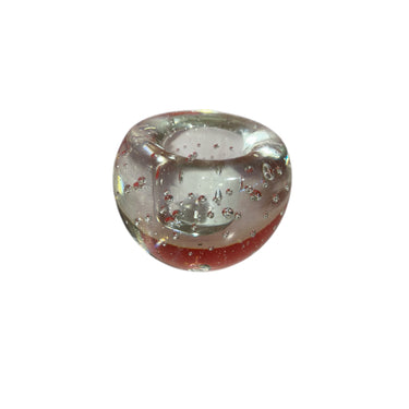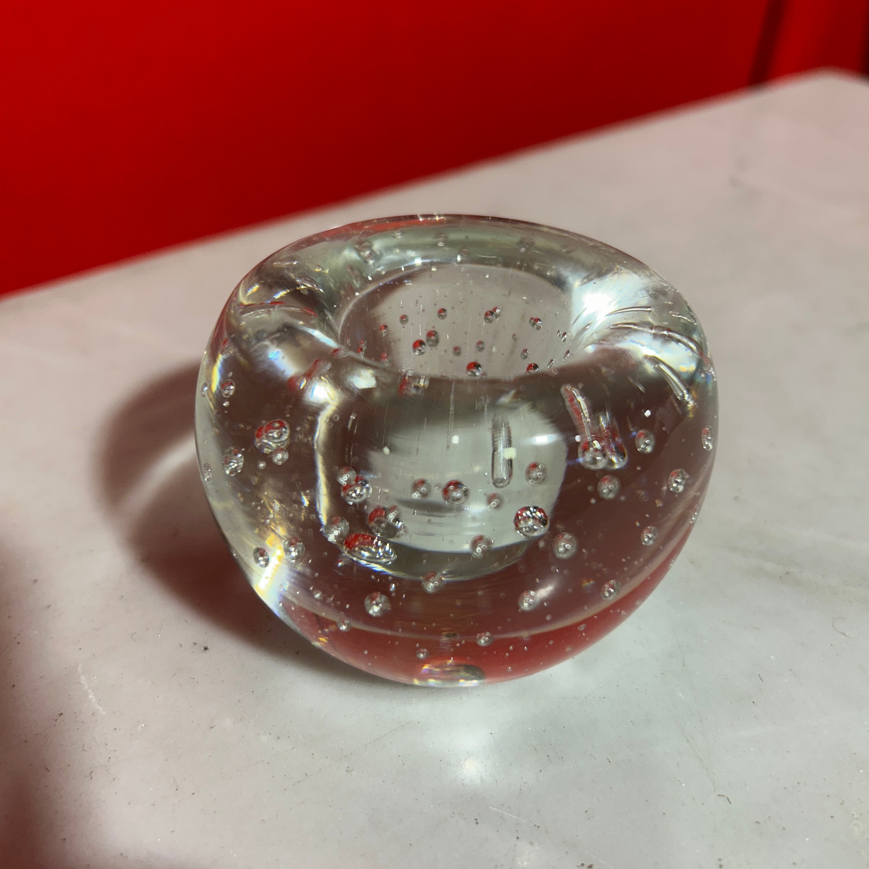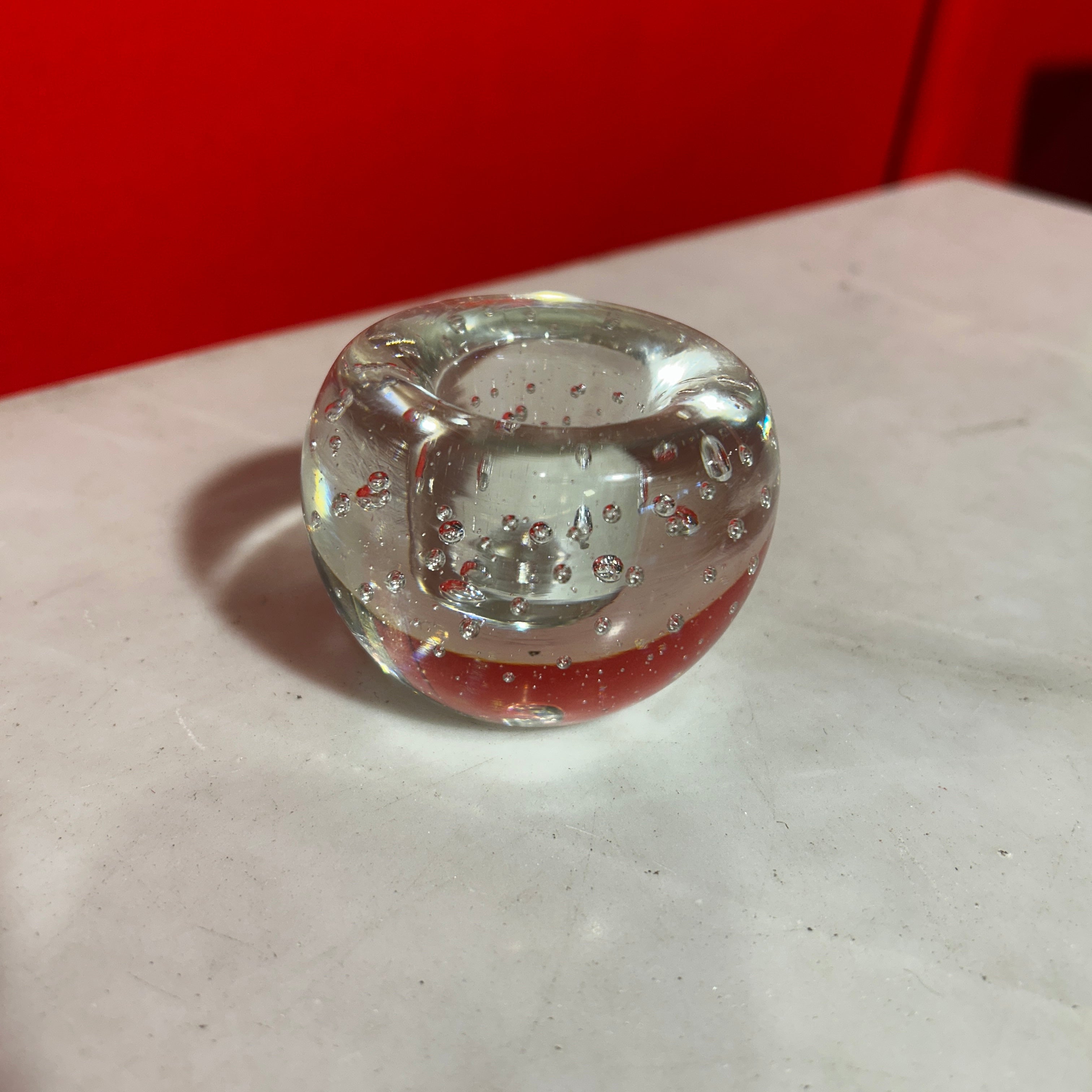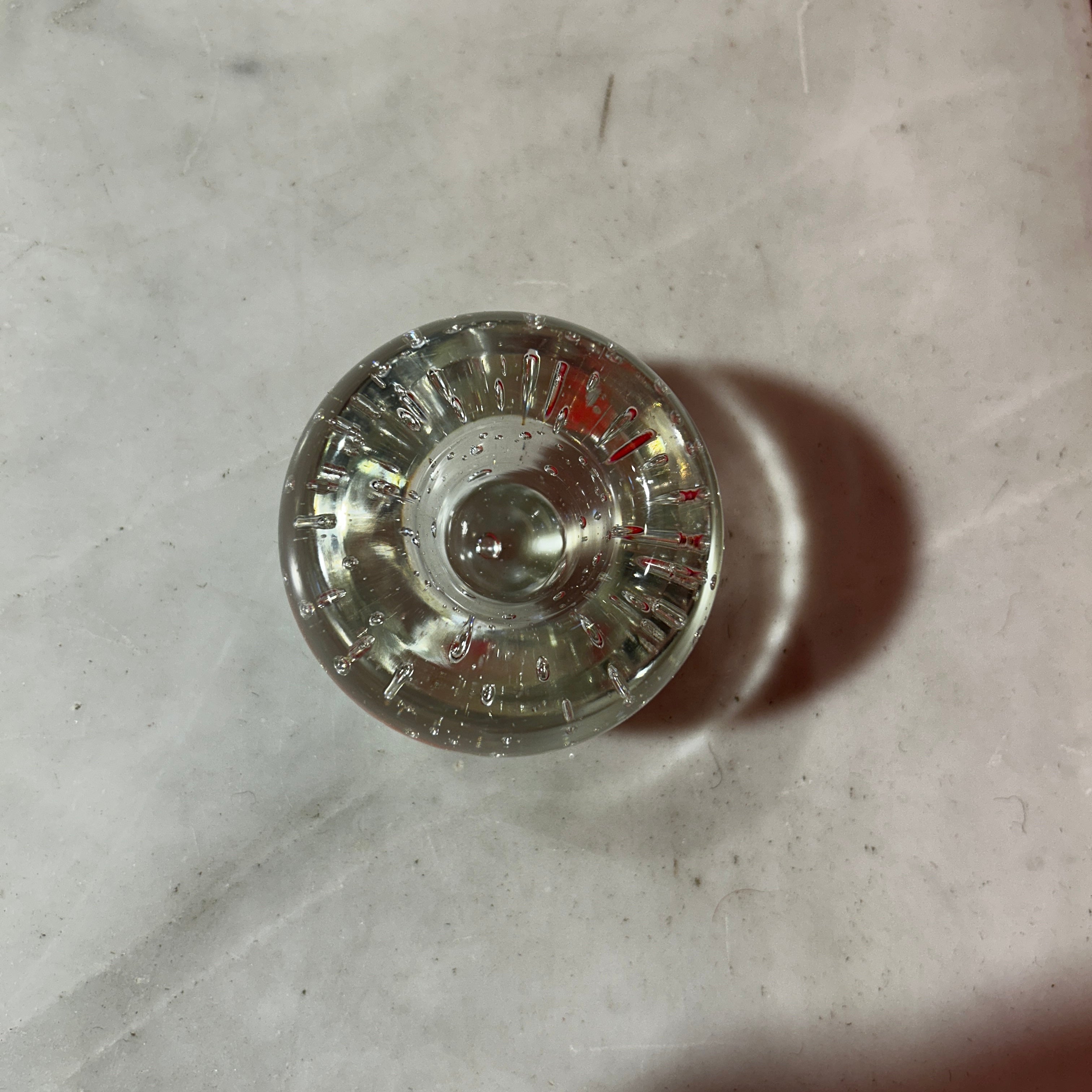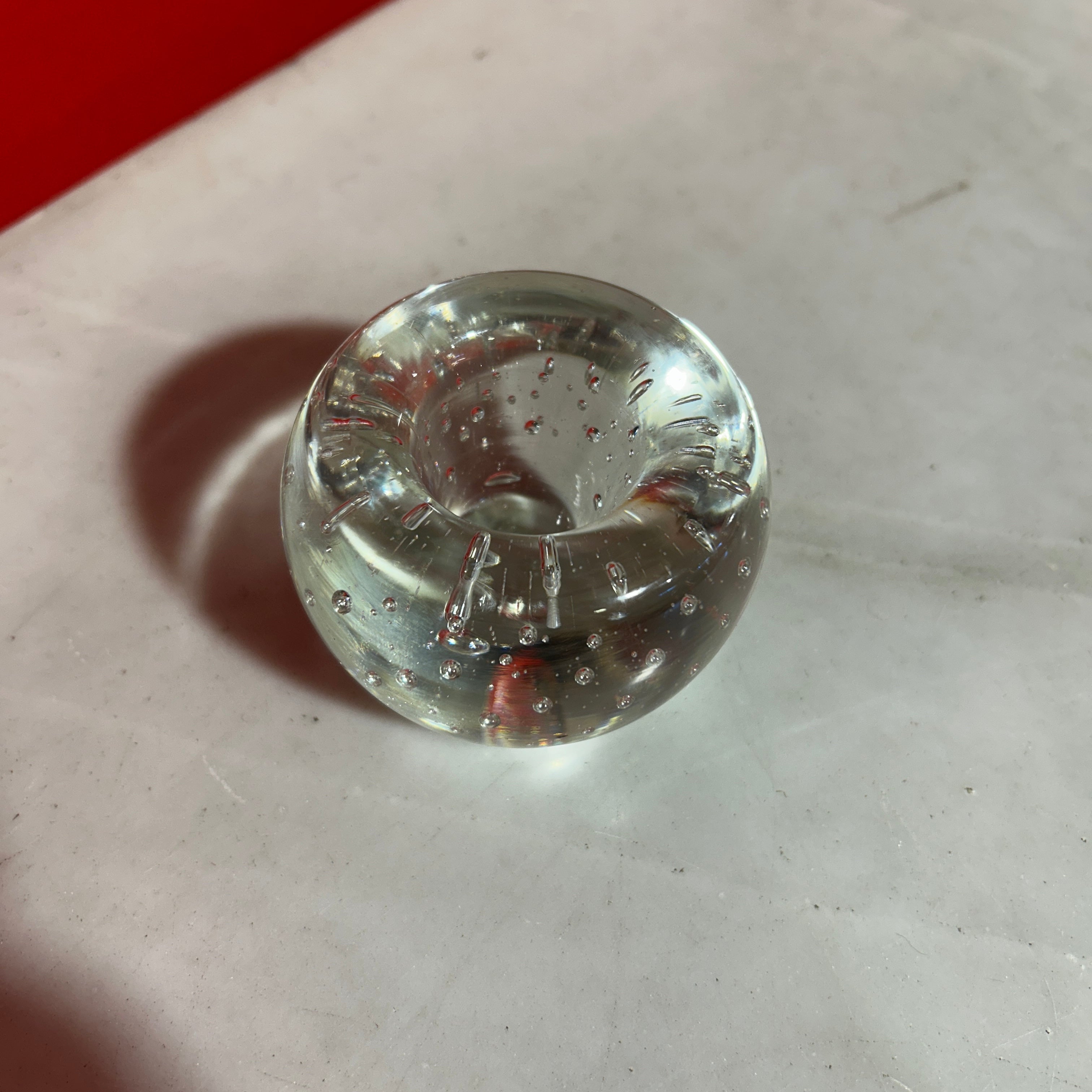 Precioso candelabro o pisapapeles de cristal francés sellado transparente con burbujas, las cuales actúan como reflejos naturales, creando un efecto de luz dispersa y cálida cuando se enciende una vela en su interior.