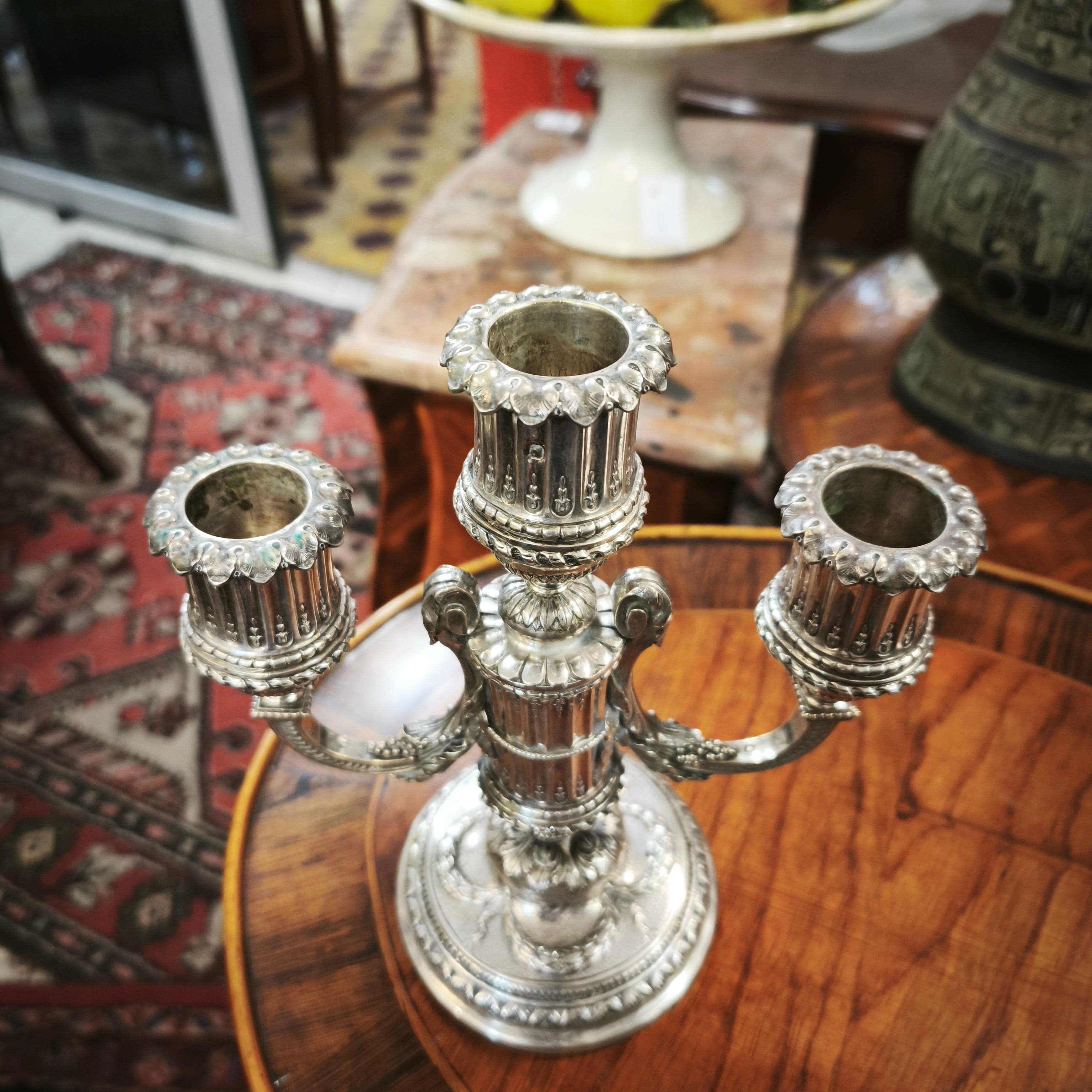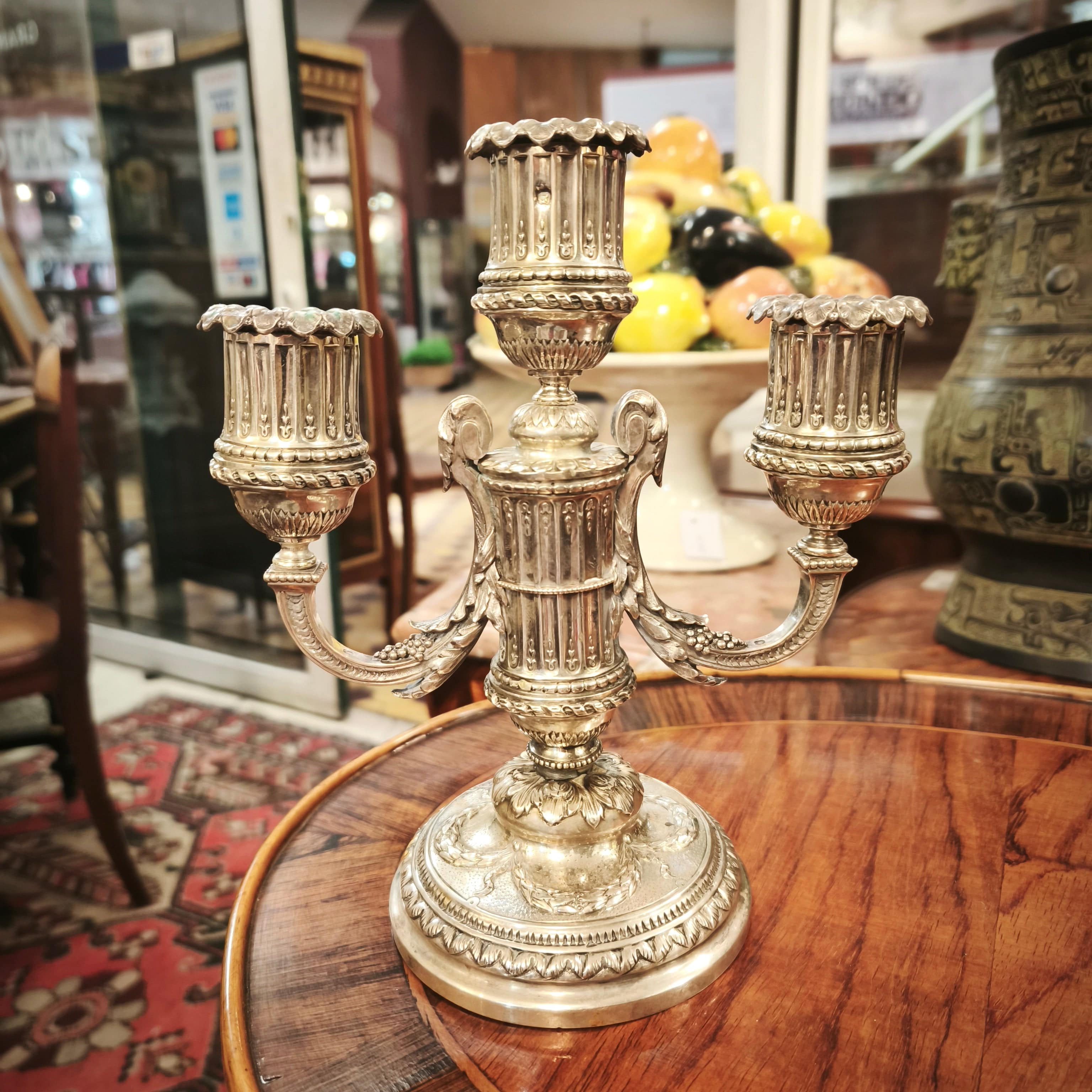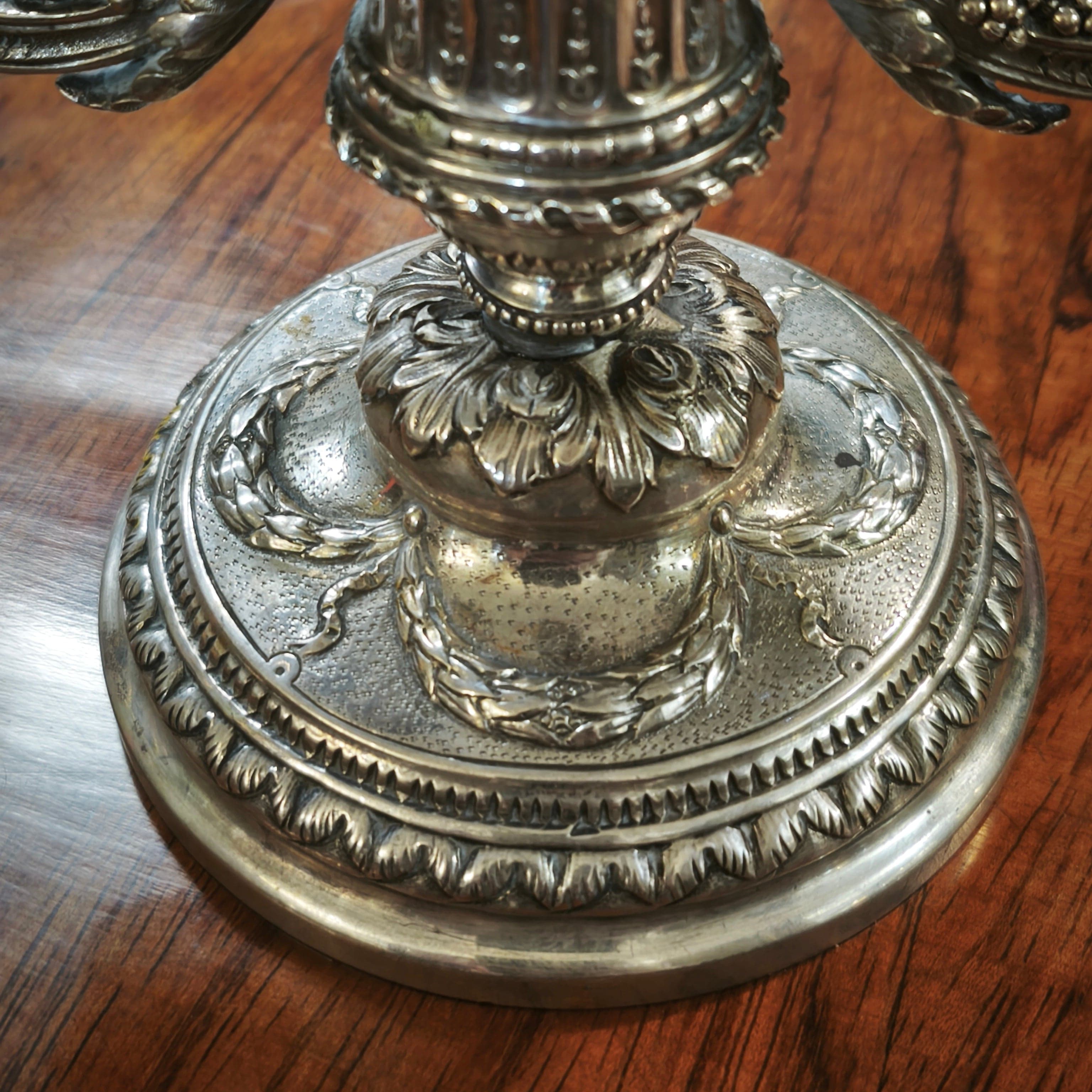 Bello candelabro de plata finamente repujado, con hojas, guirnaldas y uvas.