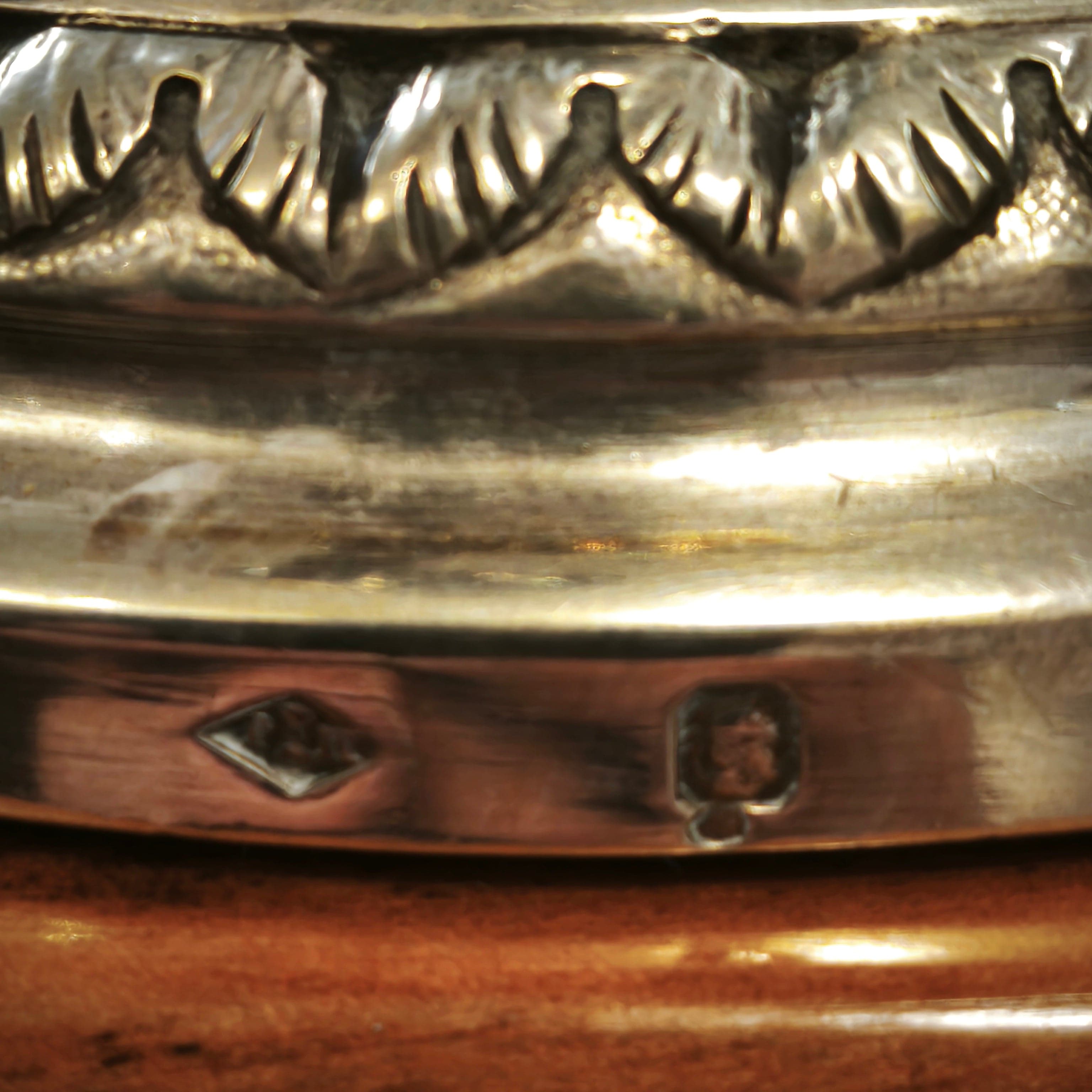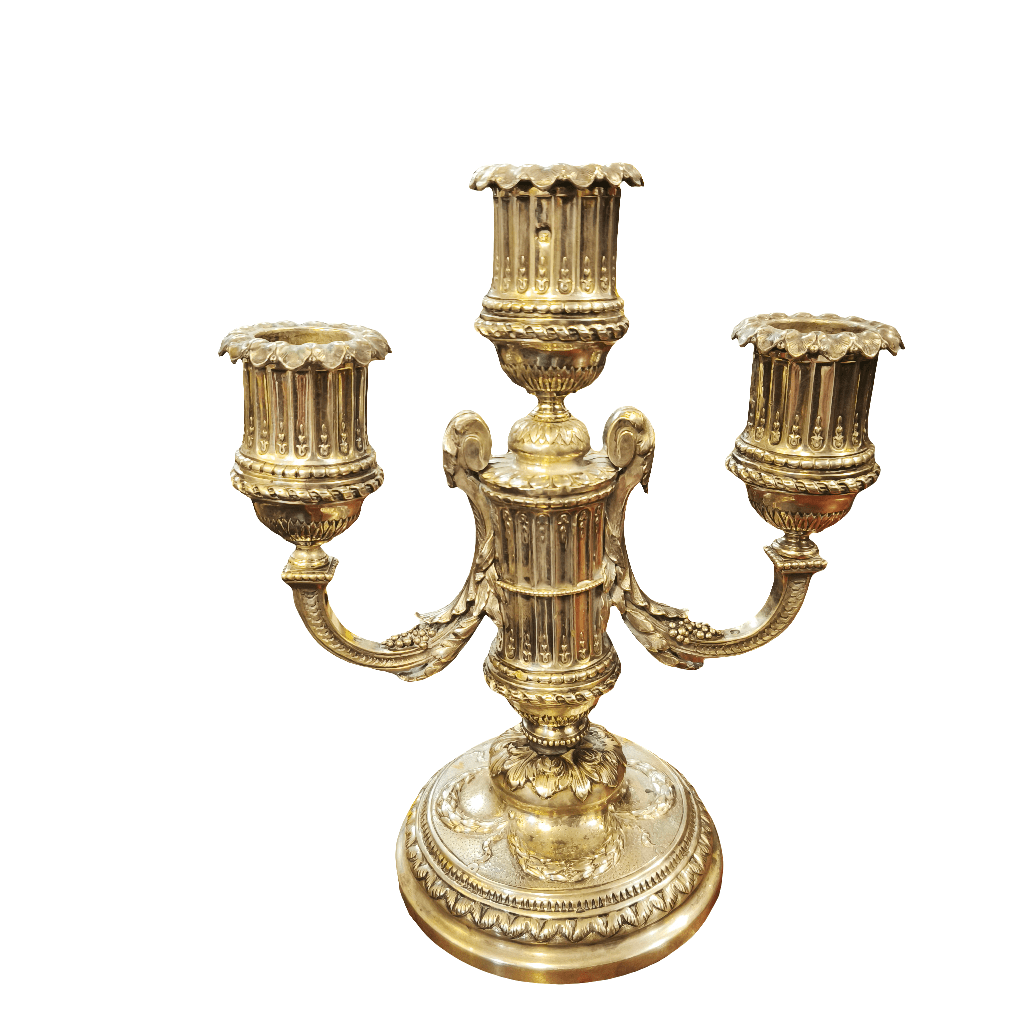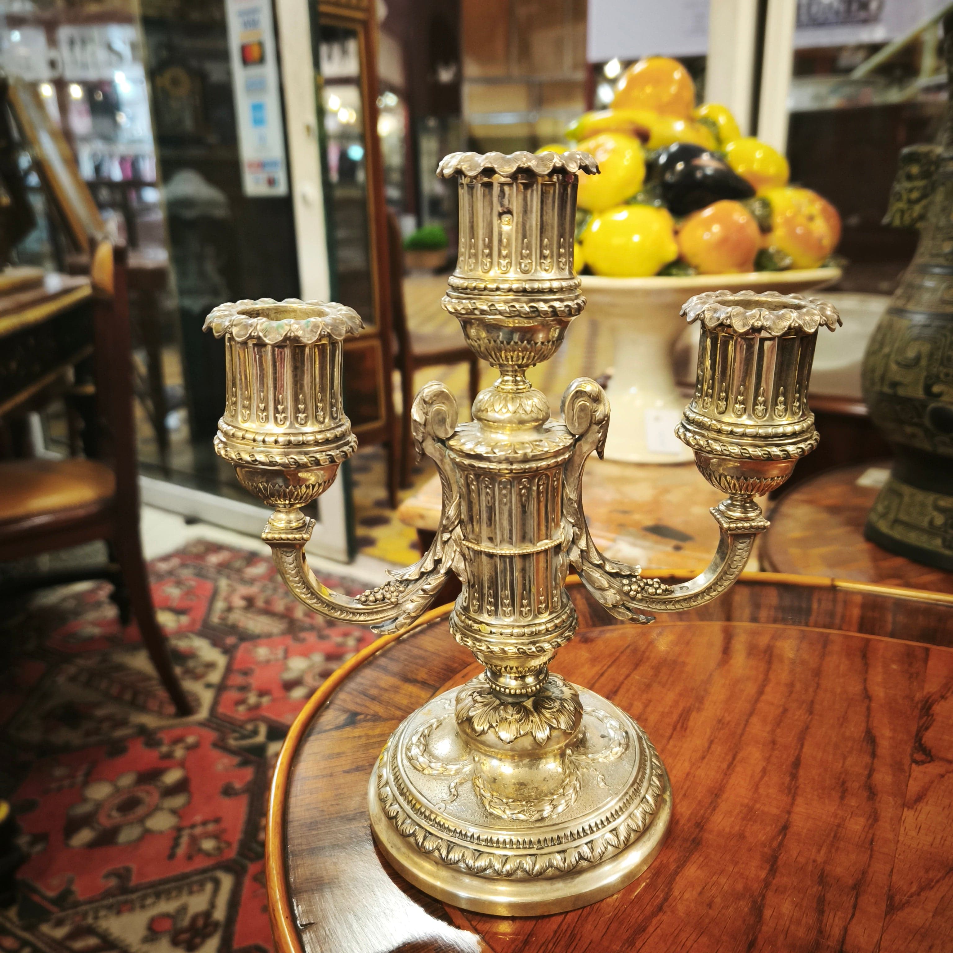 Bello candelabro de plata finamente repujado, con hojas, guirnaldas y uvas.