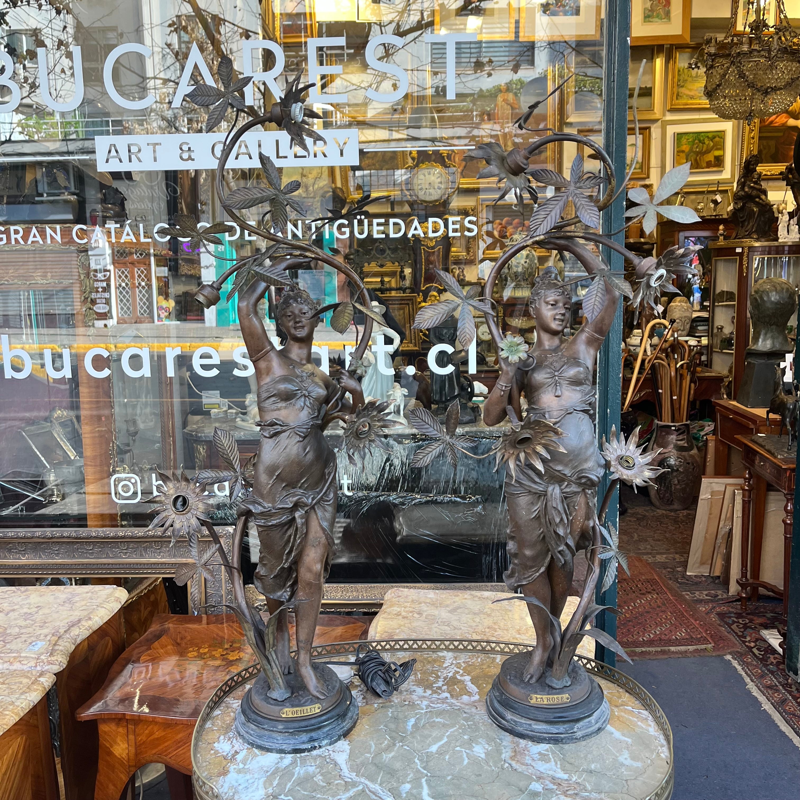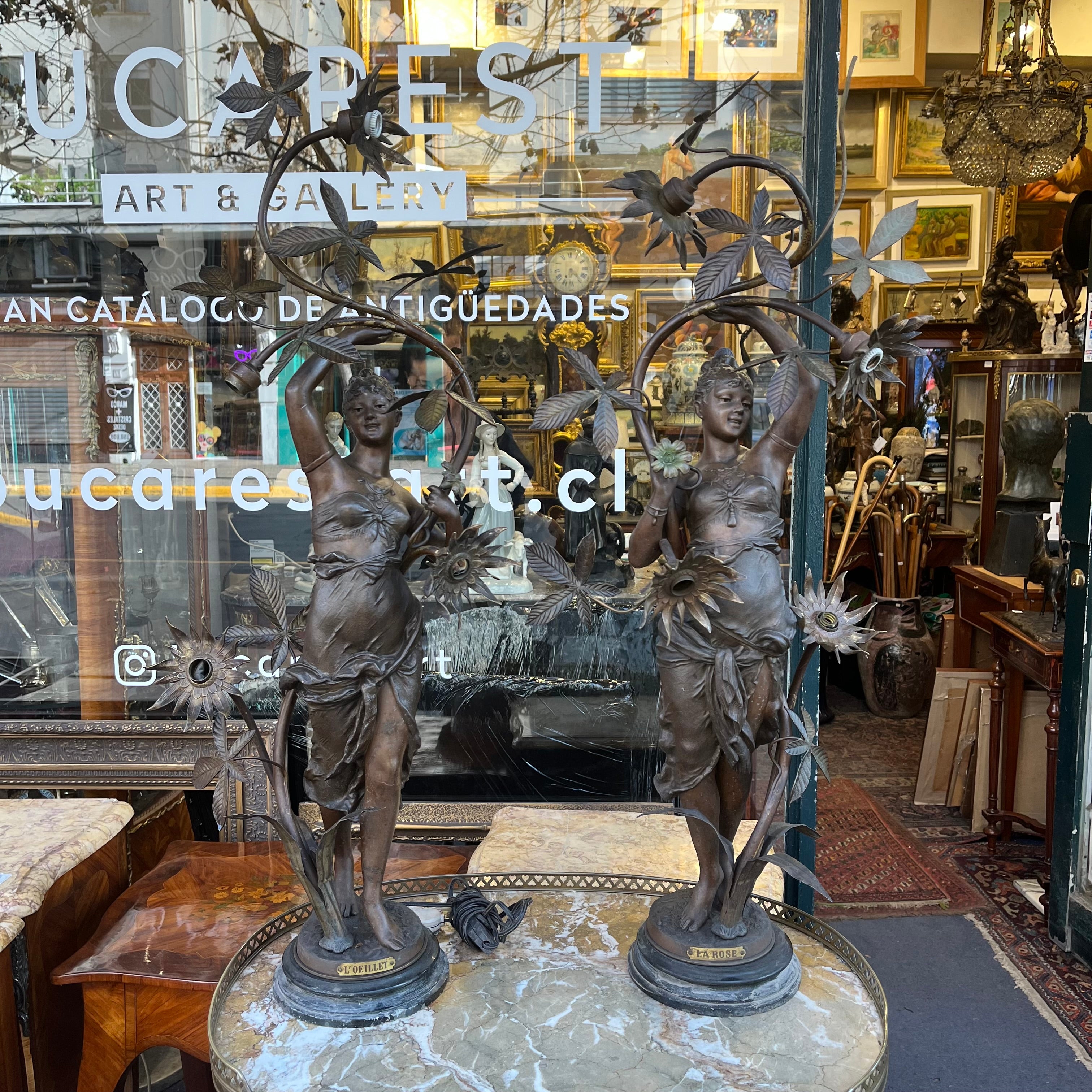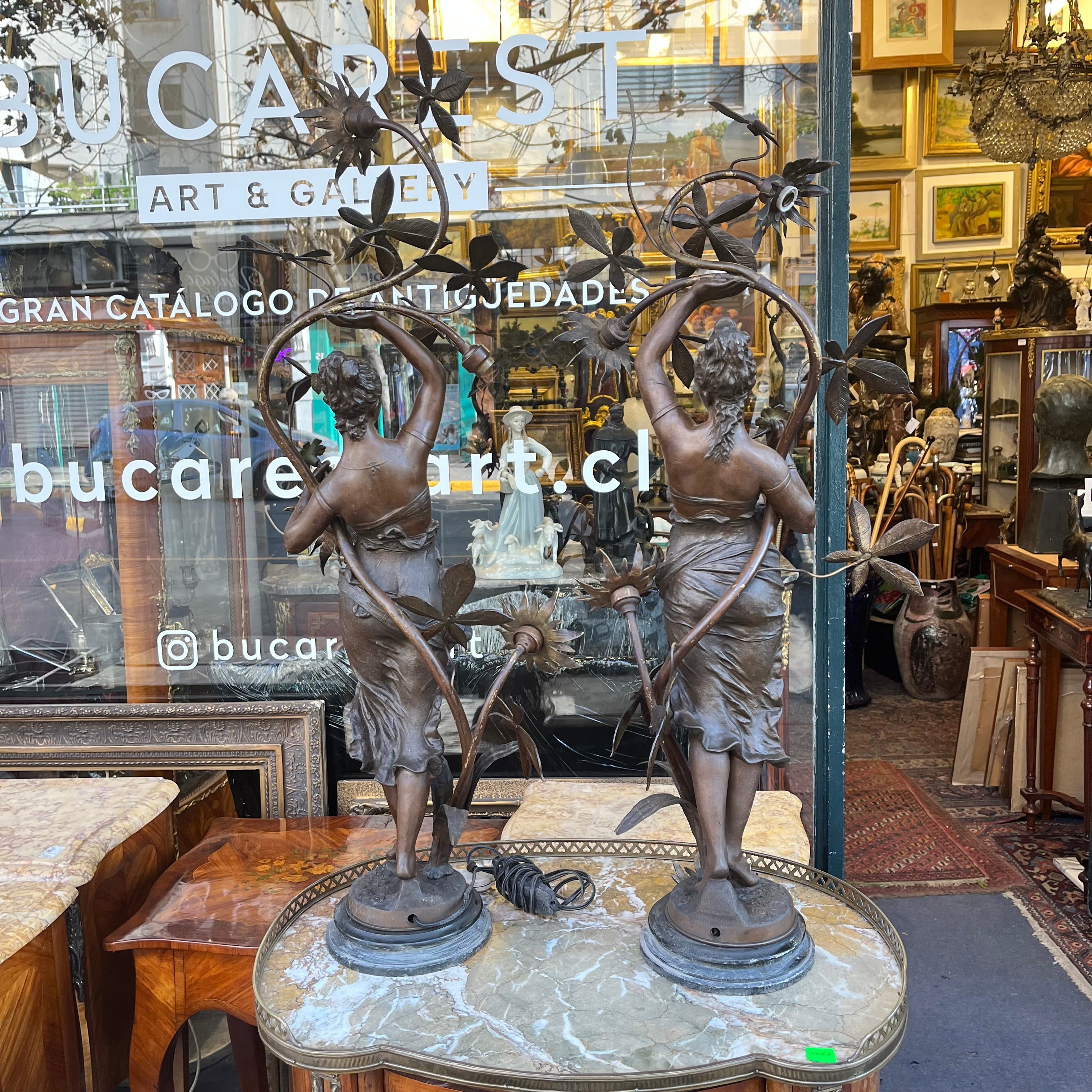 Hermosas lámparas de peltre francesas con cuatro luces cada una. Mujeres rodeadas de flores y hojas, cada flor tiene un soporte de ampolleta pequeña.