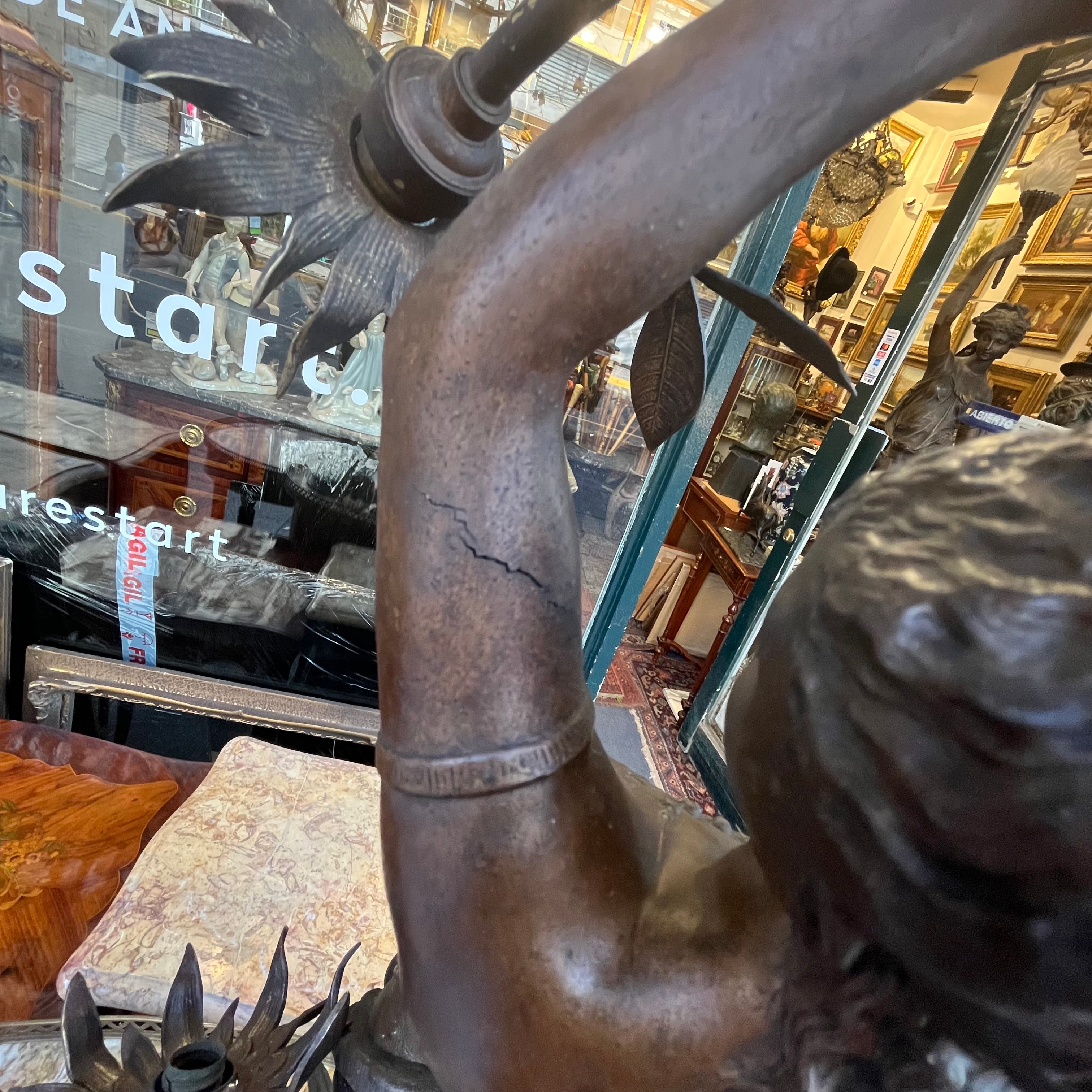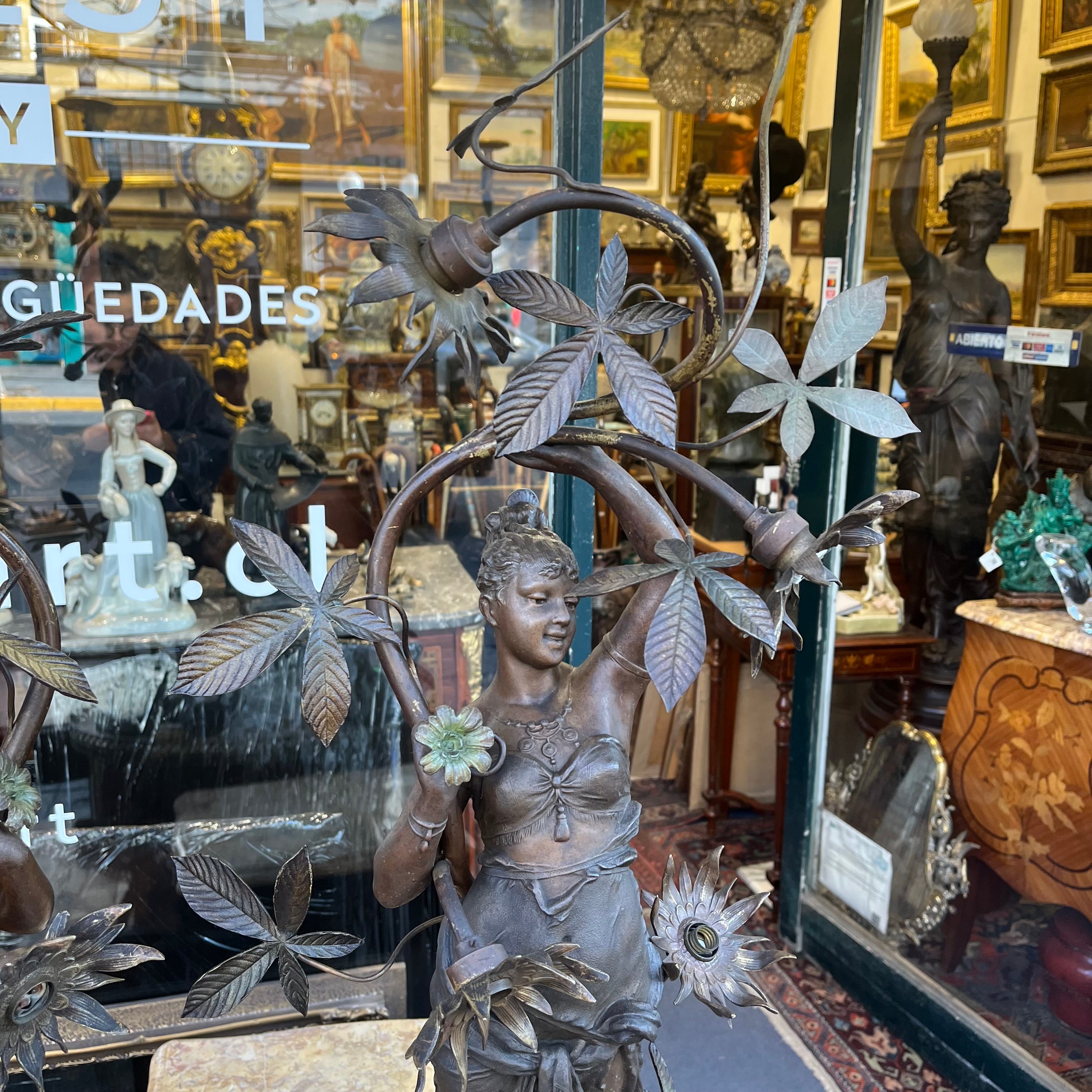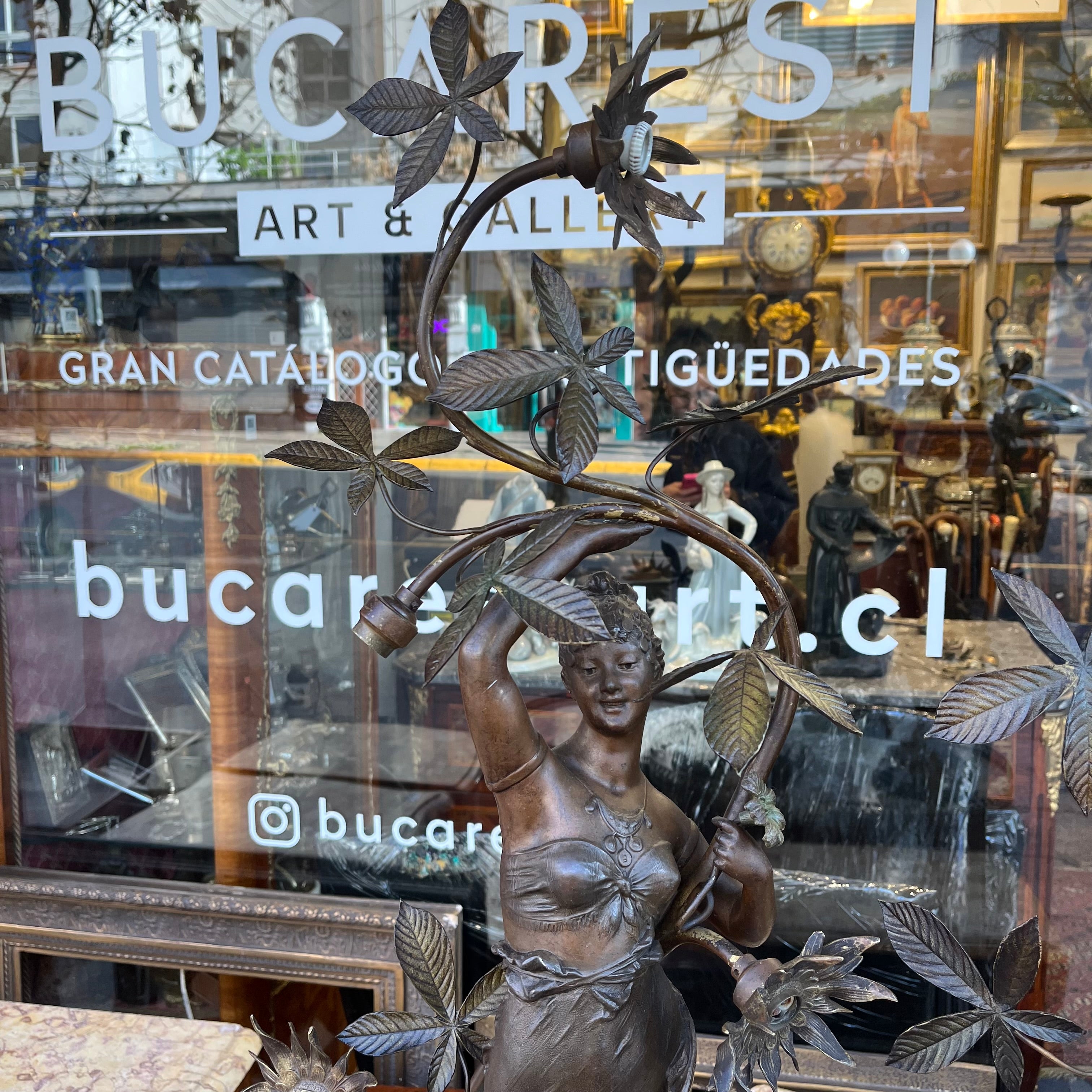 Hermosas lámparas de peltre francesas con cuatro luces cada una. Mujeres rodeadas de flores y hojas, cada flor tiene un soporte de ampolleta pequeña.
