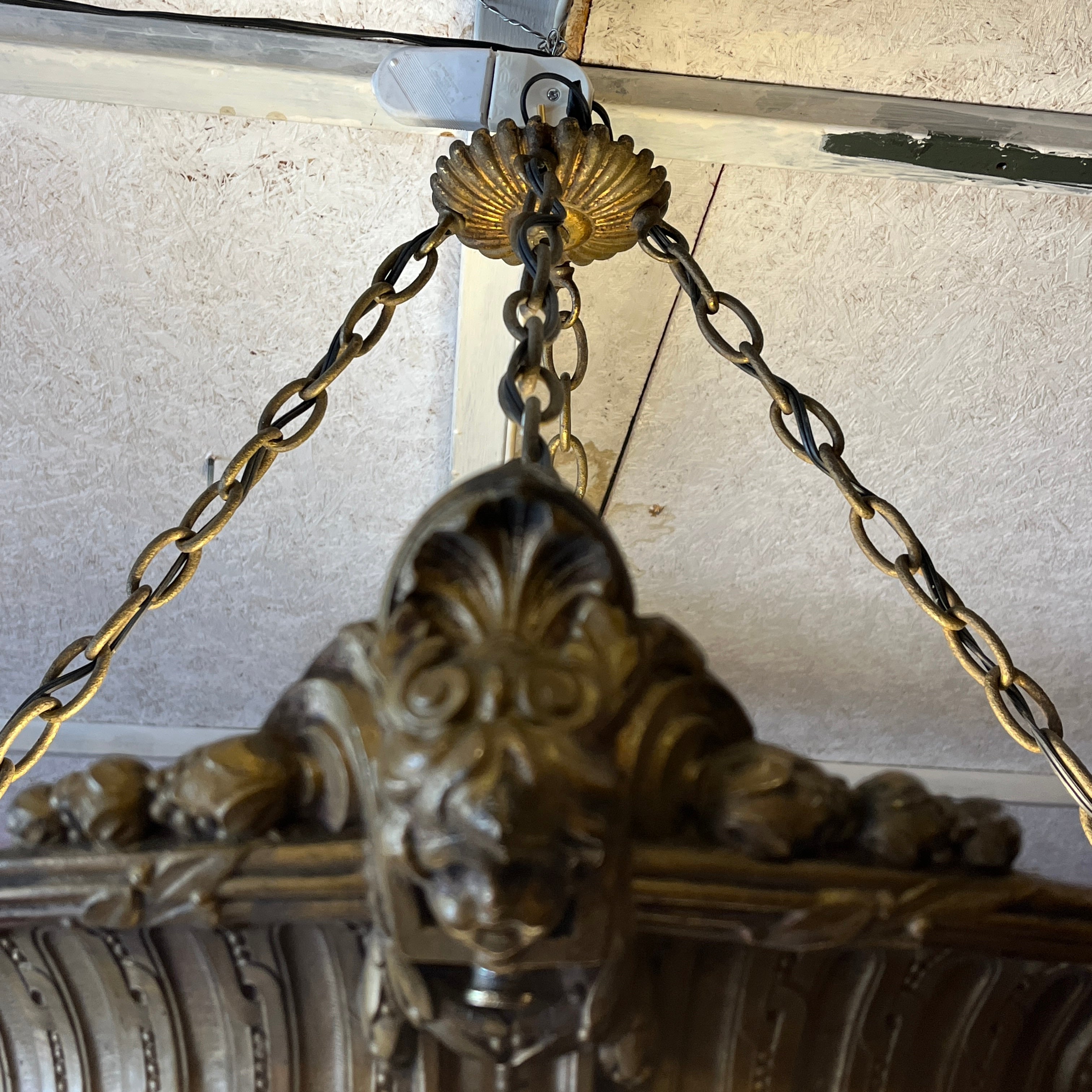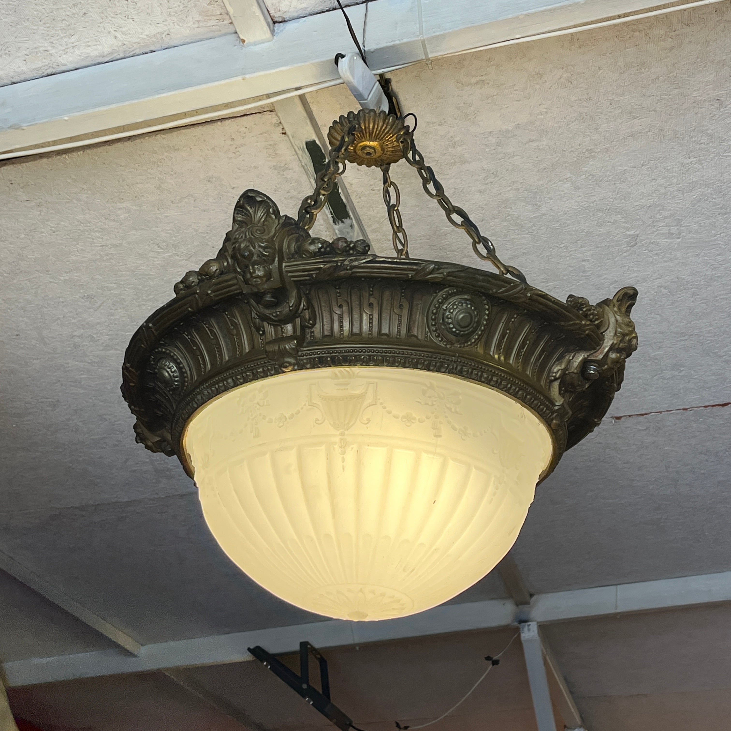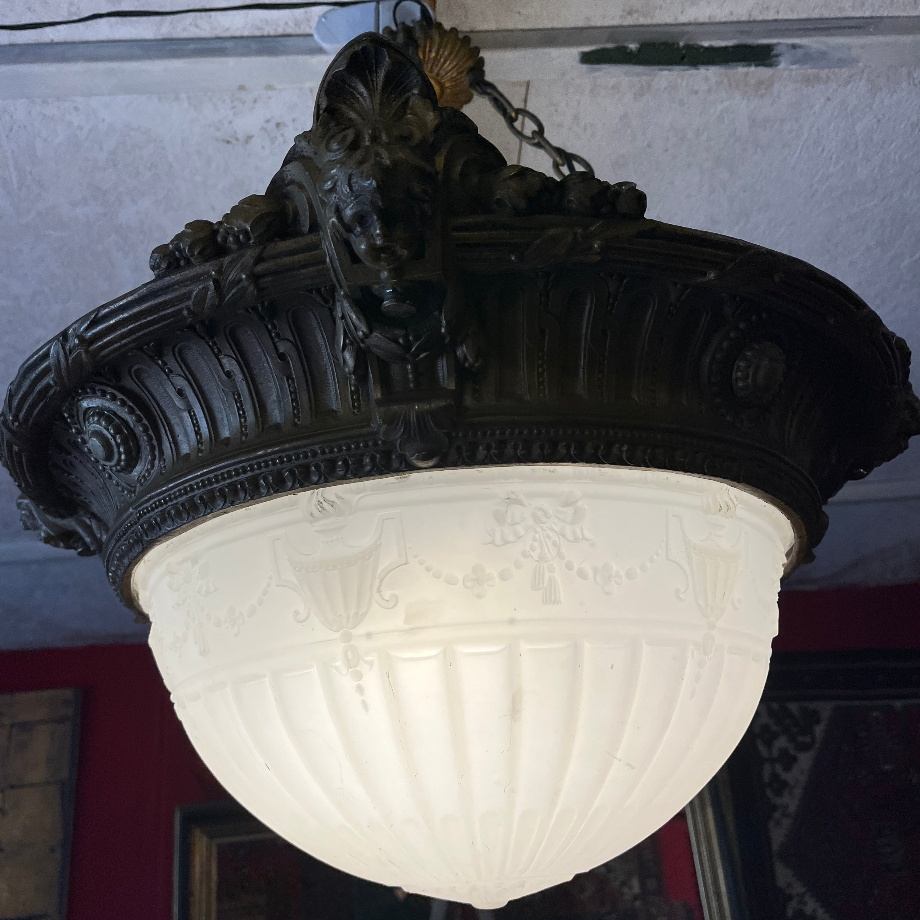 Llamativo plafón de origen y diseño francés estilo Luis XV, hecho de vidrio con relieves de guirnalda y estructura de bronce dorado, con decoraciones y rostros de querubines. La pieza tiene en el interior de su vidrio la frase "PAT. APL'D FOR", que significa "Patent Applied For" (patente solicitada), lo que indica que el diseño estaba en proceso de ser patentado en el momento de la fabricación.