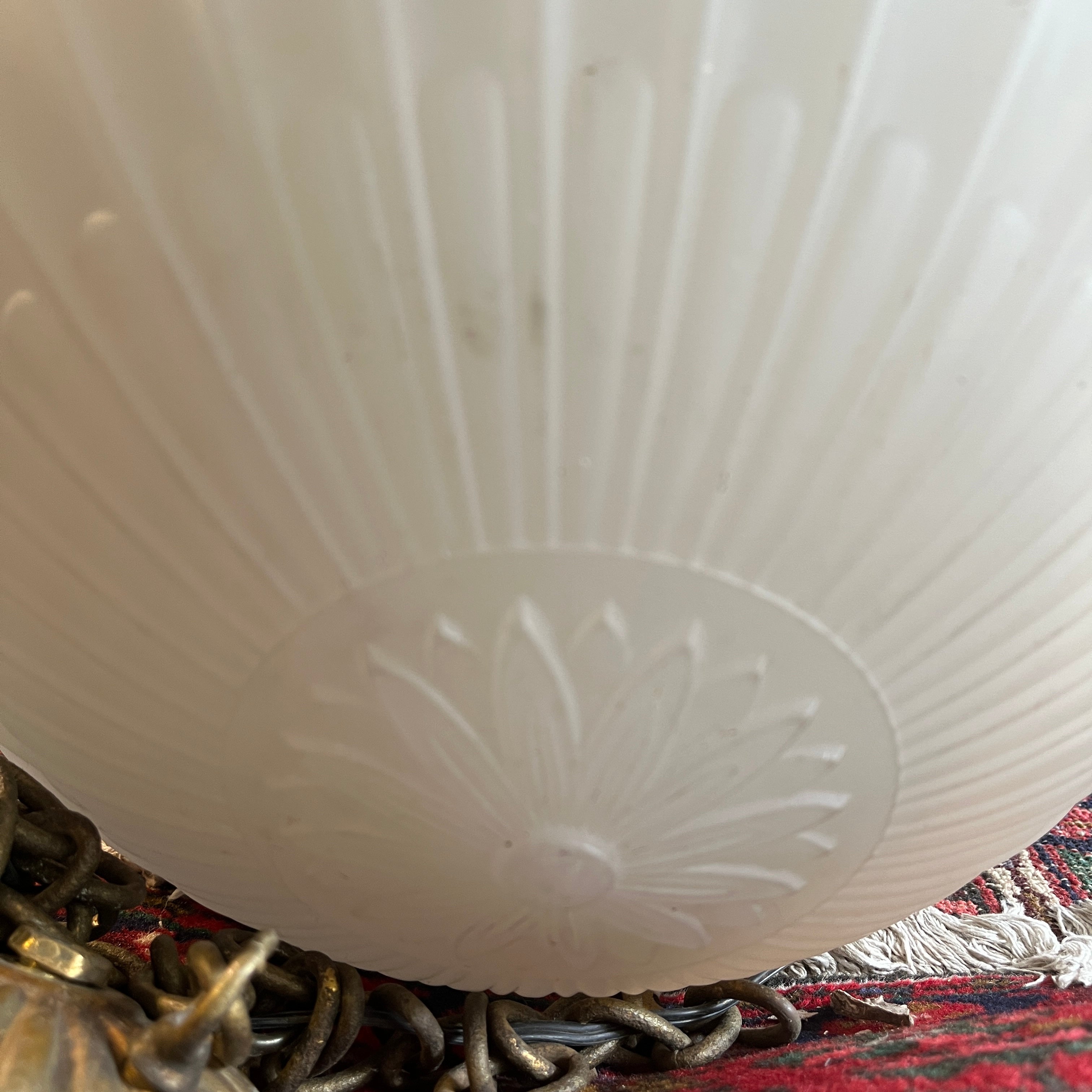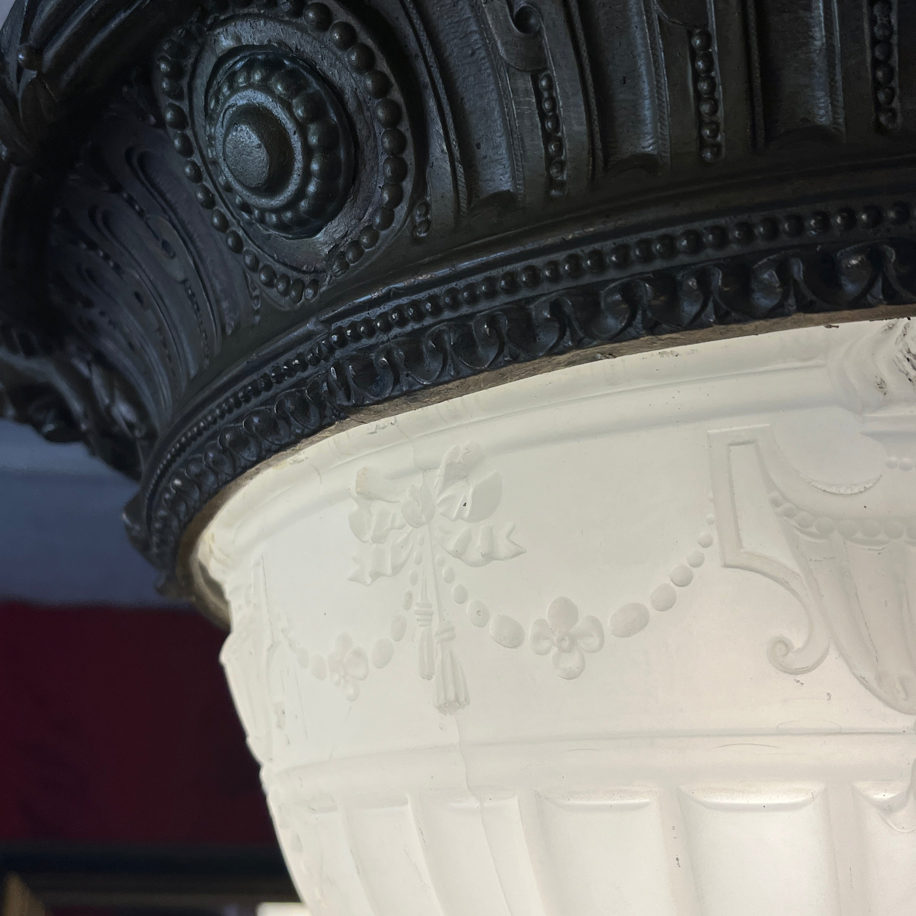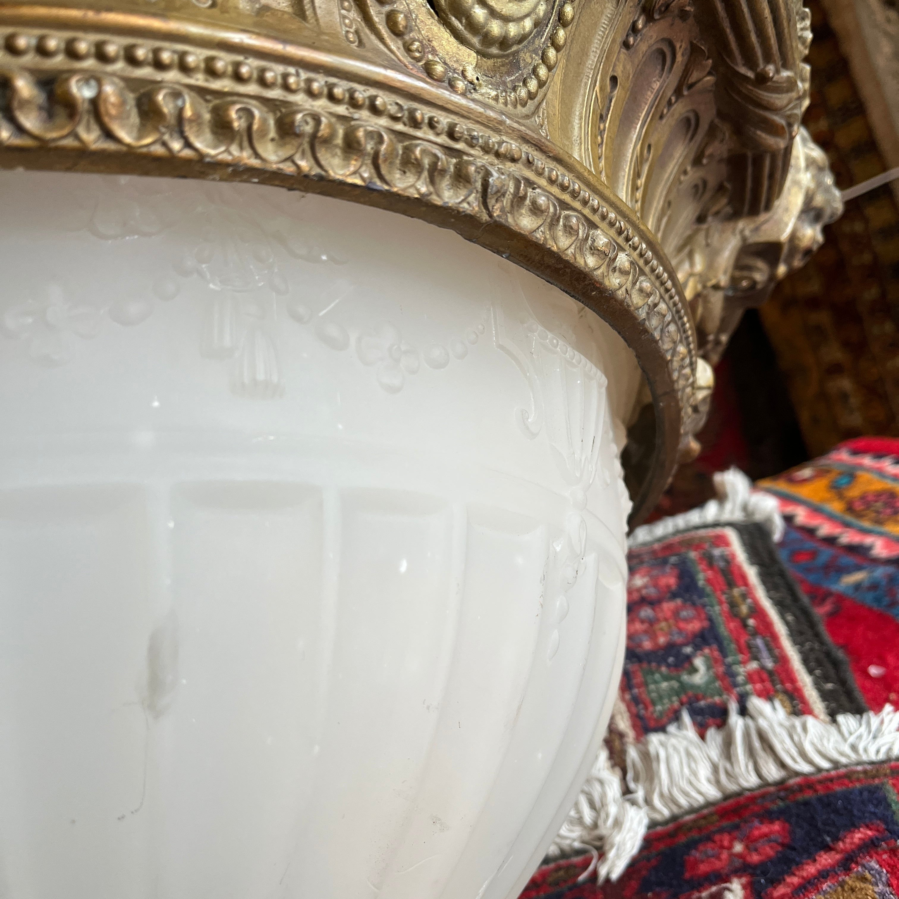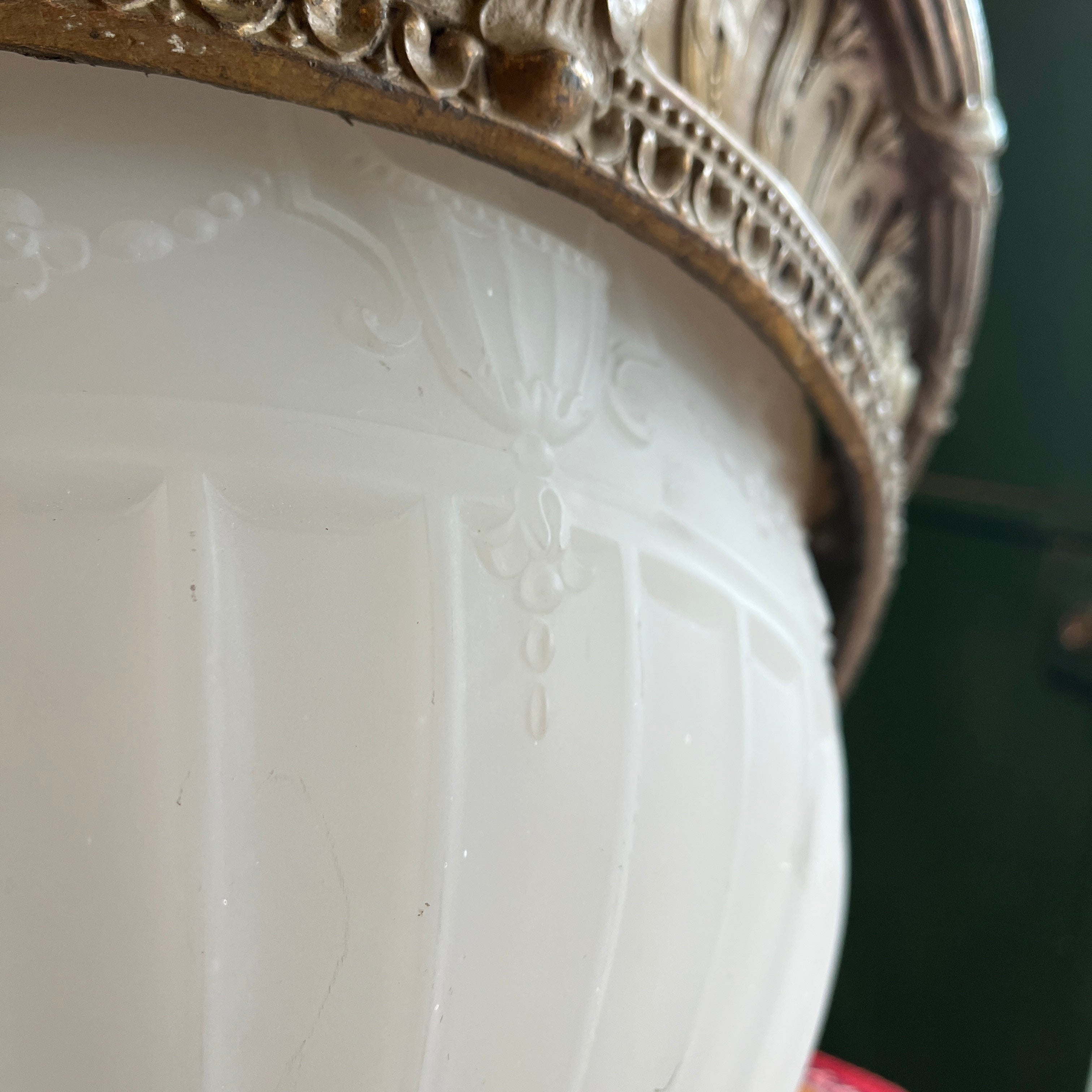 Llamativo plafón de origen y diseño francés estilo Luis XV, hecho de vidrio con relieves de guirnalda y estructura de bronce dorado, con decoraciones y rostros de querubines. La pieza tiene en el interior de su vidrio la frase "PAT. APL'D FOR", que significa "Patent Applied For" (patente solicitada), lo que indica que el diseño estaba en proceso de ser patentado en el momento de la fabricación.
