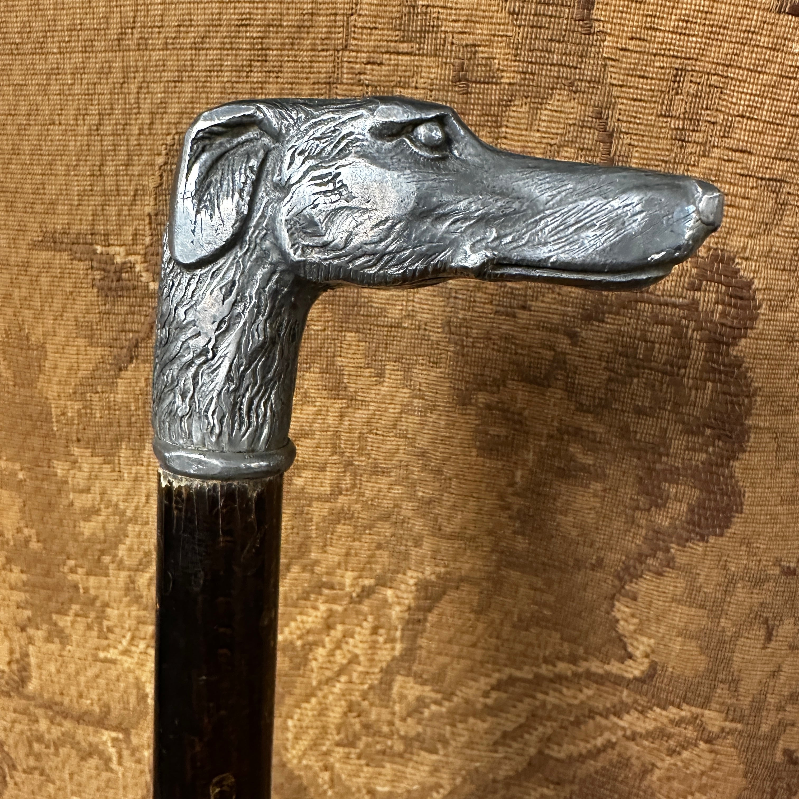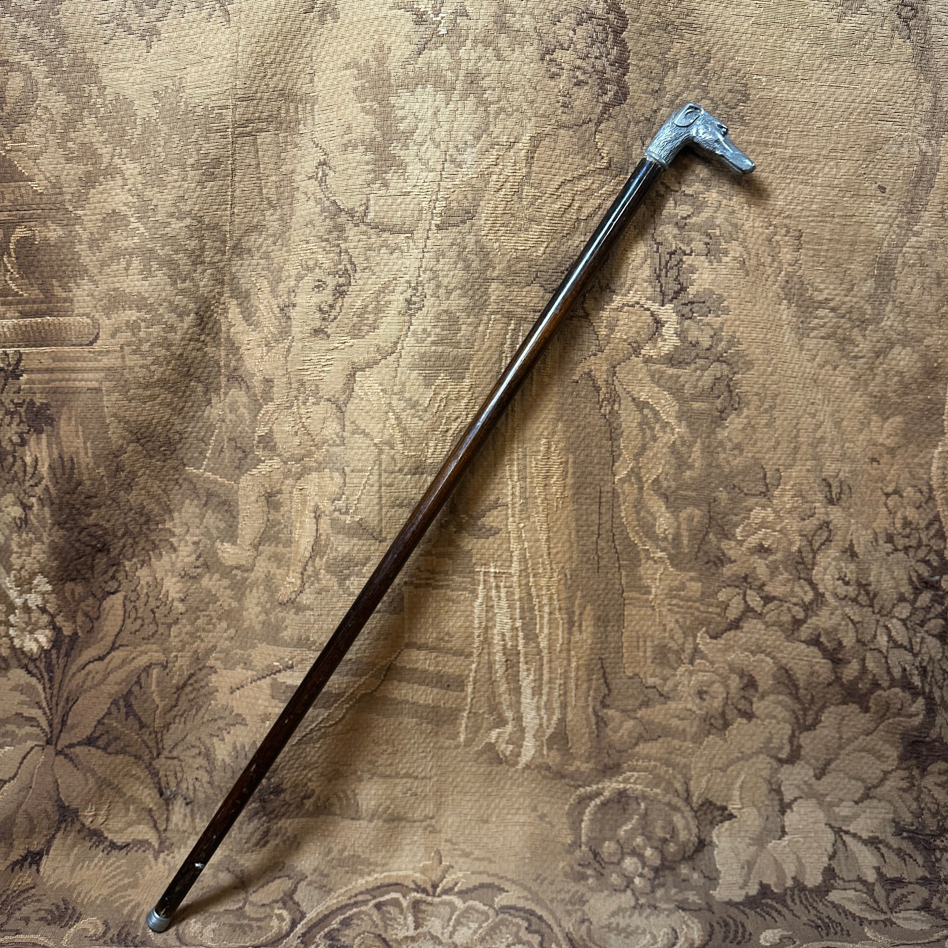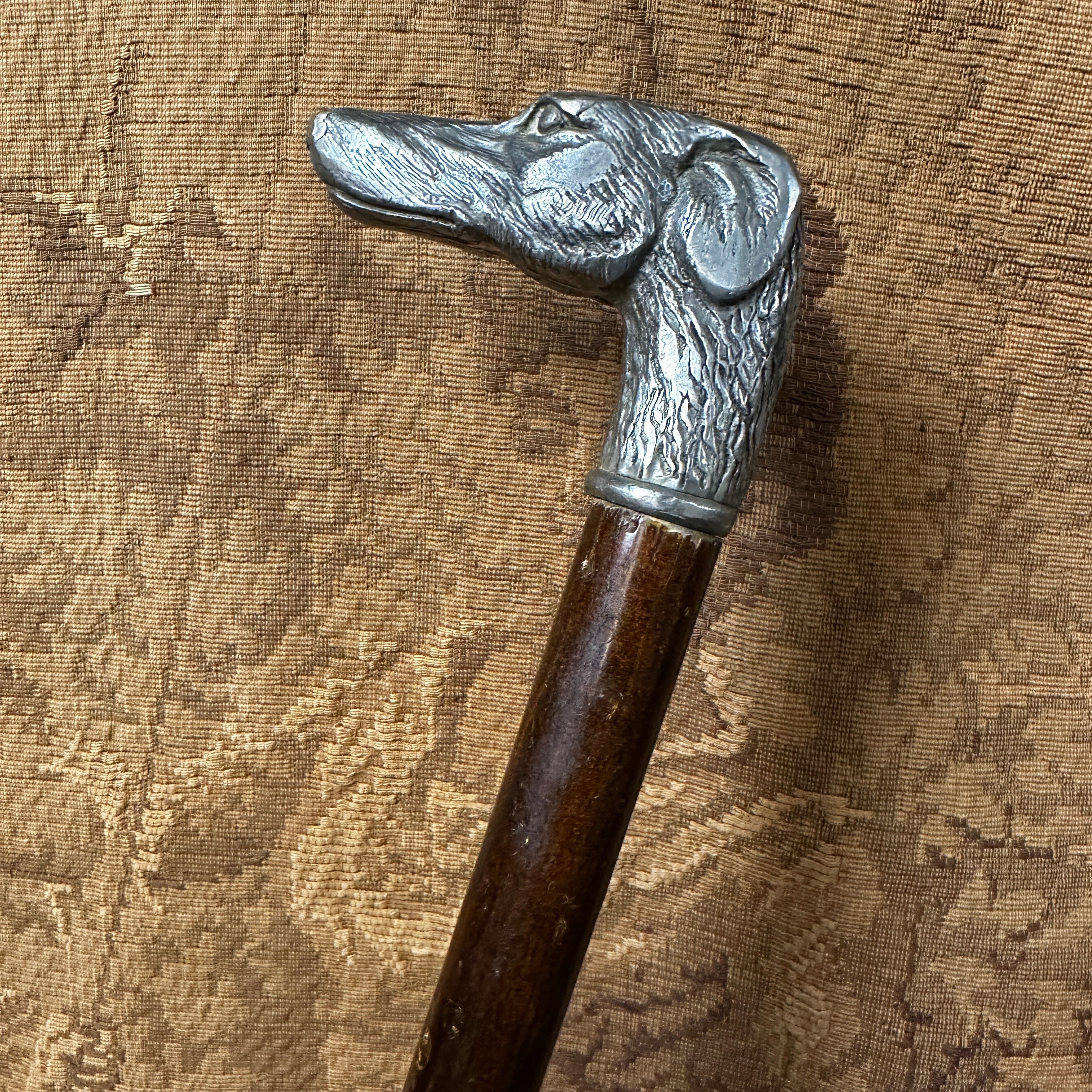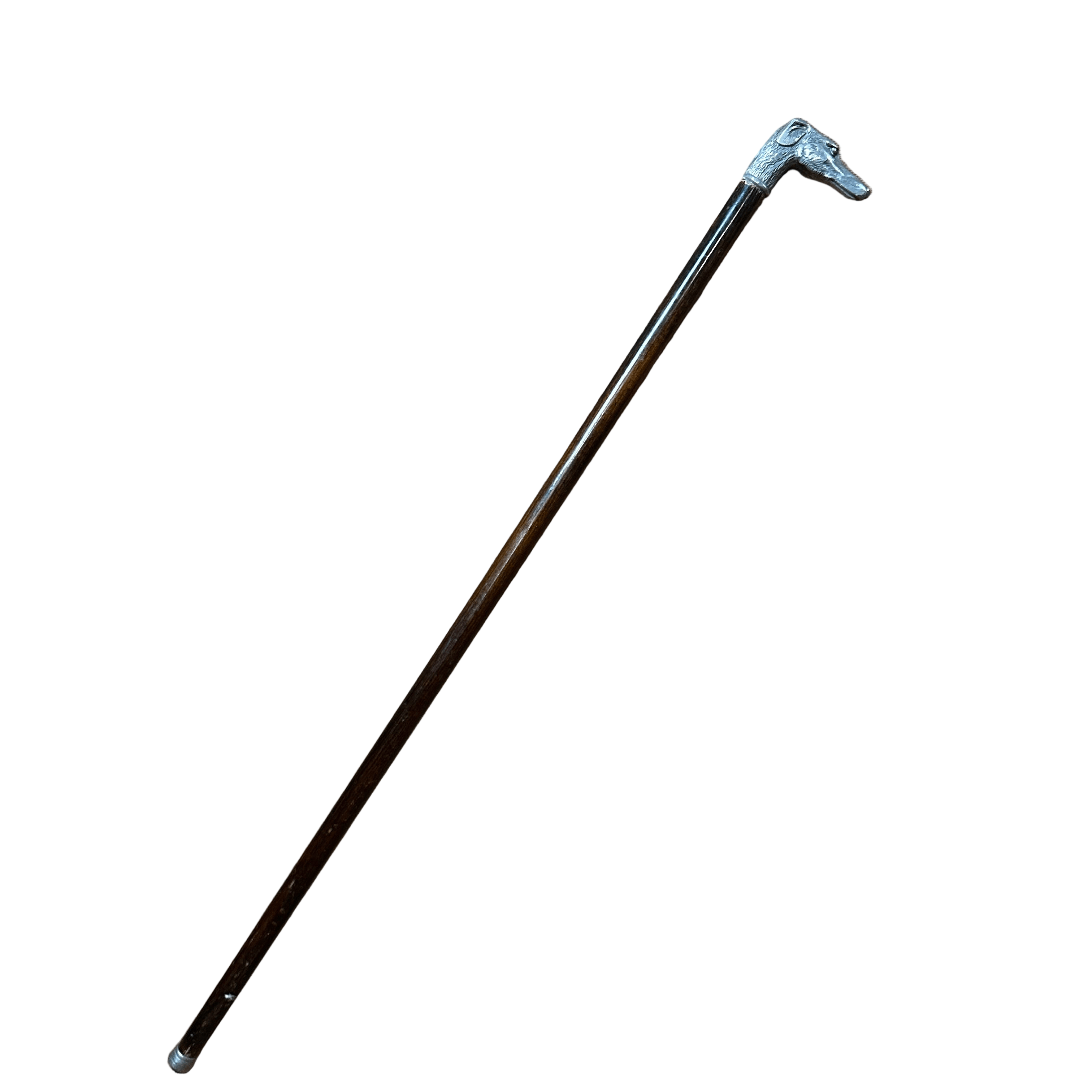 Elegante bastón de pino inglés con empuñadora en forma de perro galgo moldeada en estaño.