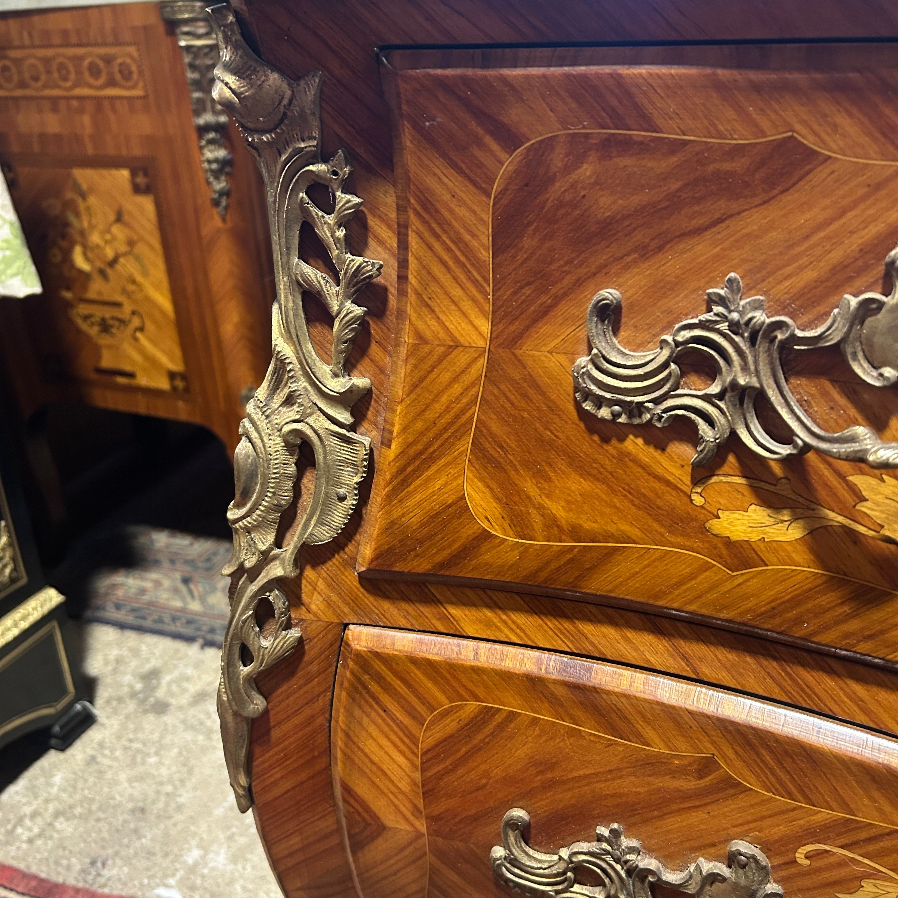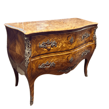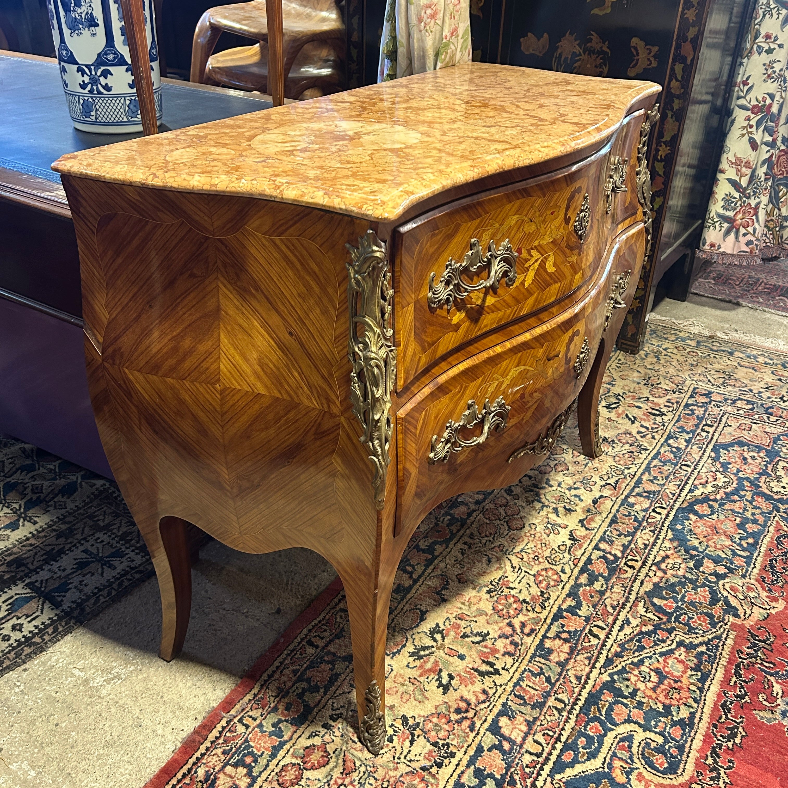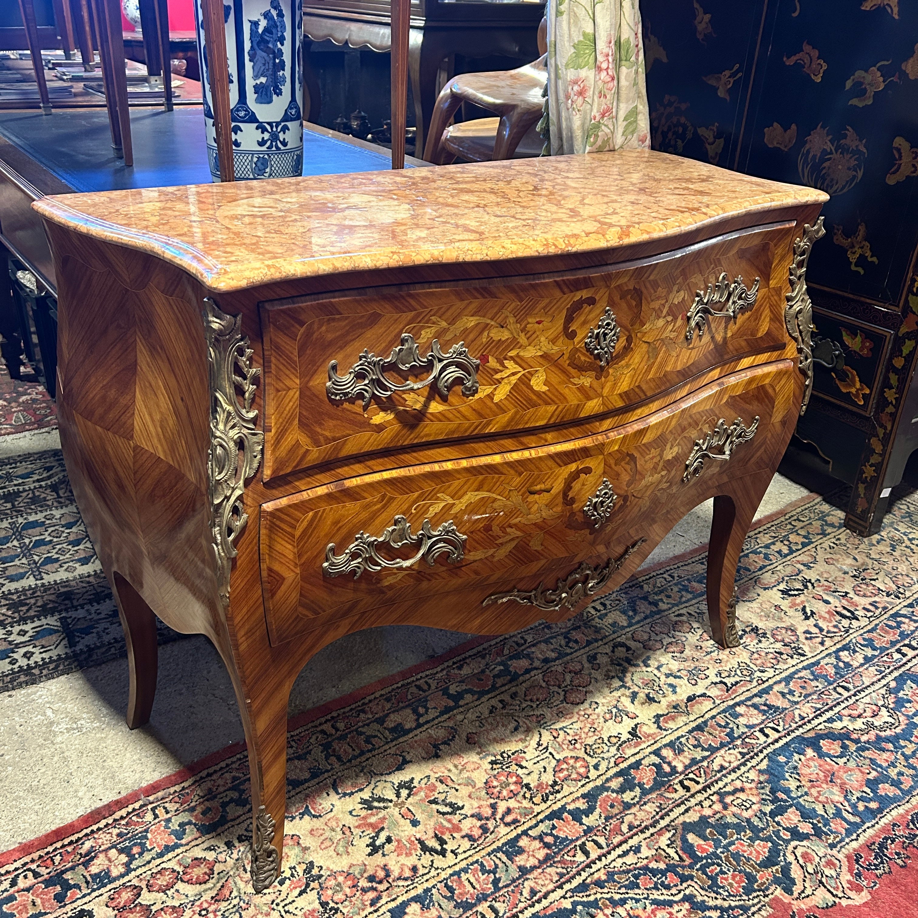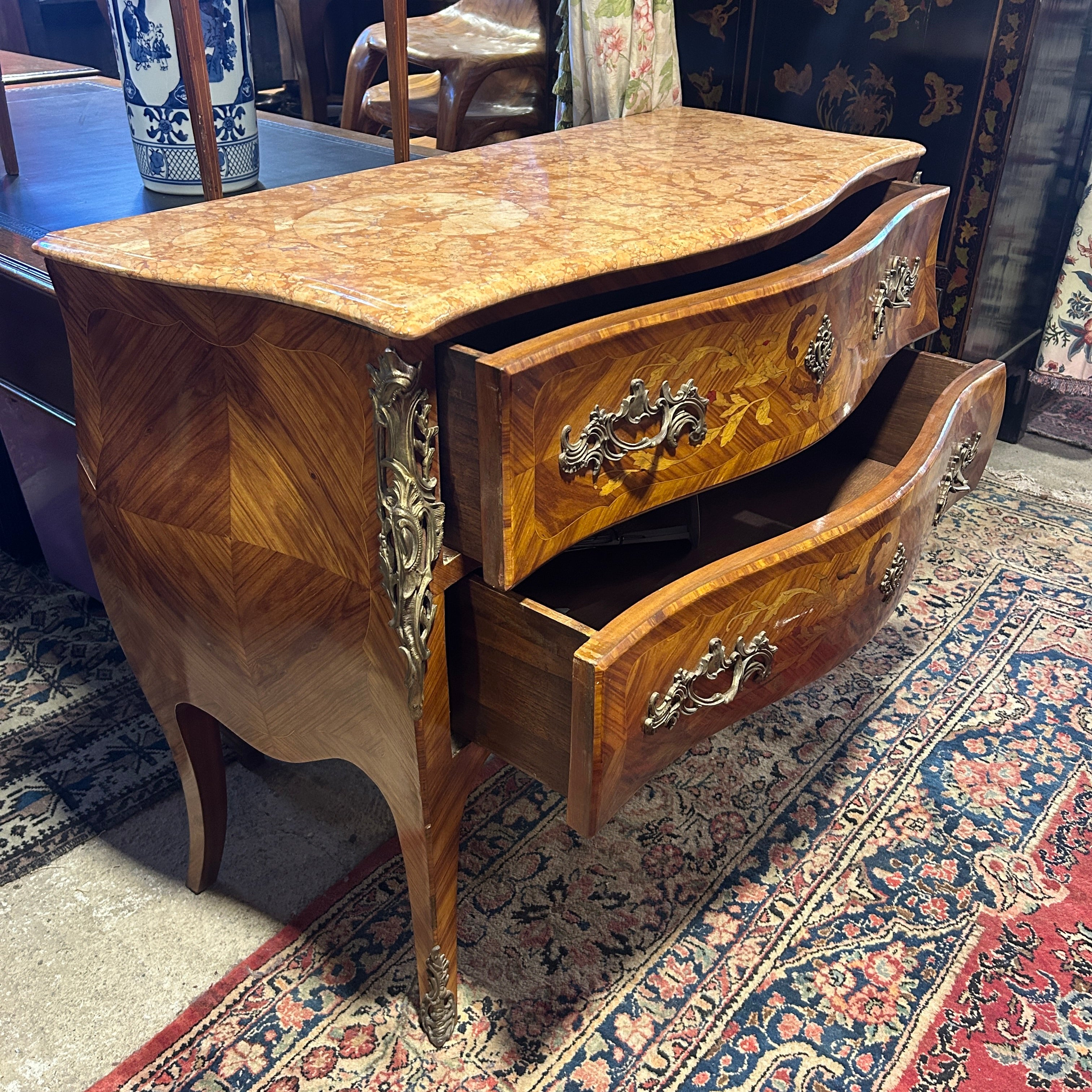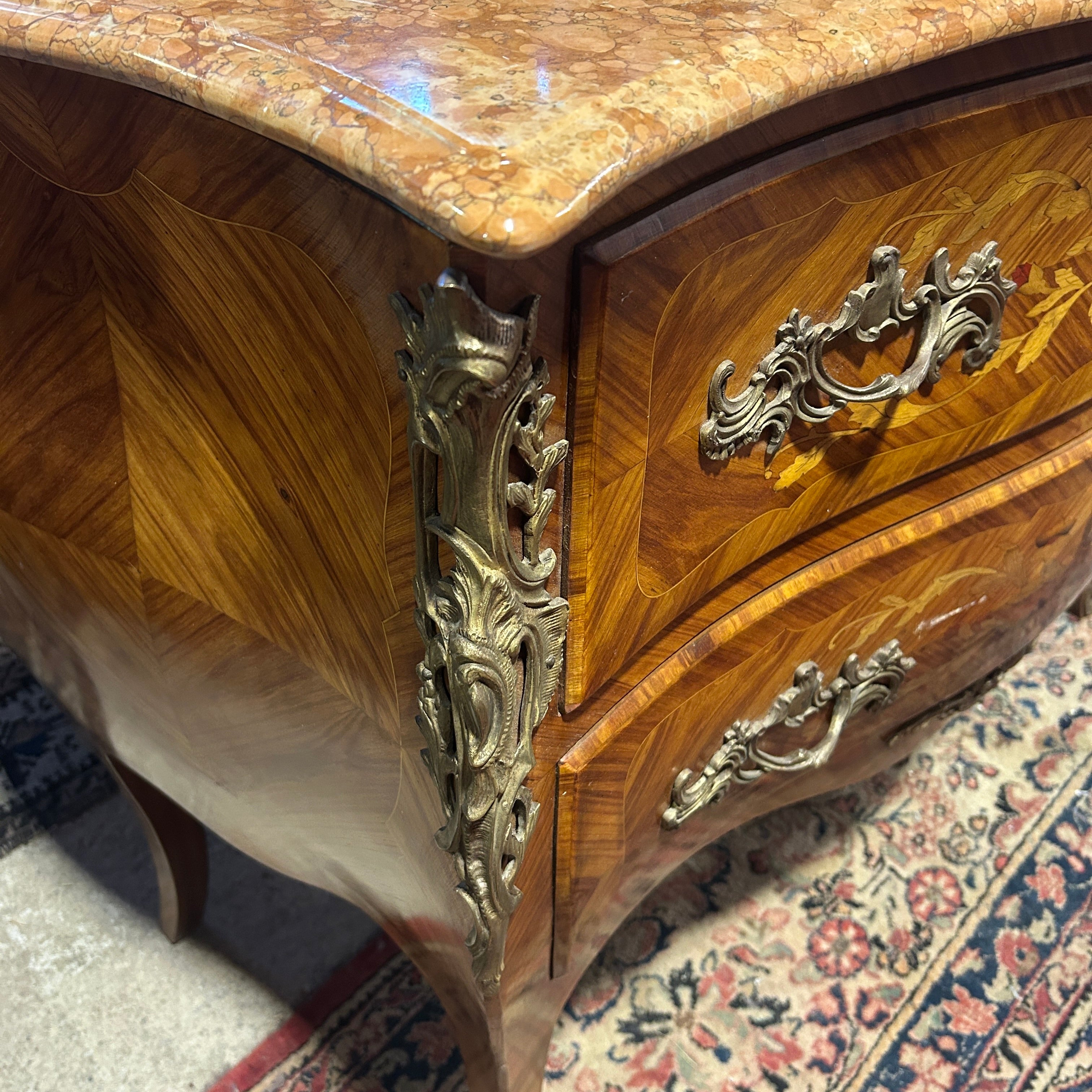 Espectacular cómoda de origen francés estilo Luis XV, hecha en madera enchapada en fina marquetería con motivos florales y parquetería en sus costados. La pieza tiene una cubierta de mármol con tonos anaranjados y una marca de caracol en su superficie, dos cajones, tiradores y aplicaciones en bronce.