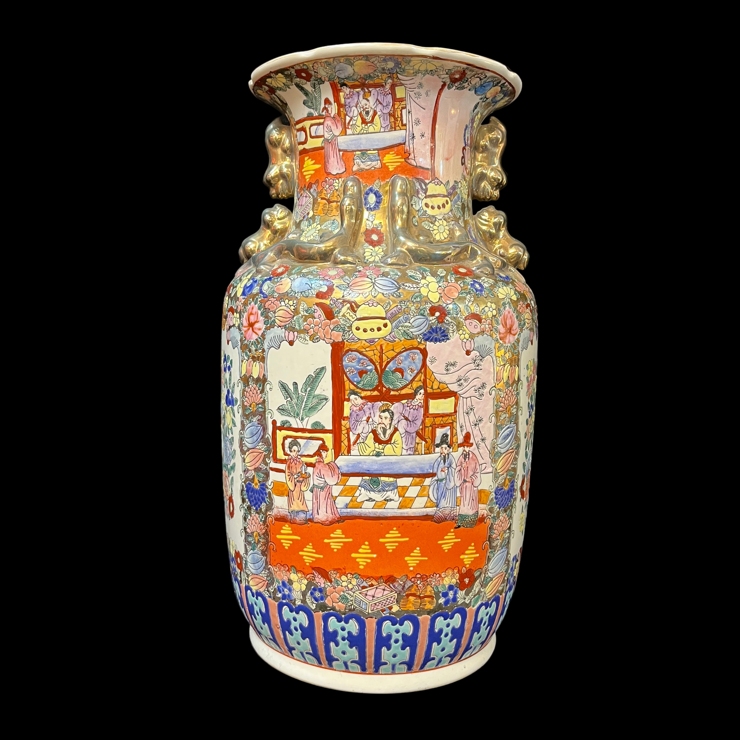 Imponente jarrón de porcelana china con molduras doradas. Presenta un diseño finamente trabajado representando un hogar de familia noble, con su jardín y sirvientes. El sello de fabricación está en la base.