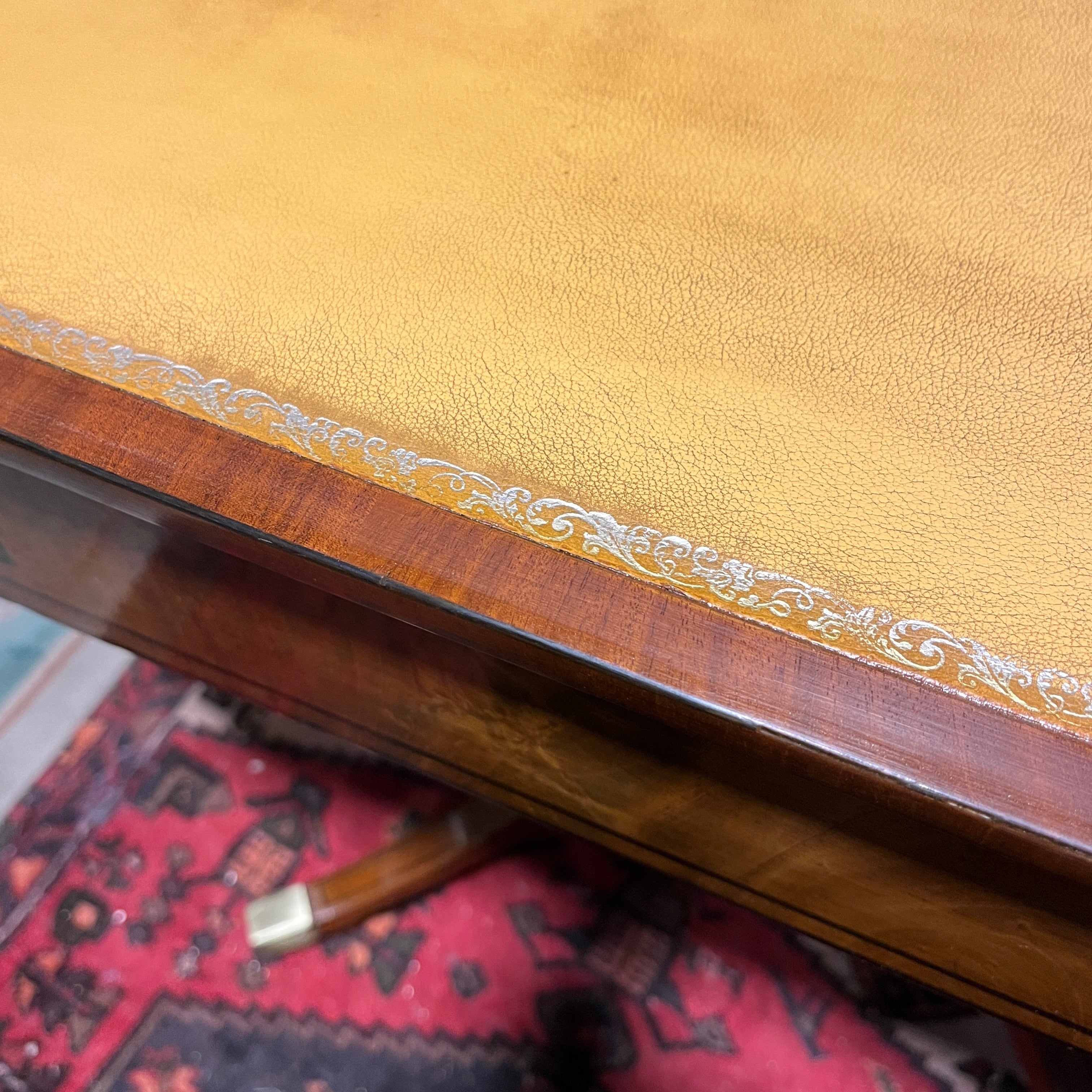 Elegante mesa de juego francesa en caoba rubia satinada, raíz y palma de caoba. Cuenta con fileteado de marqueteria en las patas y contornos, aplicaciones de bronce, patas retráctiles con ruedas y cubierta de cuero color crema con ruleteado dorado.