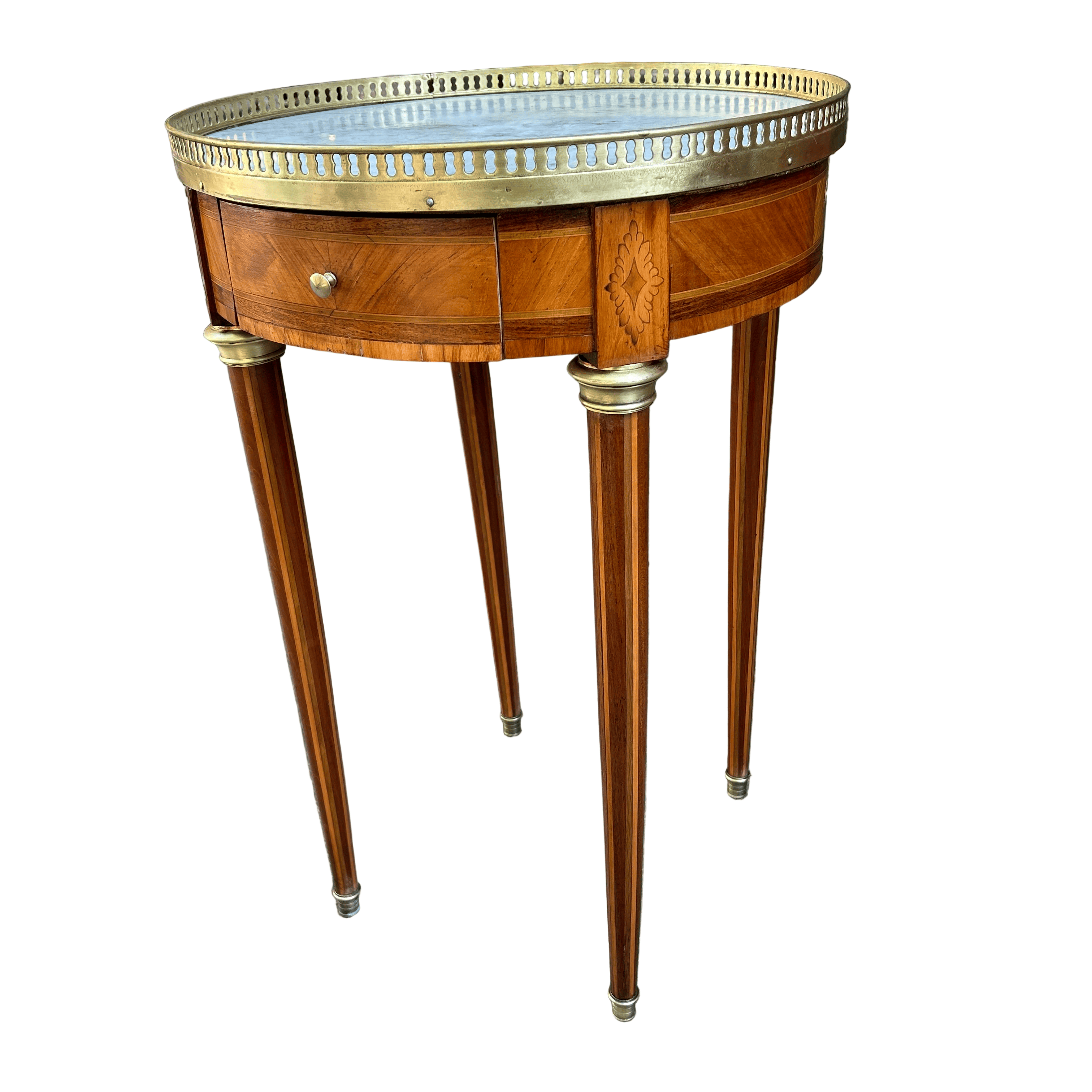Elegante mesa de apoyo de origen francés estilo Luis XVI, de madera enchapada, marquetería floral en cada una de sus patas, tiradores, tacos, aplicaciones y cintillo de bronce. La mesa tiene una cubierta de mármol blanco veteado y un cajón frontal. Francia, s.XIX.