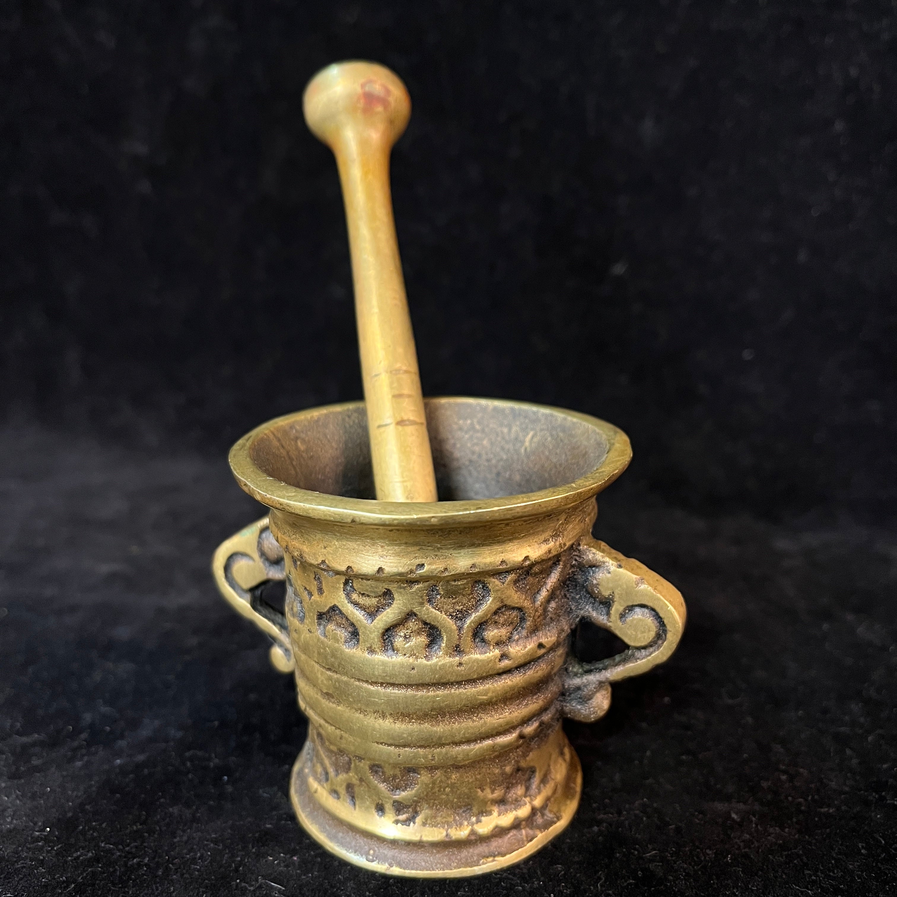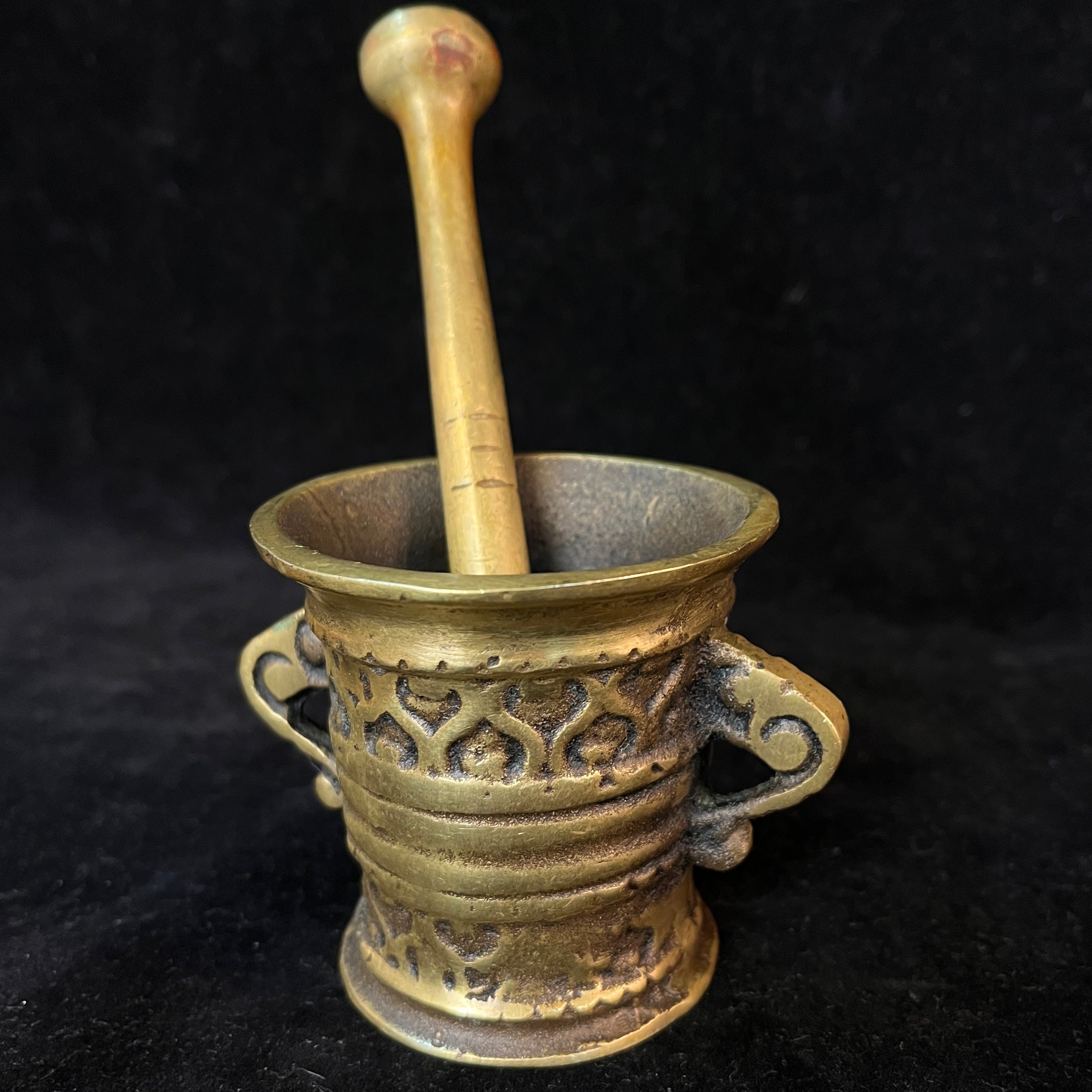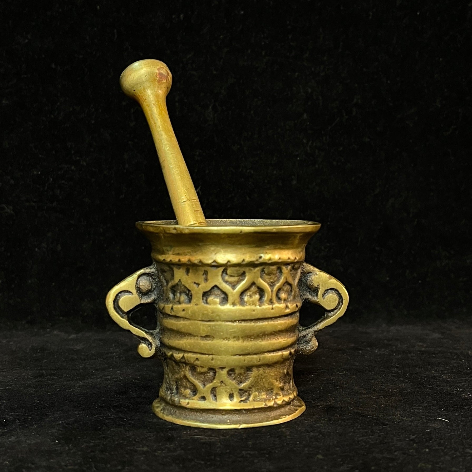 Elegante mortero de bronce de origen francés, decorado con delicados relieves de patrones curvilíneos que se repiten armoniosamente en su superficie. Sus dos asas, finamente talladas, realzan su estructura y aportan un toque distintivo y sofisticado. Una pieza única que refleja el refinamiento del diseño clásico europeo.