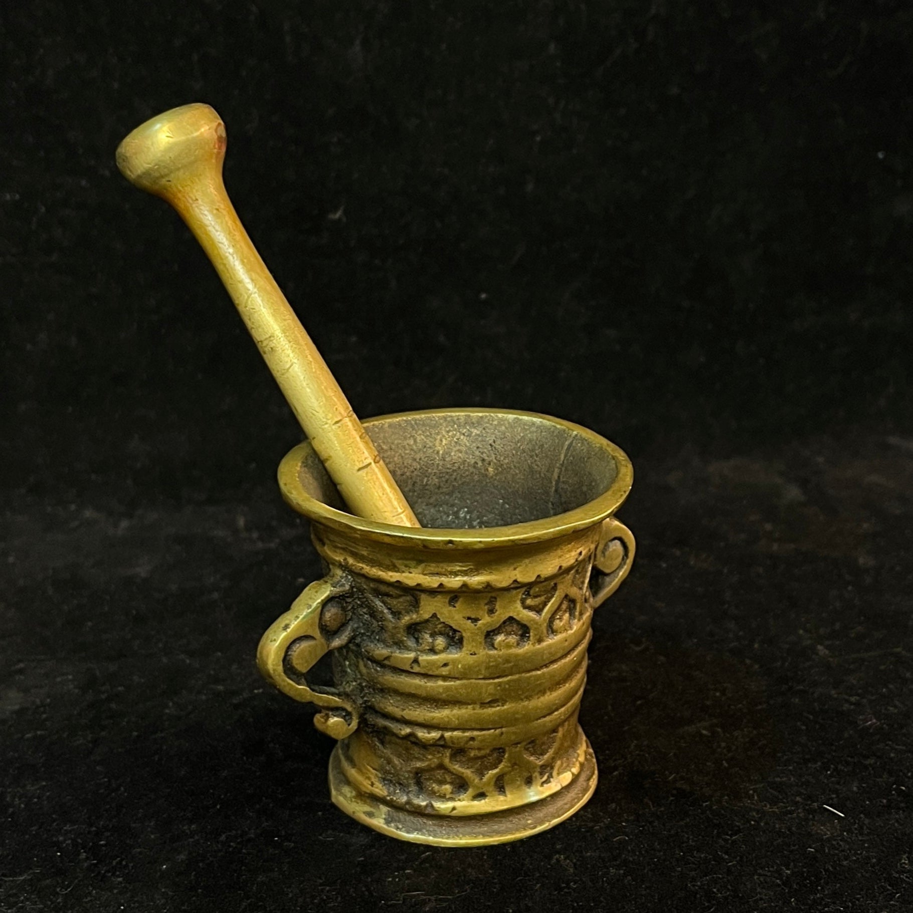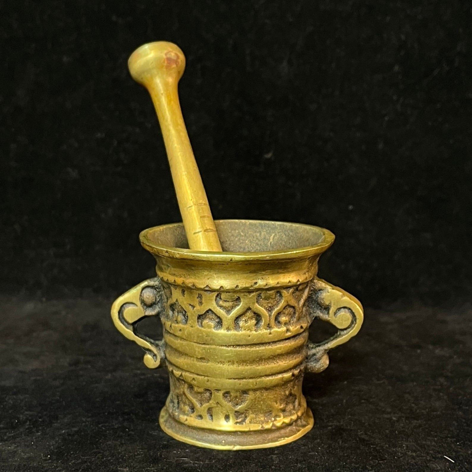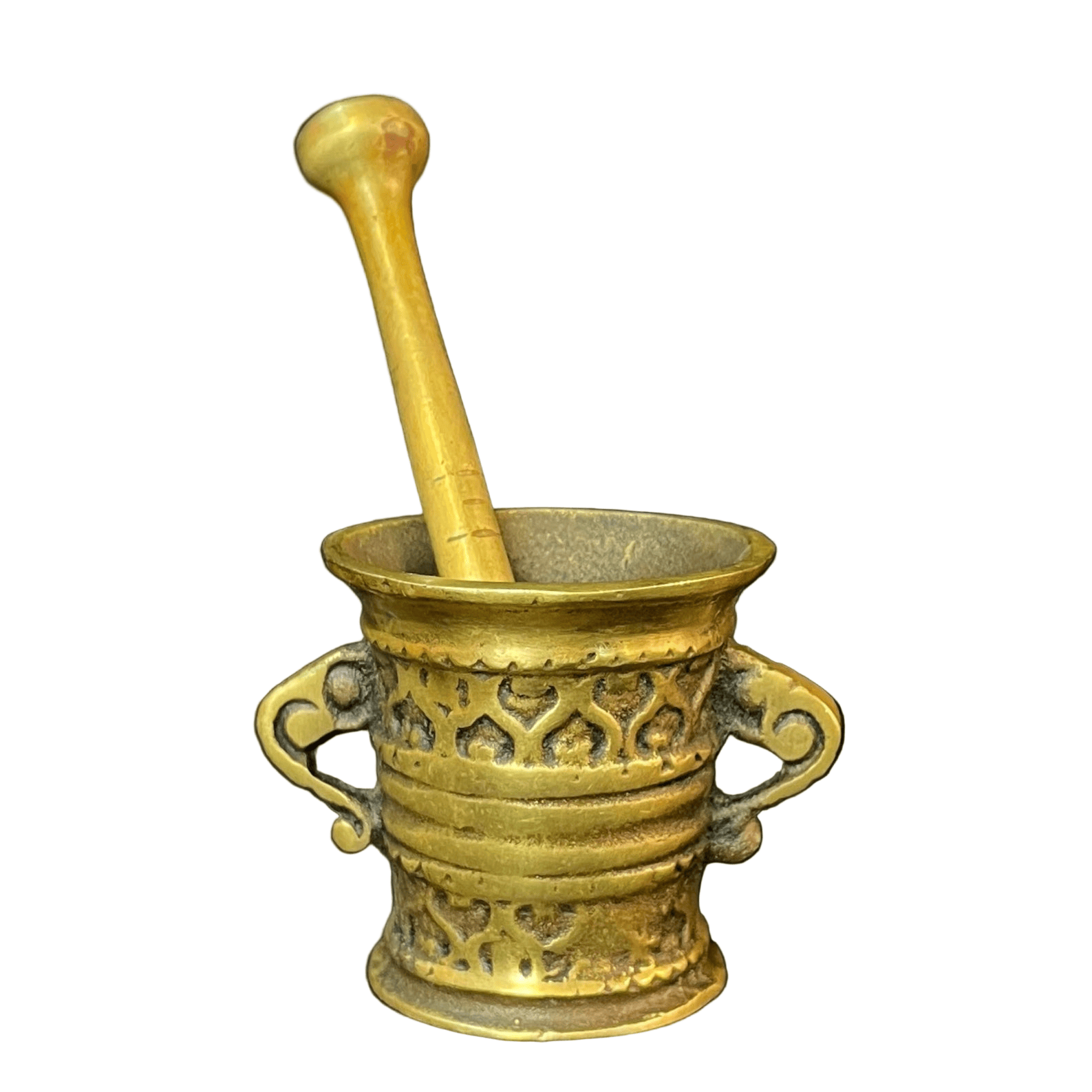 Elegante mortero de bronce de origen francés, decorado con delicados relieves de patrones curvilíneos que se repiten armoniosamente en su superficie. Sus dos asas, finamente talladas, realzan su estructura y aportan un toque distintivo y sofisticado. Una pieza única que refleja el refinamiento del diseño clásico europeo.