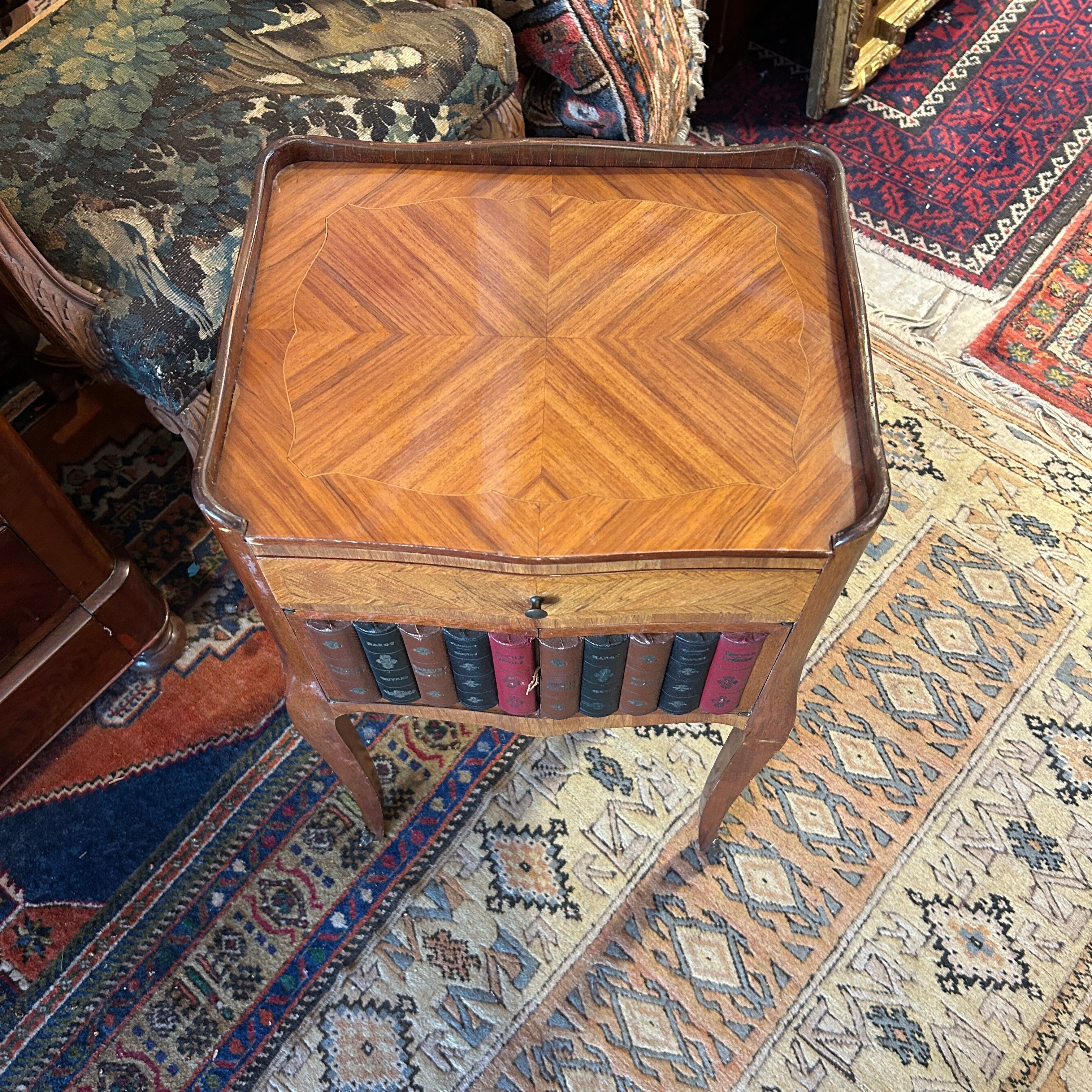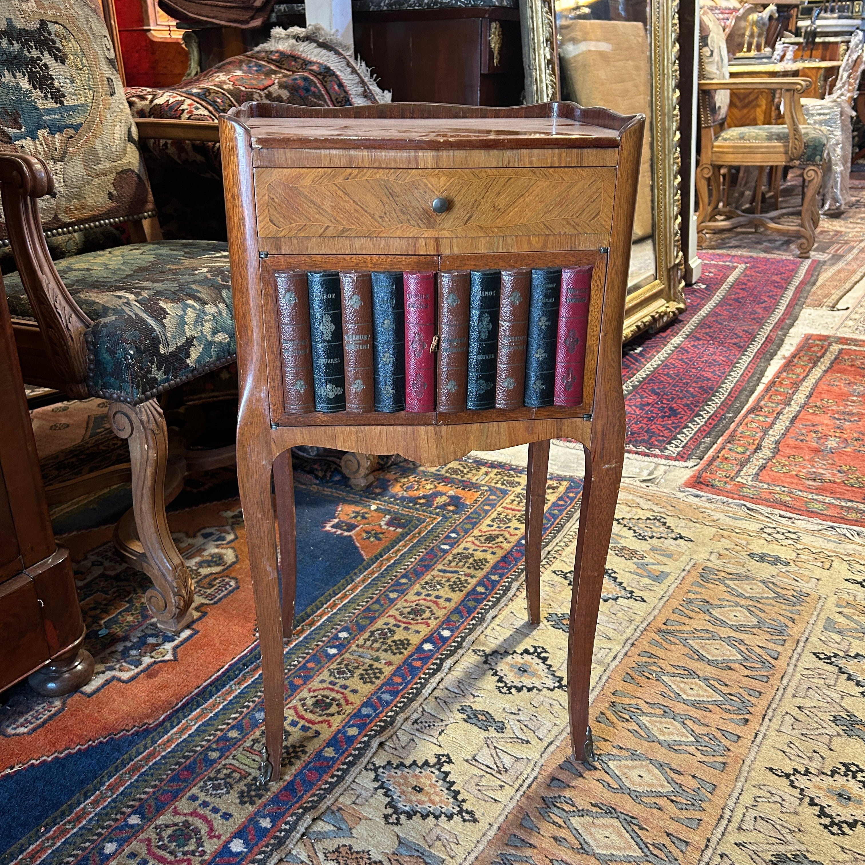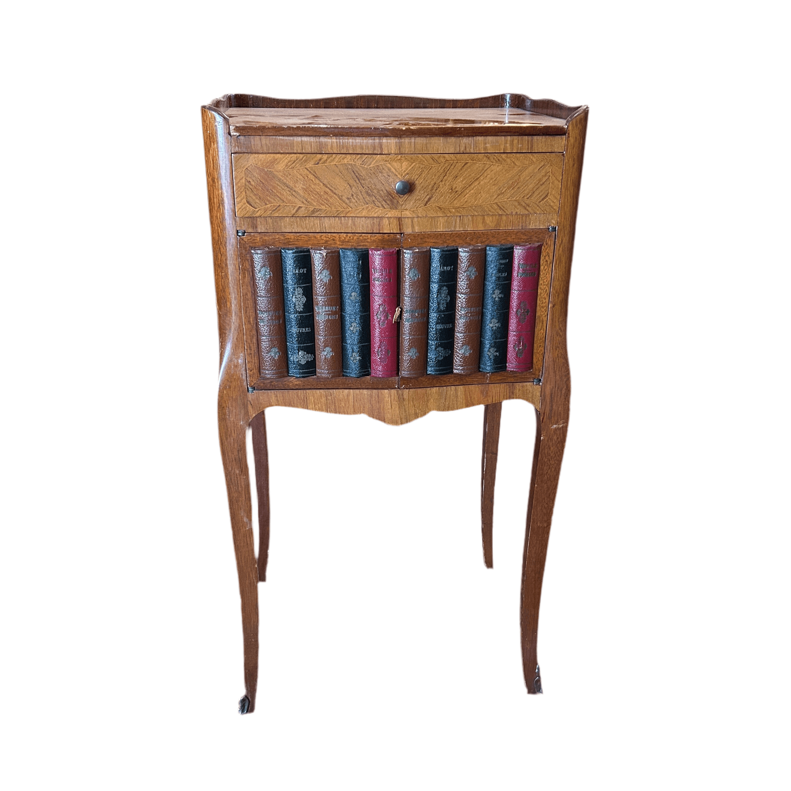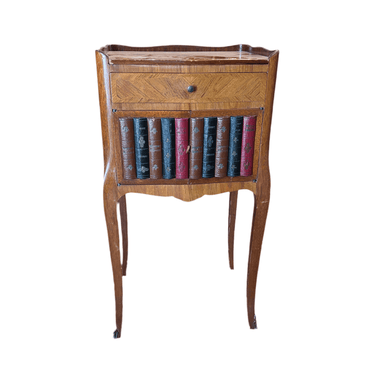 Velador de origen francés estilo Luis XVI, hecho de madera enchapada. La pieza tiene un cajón y dos compuertas, cubiertas con lomos de libros, que dan acceso a un espacio de almacenaje.