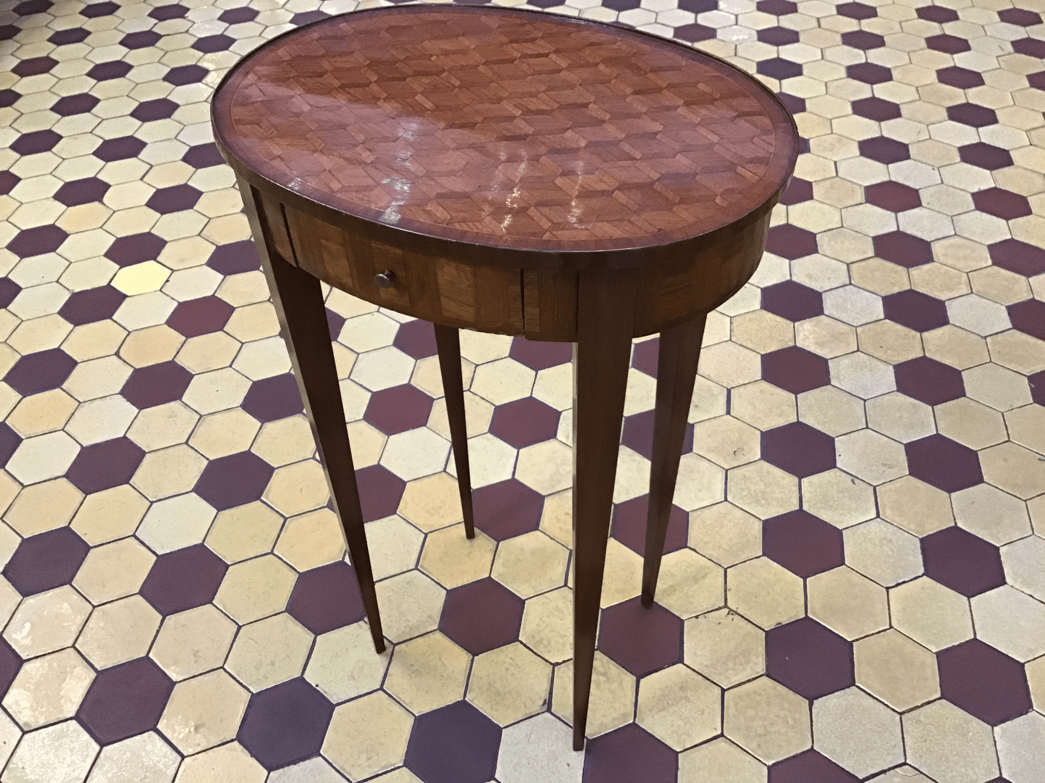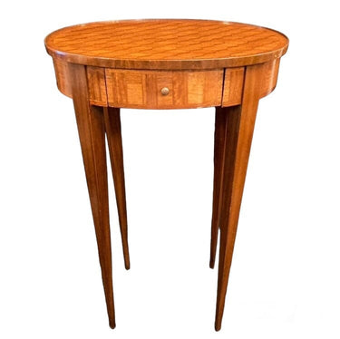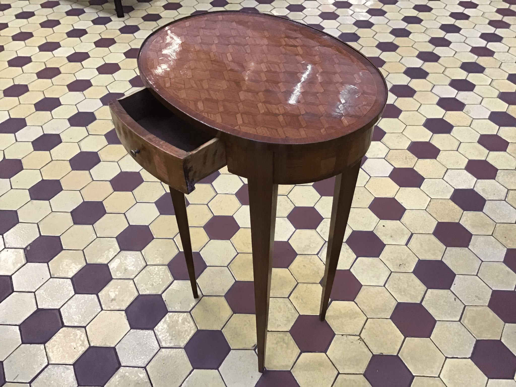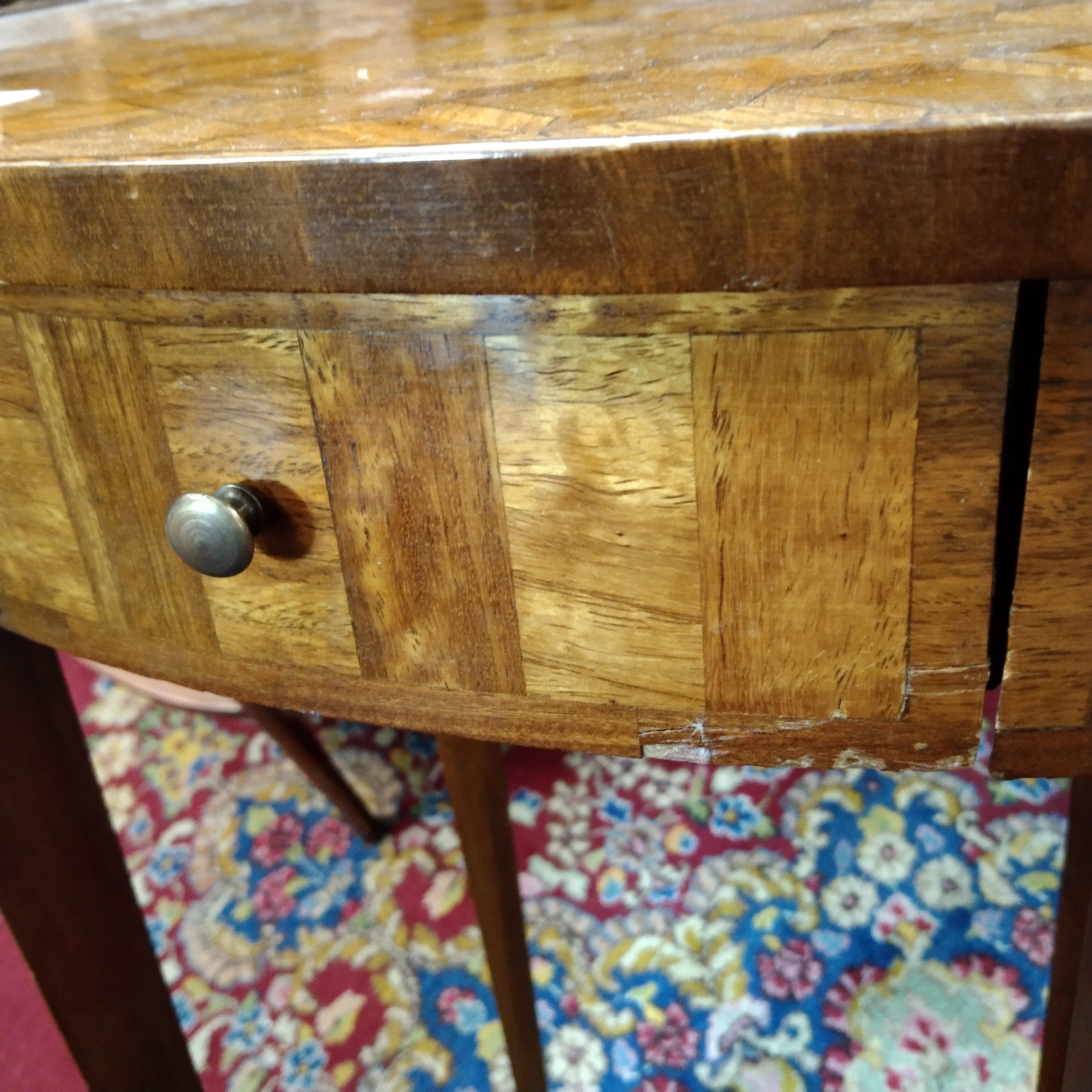 Mesa lateral en madera de nogal. Puede funcionar como mesa auxiliar o de apoyo, brindando versatilidad a los espacios. Cuenta con un cajón y marquetería geométrica en la cubierta.