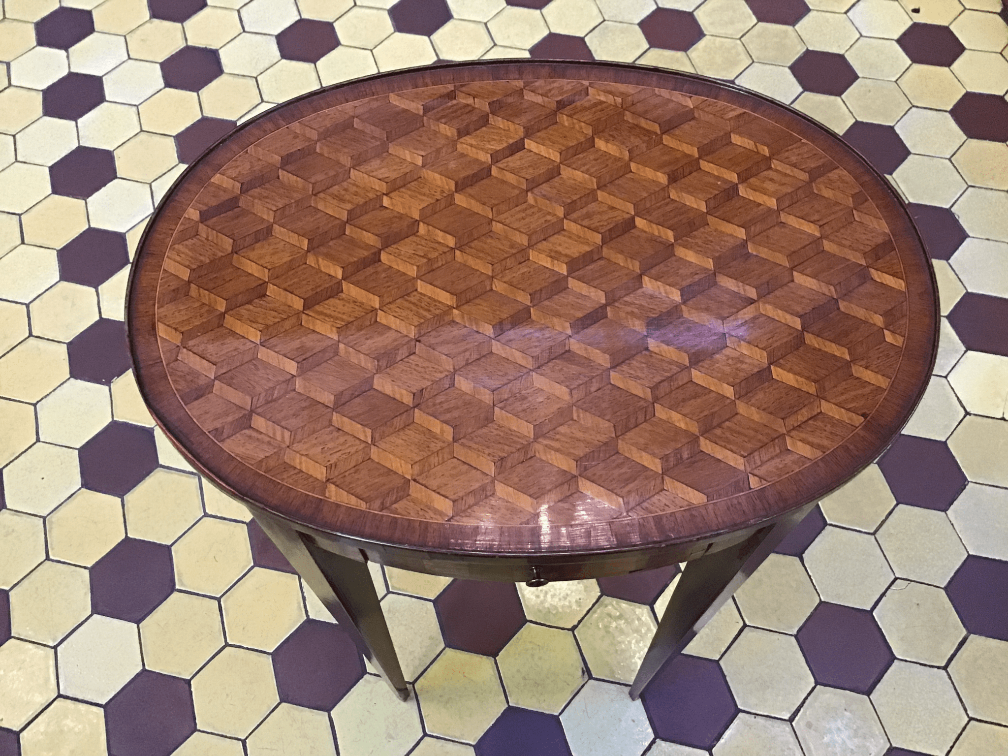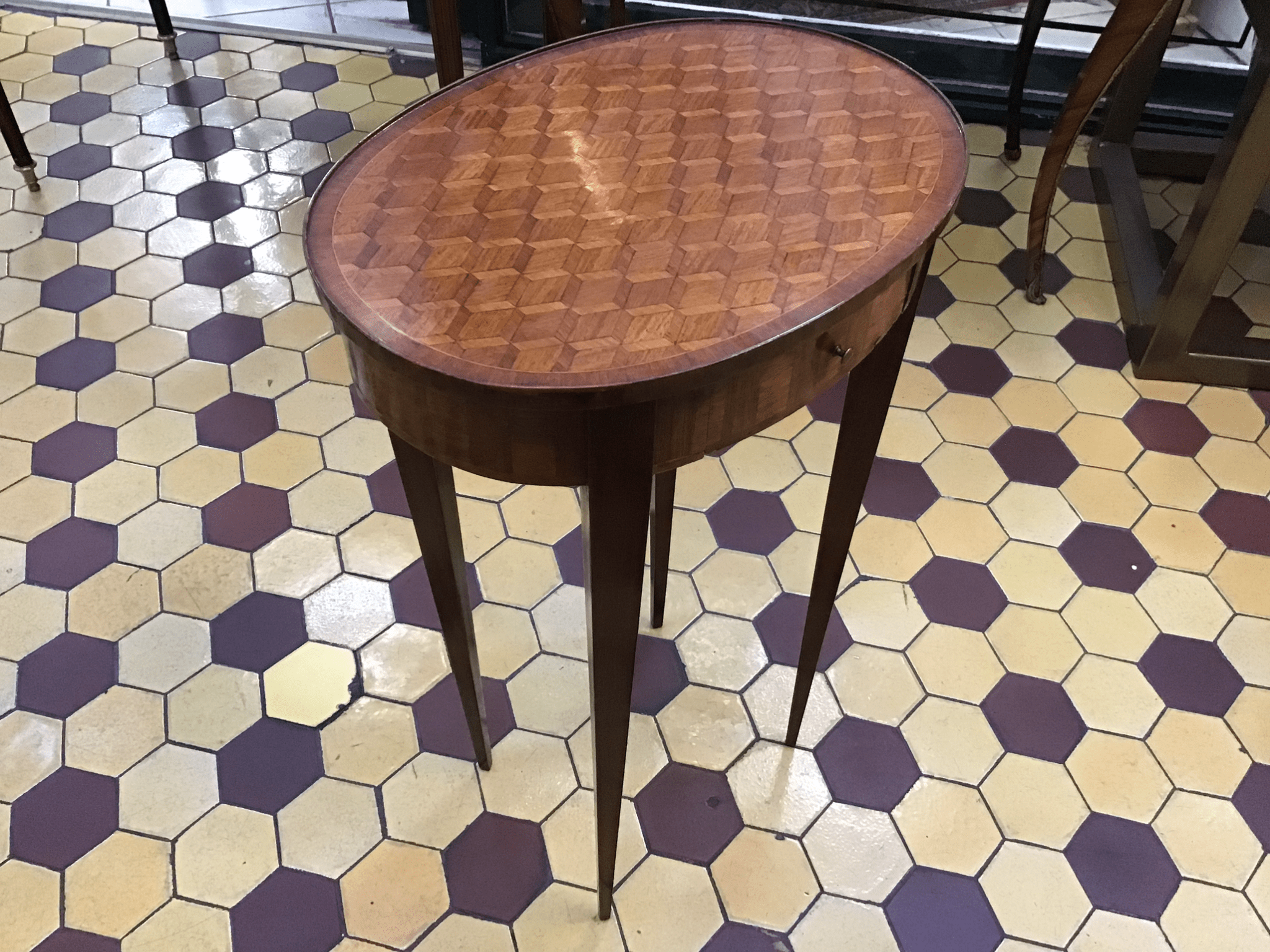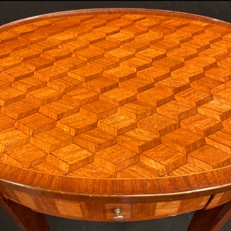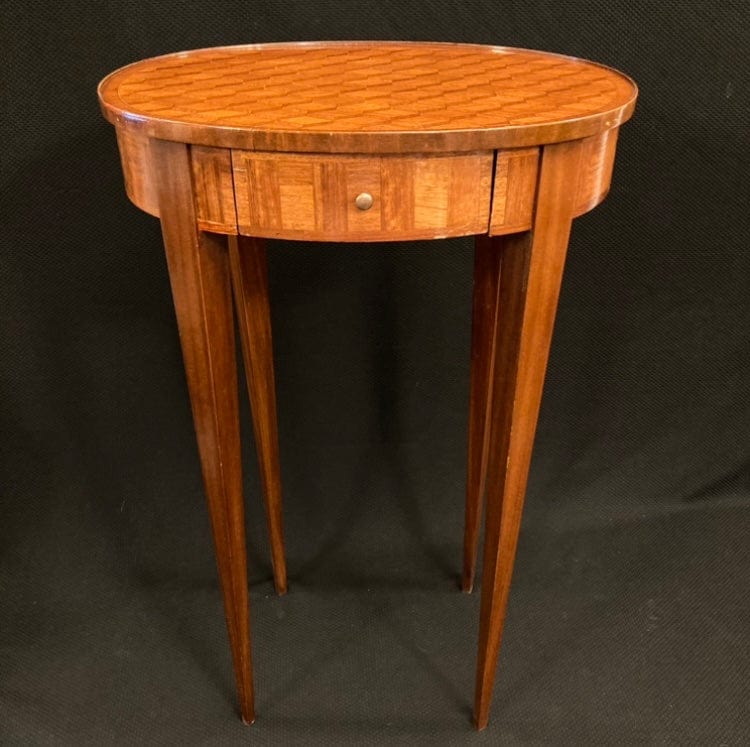 Mesa lateral en madera de nogal. Puede funcionar como mesa auxiliar o de apoyo, brindando versatilidad a los espacios. Cuenta con un cajón y marquetería geométrica en la cubierta.