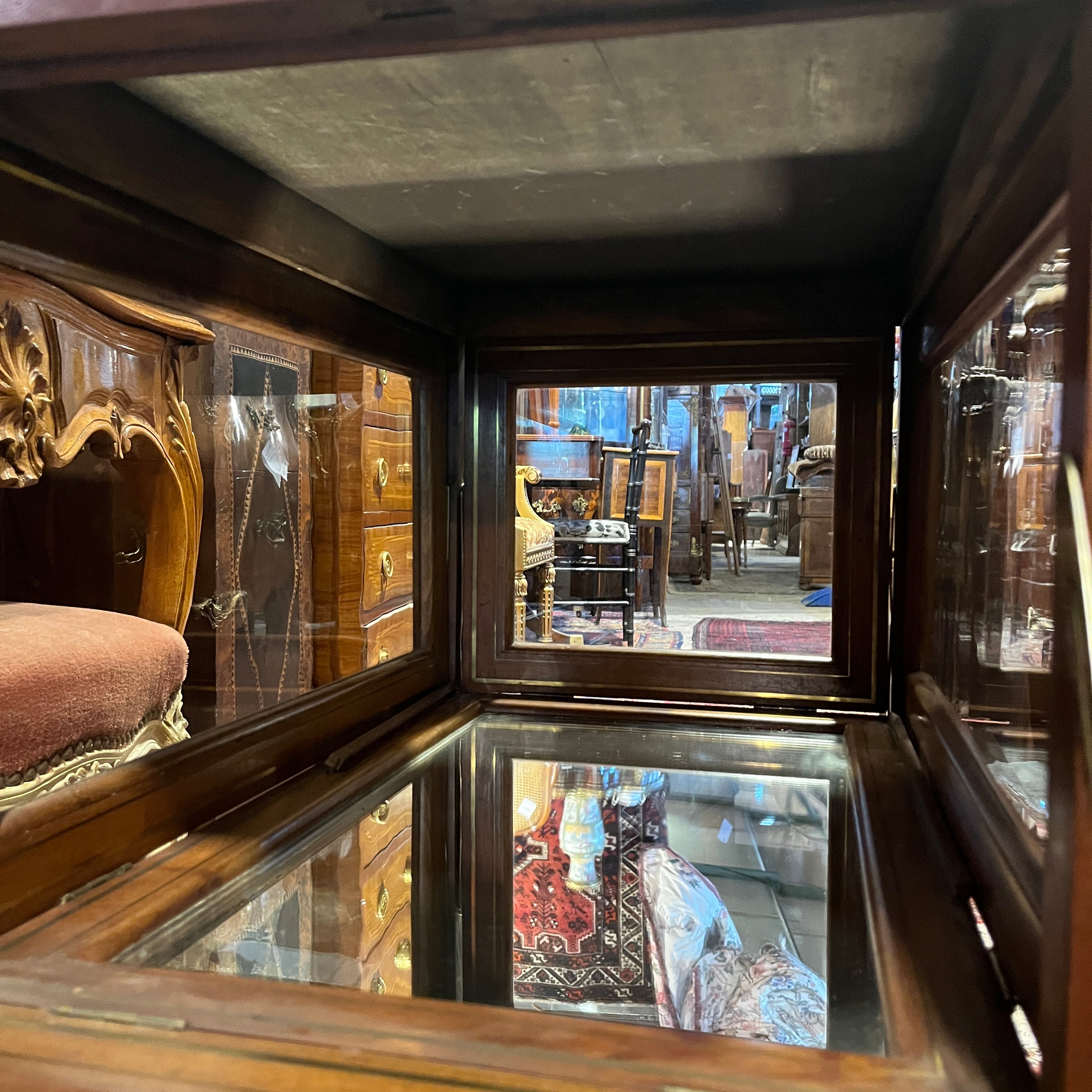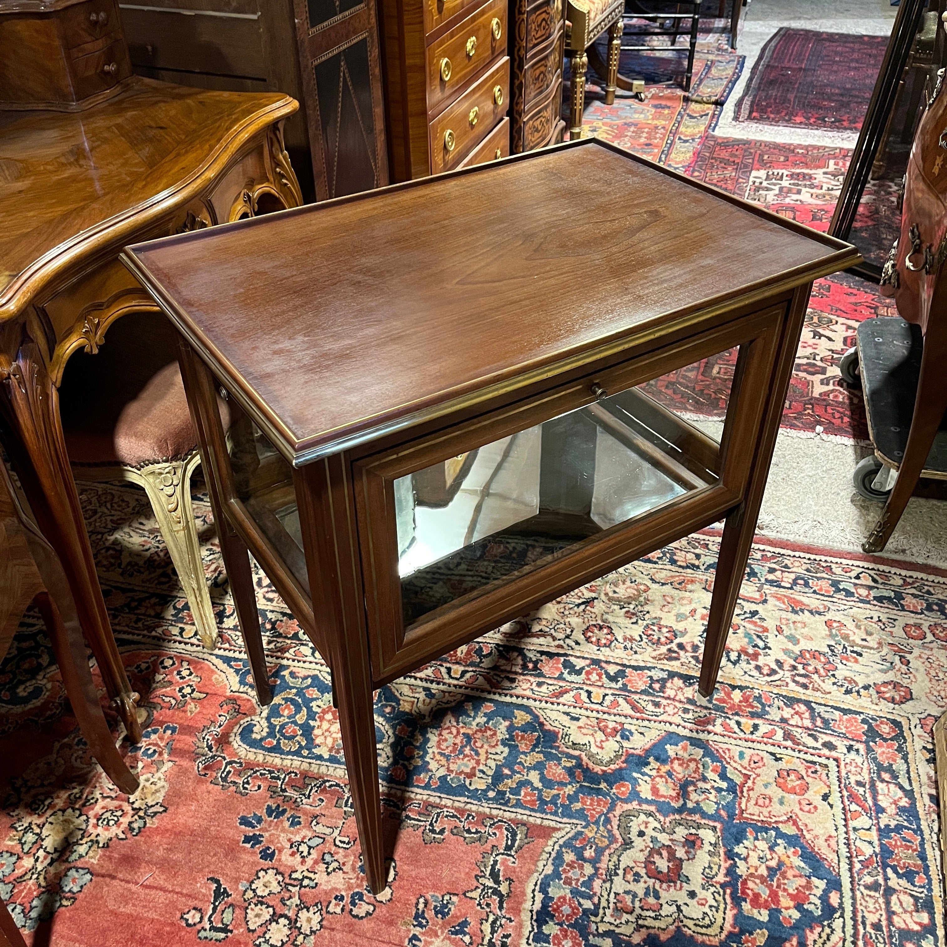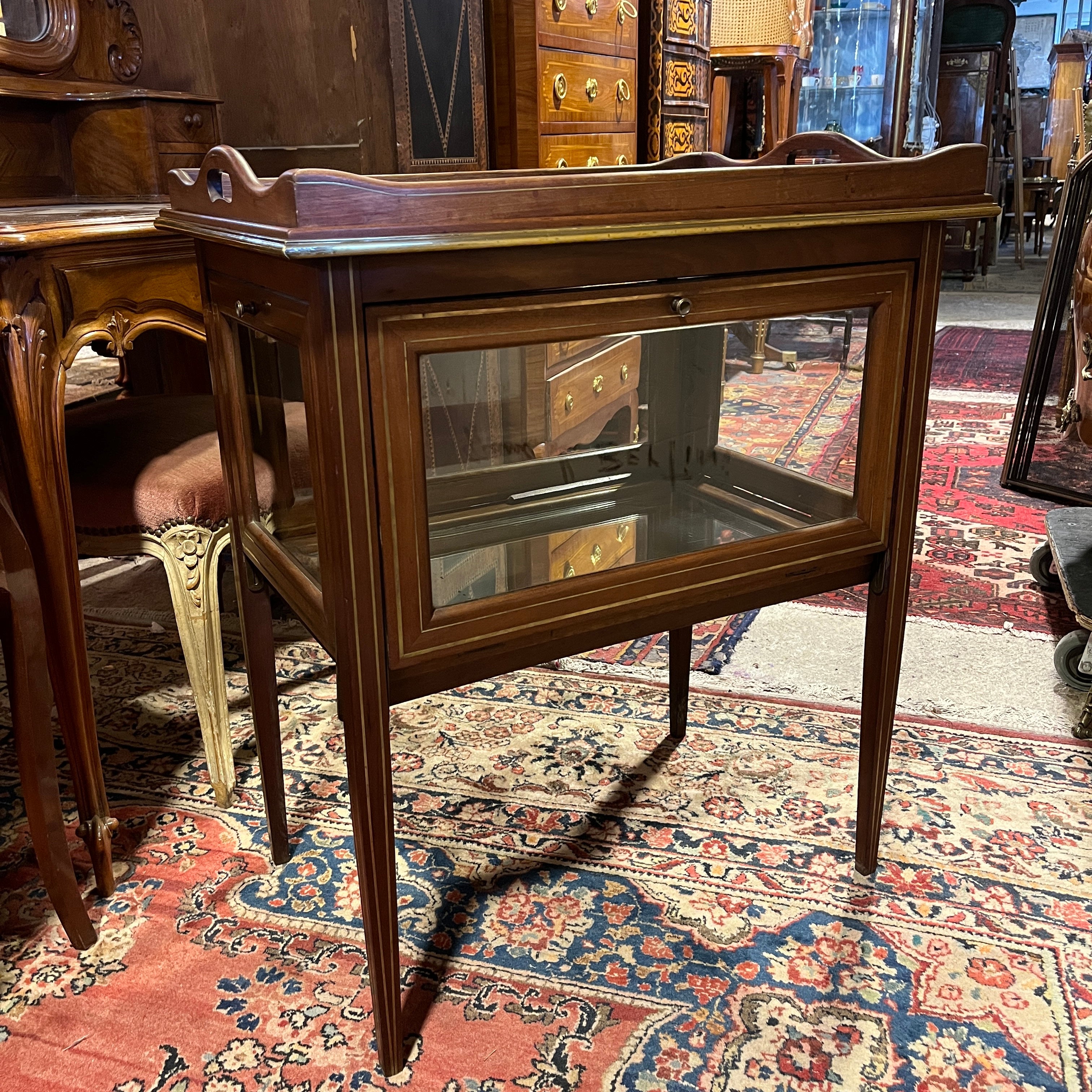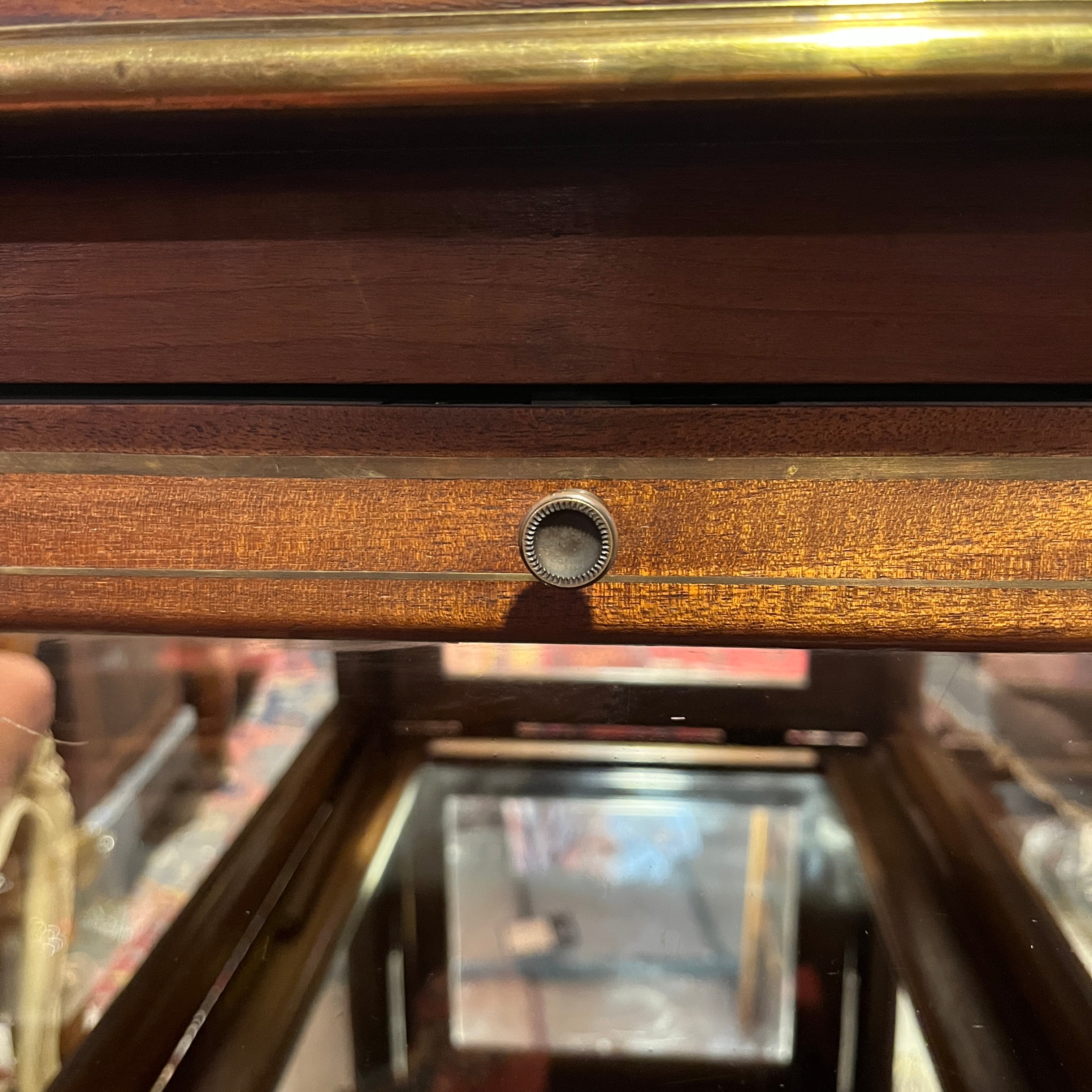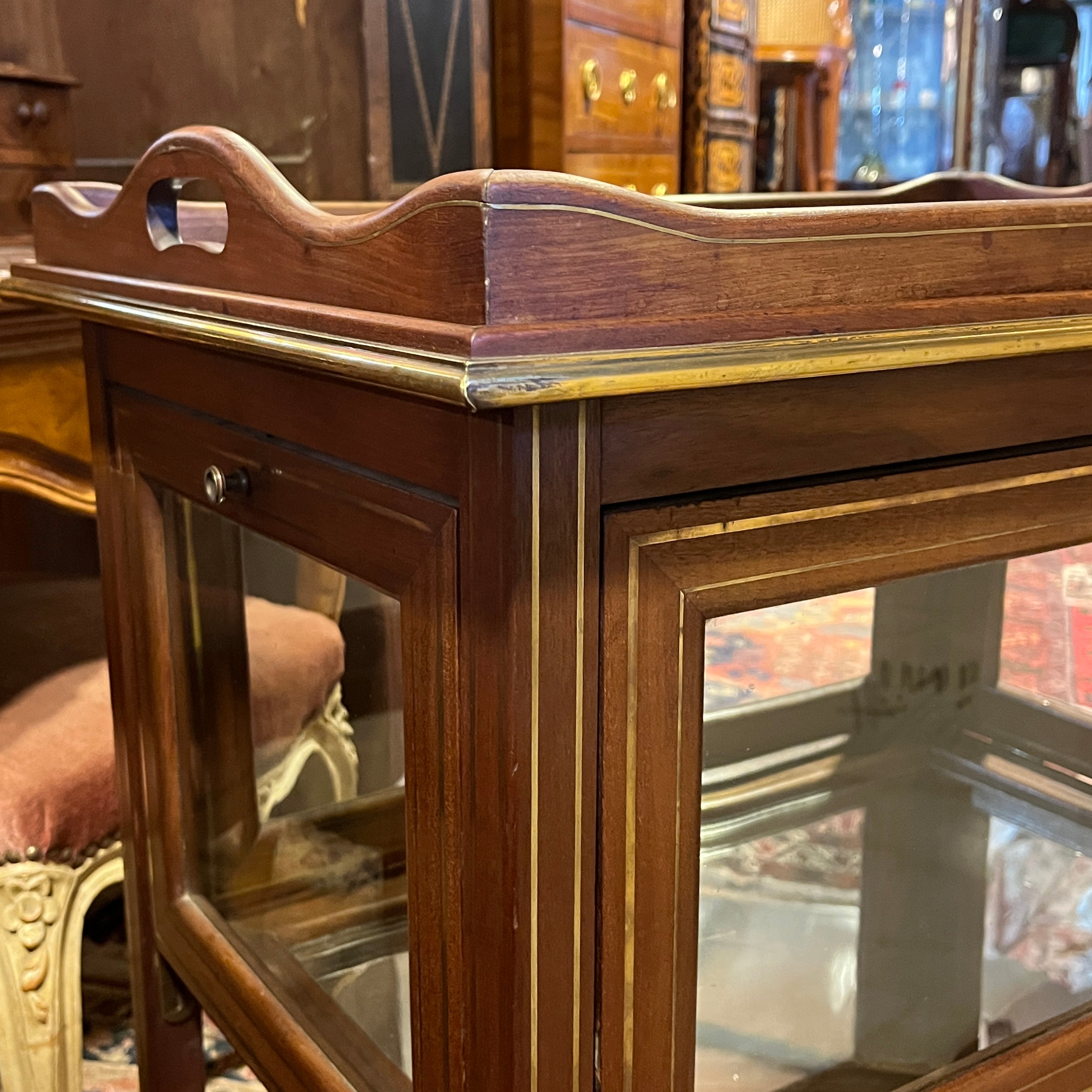 Carro de té de origen inglés estilo Edwardian, hecho de madera de caoba con filete de incrustación en bronce, incluyendo la bandeja. La pieza tiene 4 compuertas con tiradores en bronce y superficie de vidrio, que caen mediante sus bisagras y que permiten ver los objetos en el interior, terminado con un espejo en su superficie.