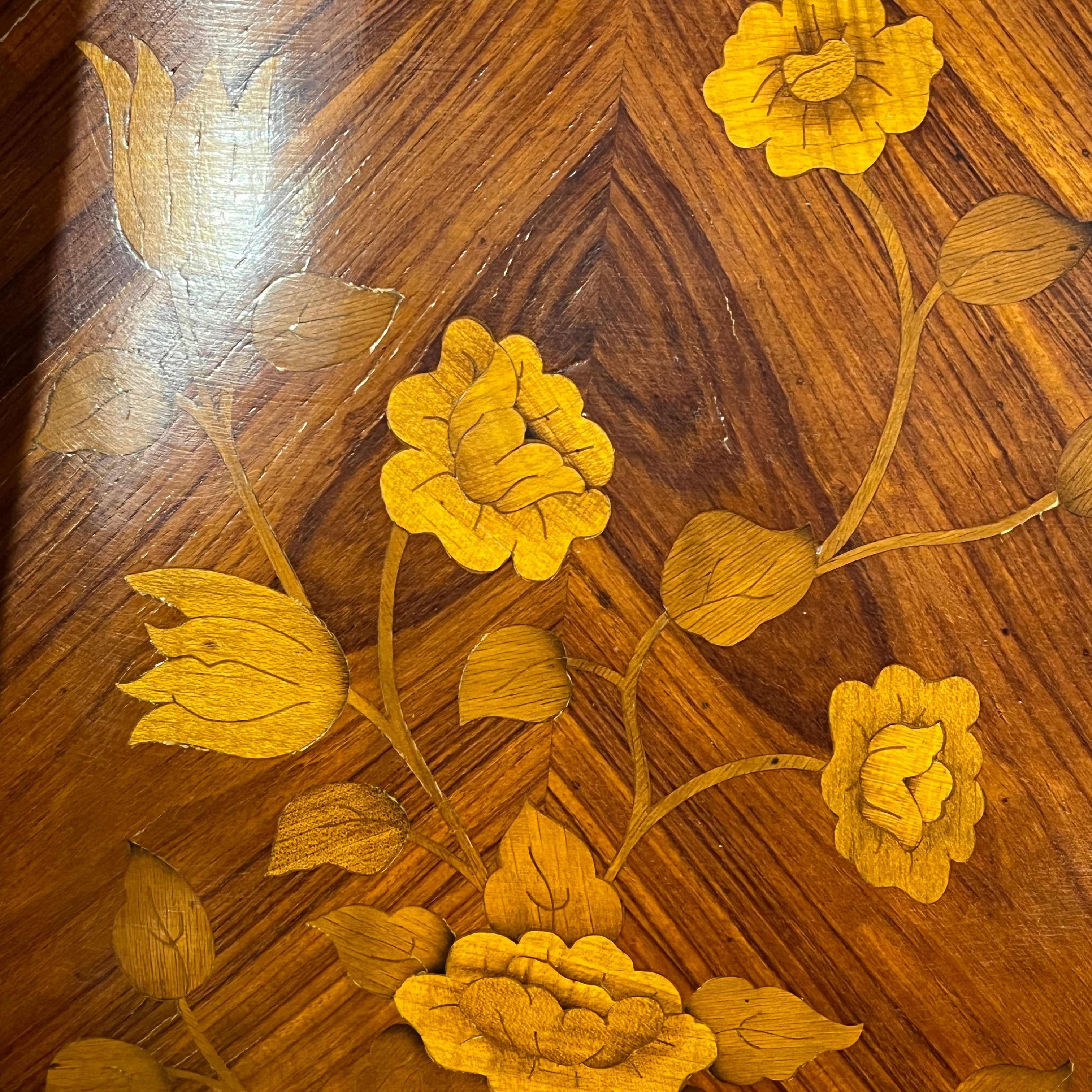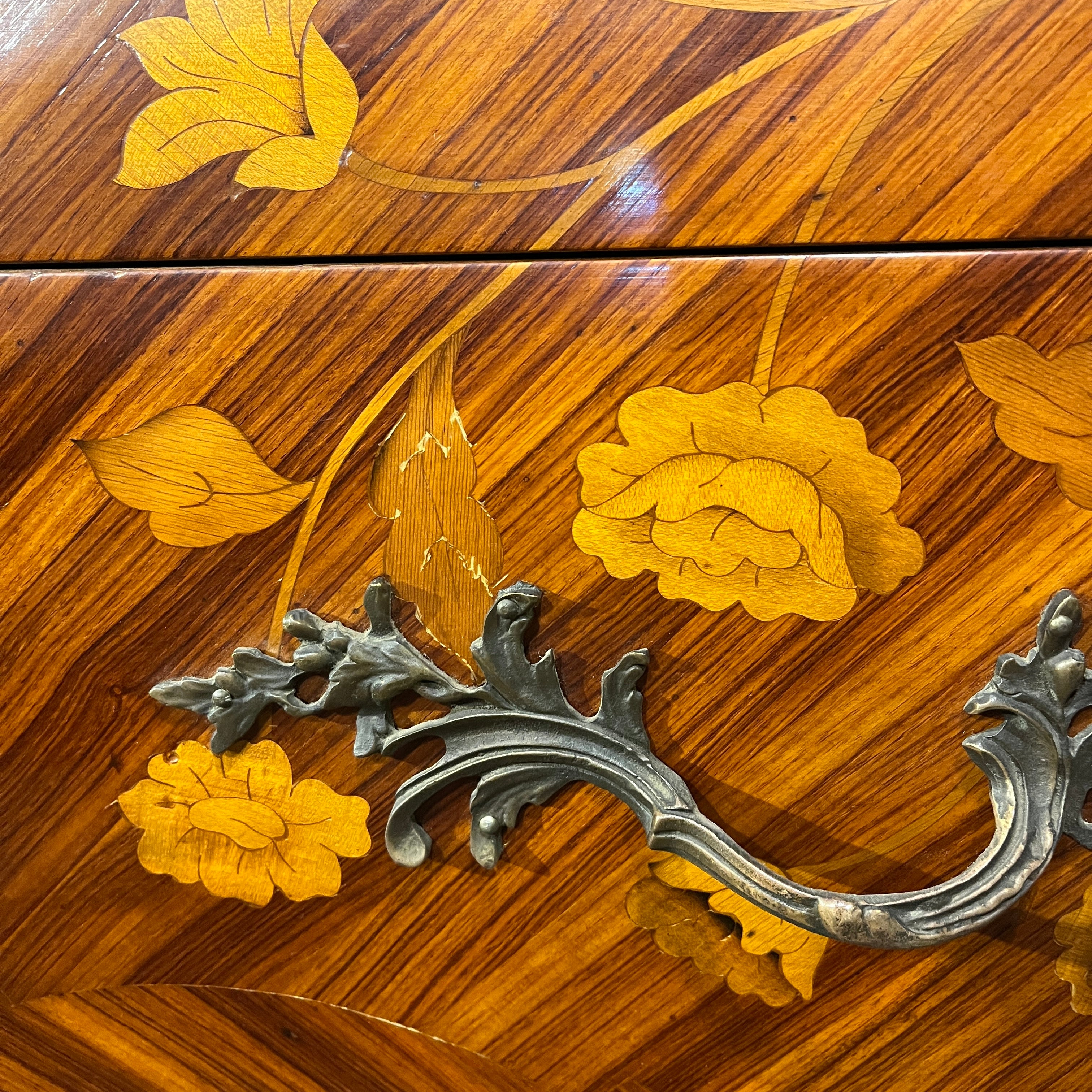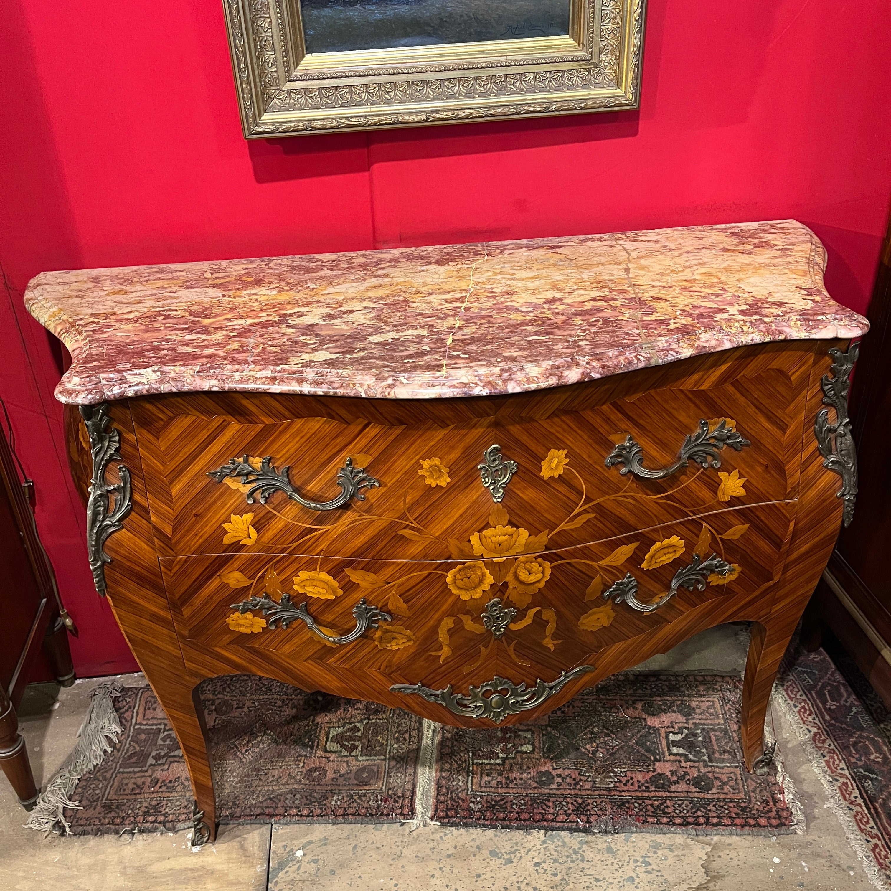 Cómoda Luis XV bombé marquetería floral y mármol rosa