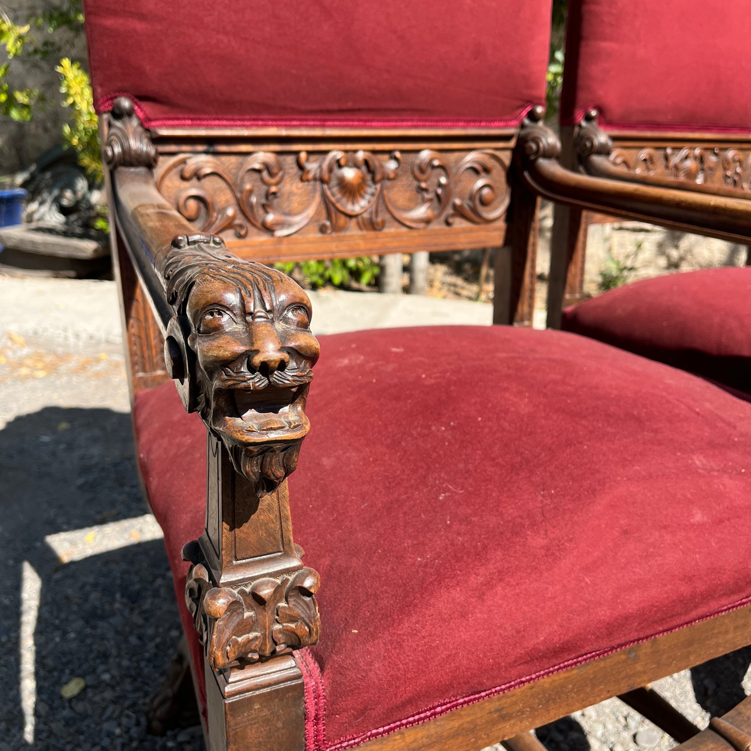 Gran juego de salón de origen francés y estilo renacentista compuesto de 9 piezas: un sillón de tres cuerpos, dos sitiales y seis sillas, todas con estructura de madera tallada en relieves decorados y tapizadas en un llamativo terciopelo rojo. Podemos identificar el estilo renacentista de estas piezas por sus patas de cruceta tallada y los motivos de ángeles en su respaldo.