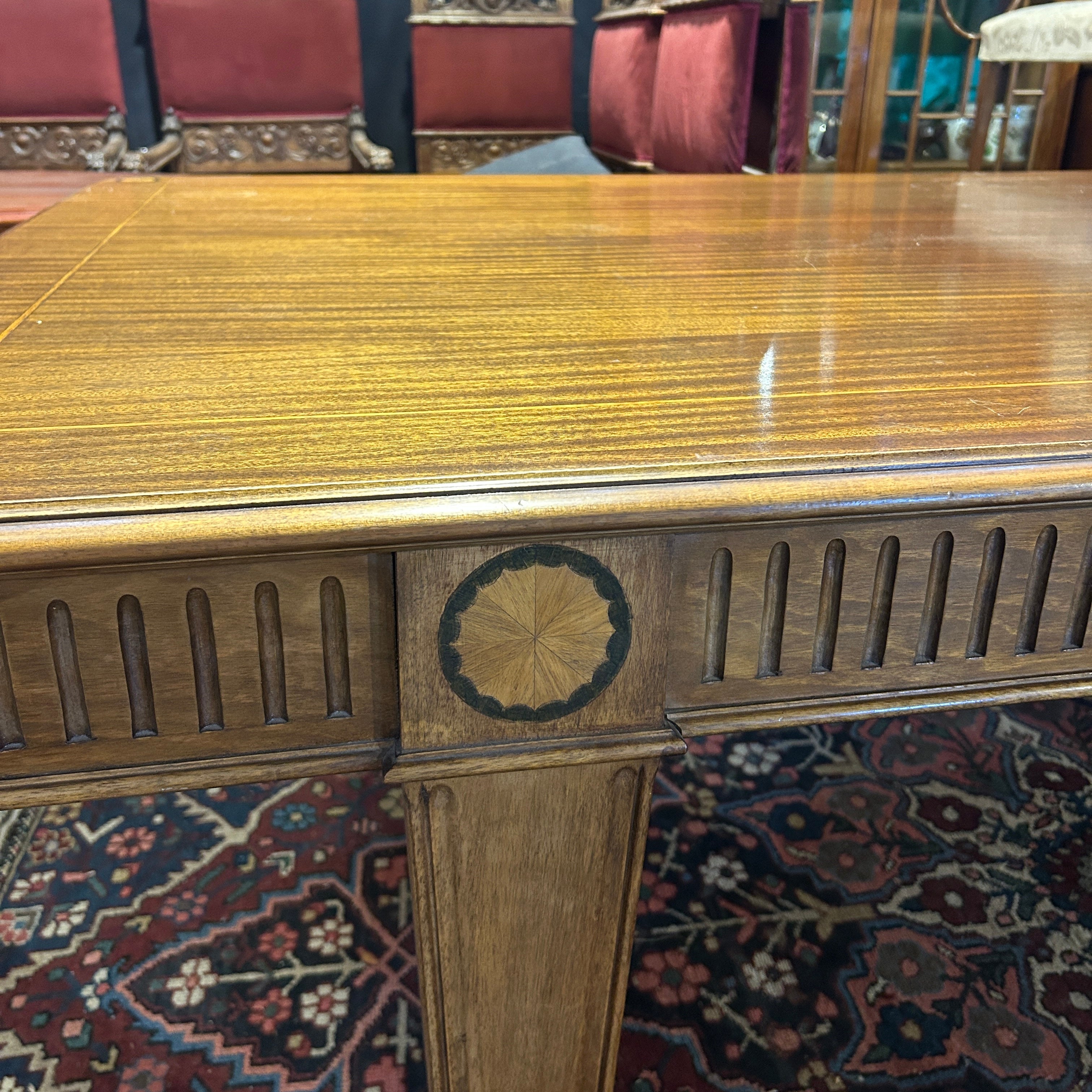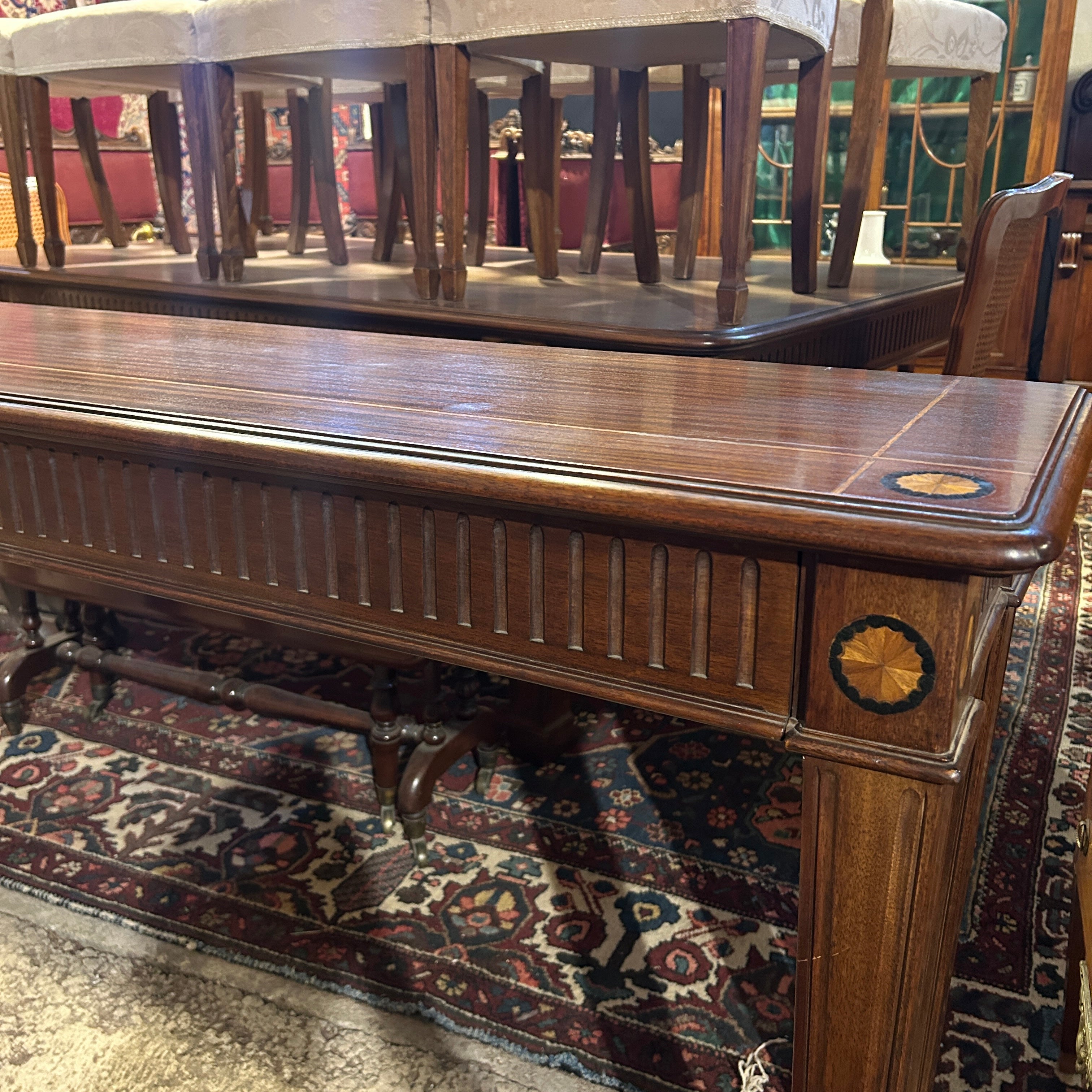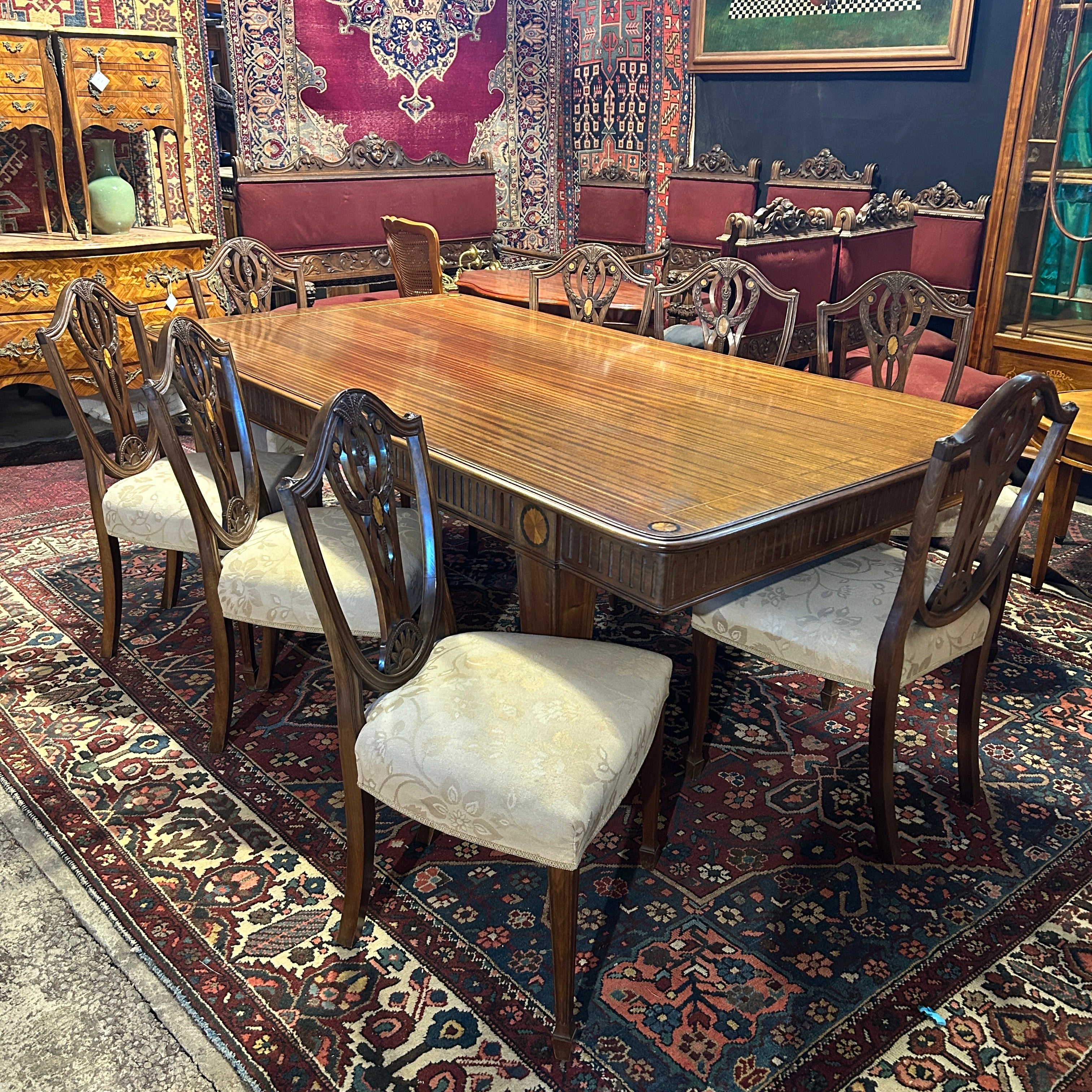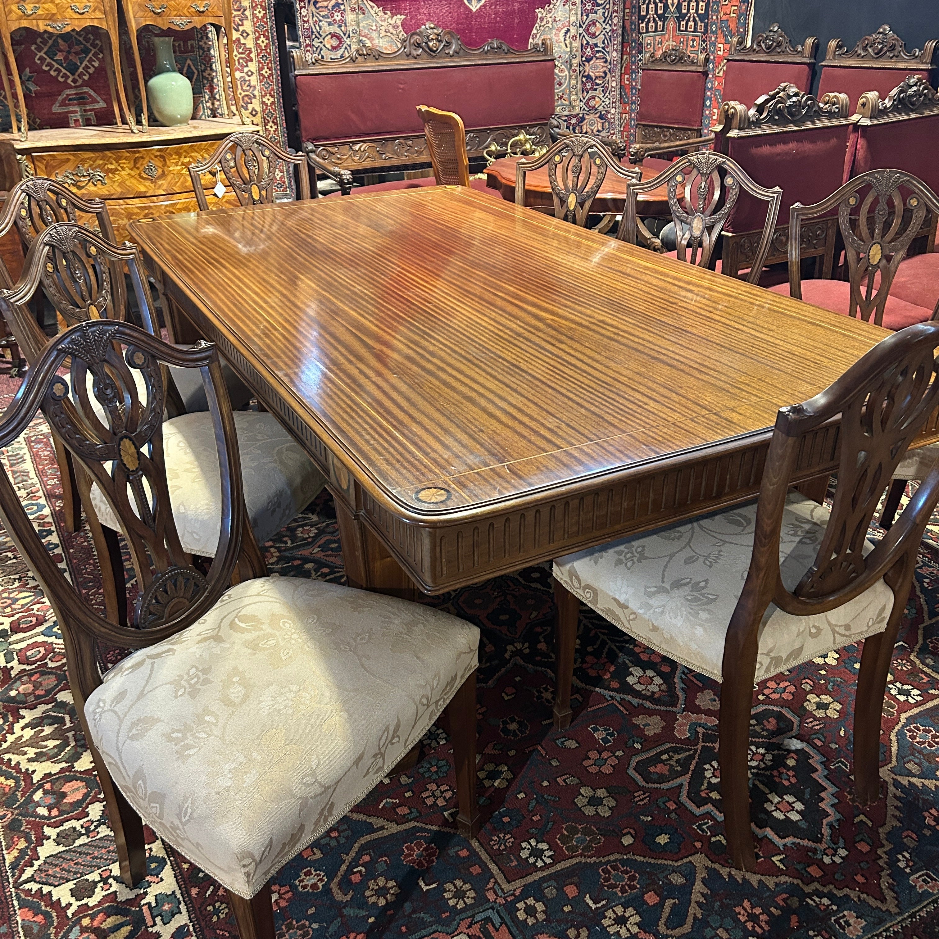 Bello amoblado compuesto de amplia mesa de comedor estilo inglés, Hepplwhite, en caoba rubia satinada, barniz original, con filetes y marqueteria, tallado a mano. Trae ocho sillas con respaldo tallado y asiento tapizado en tono crudo y motivos florales y además una mesa arrimo estilo inglés, Hepplwhite, en caoba satinada con dos amplios cajones.