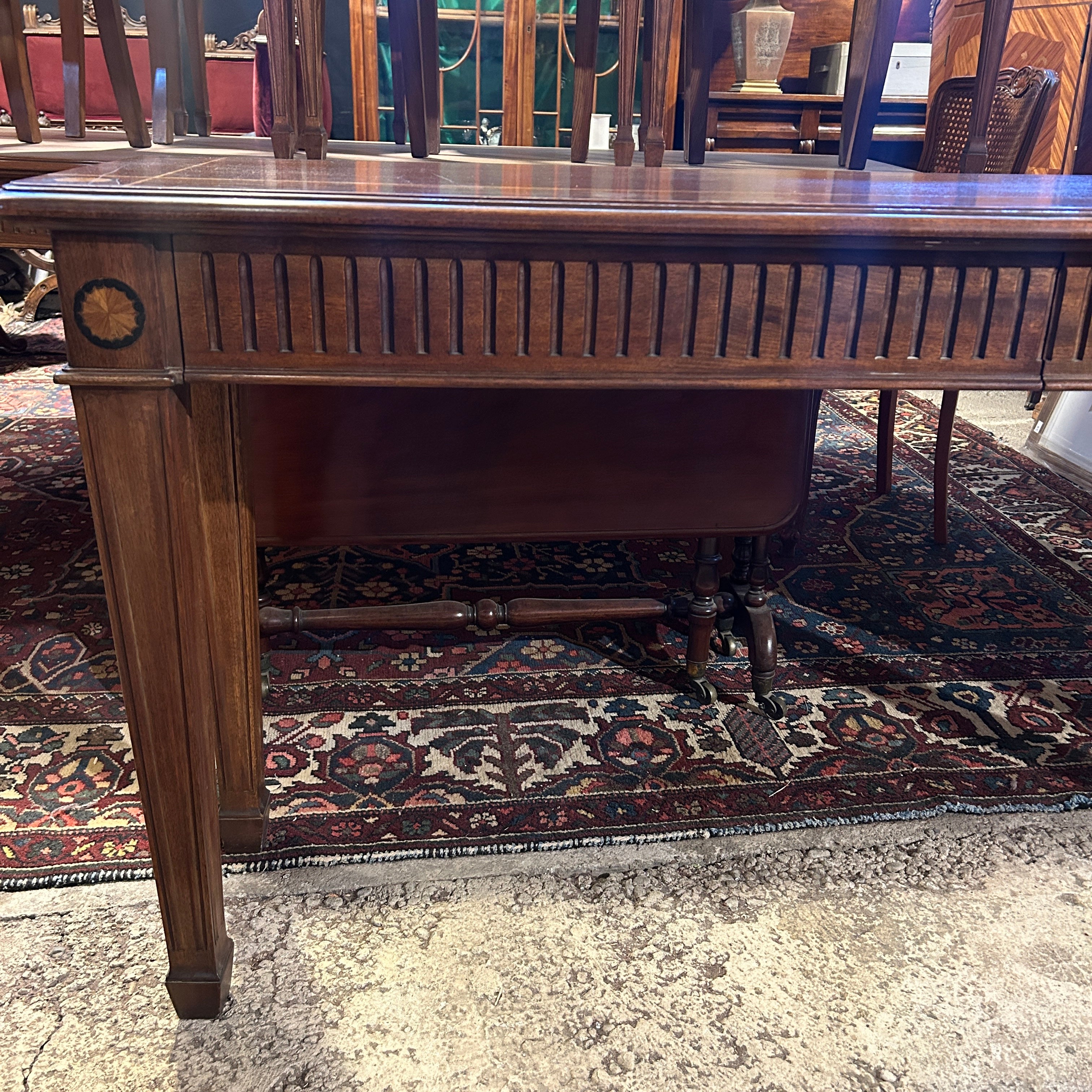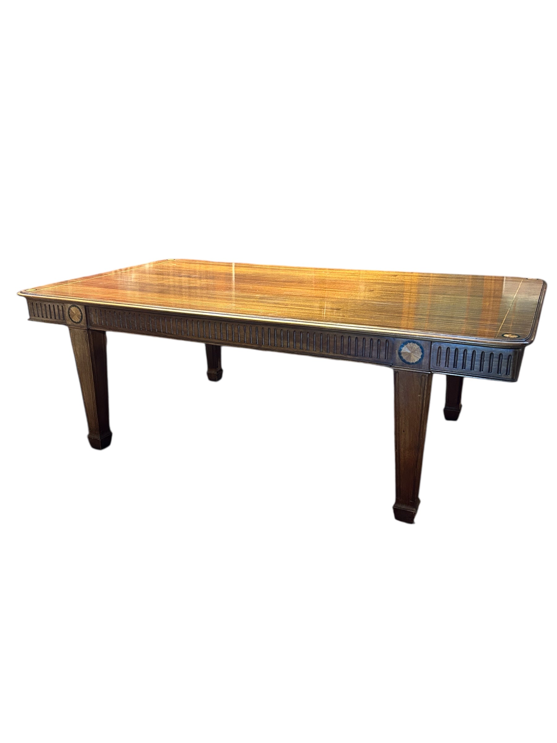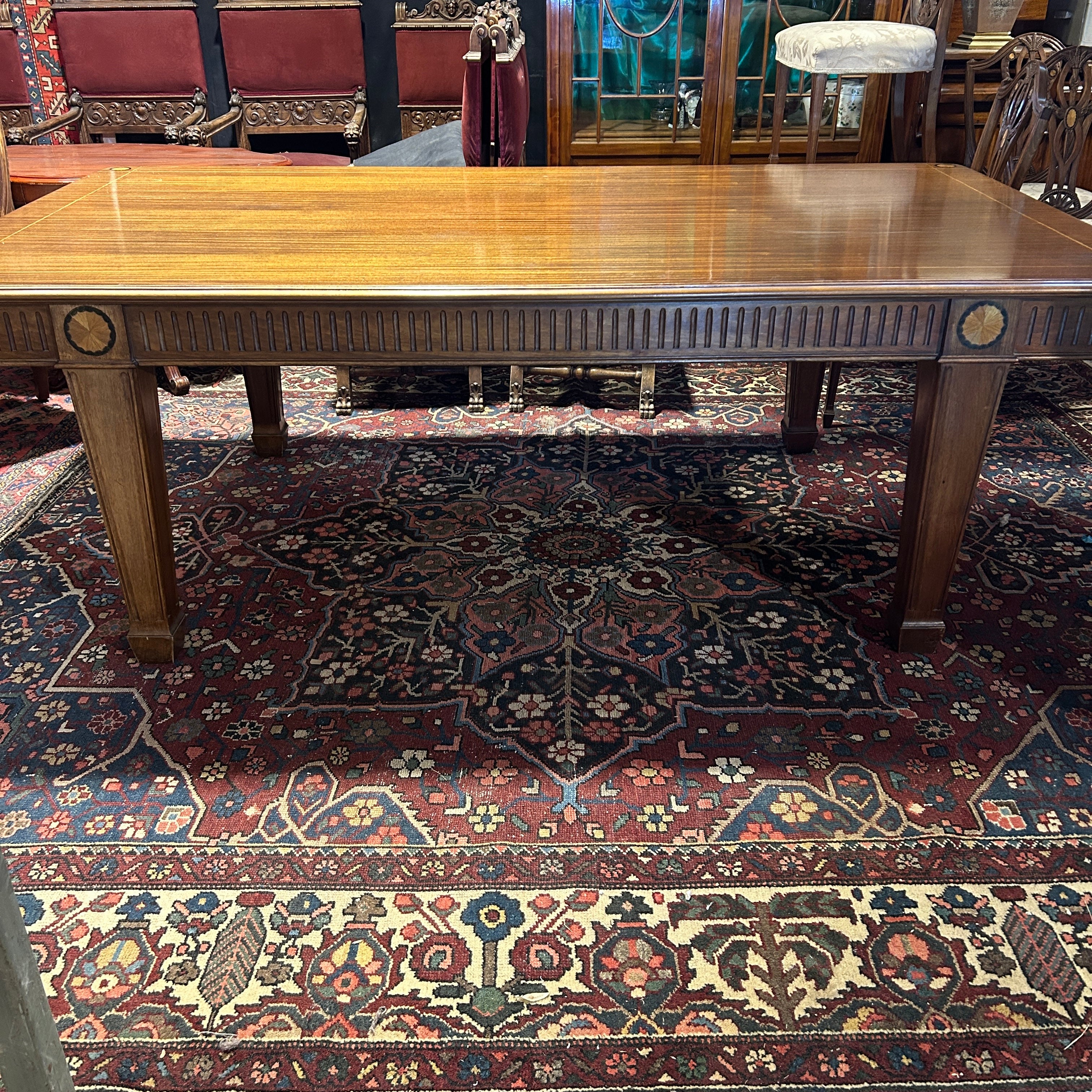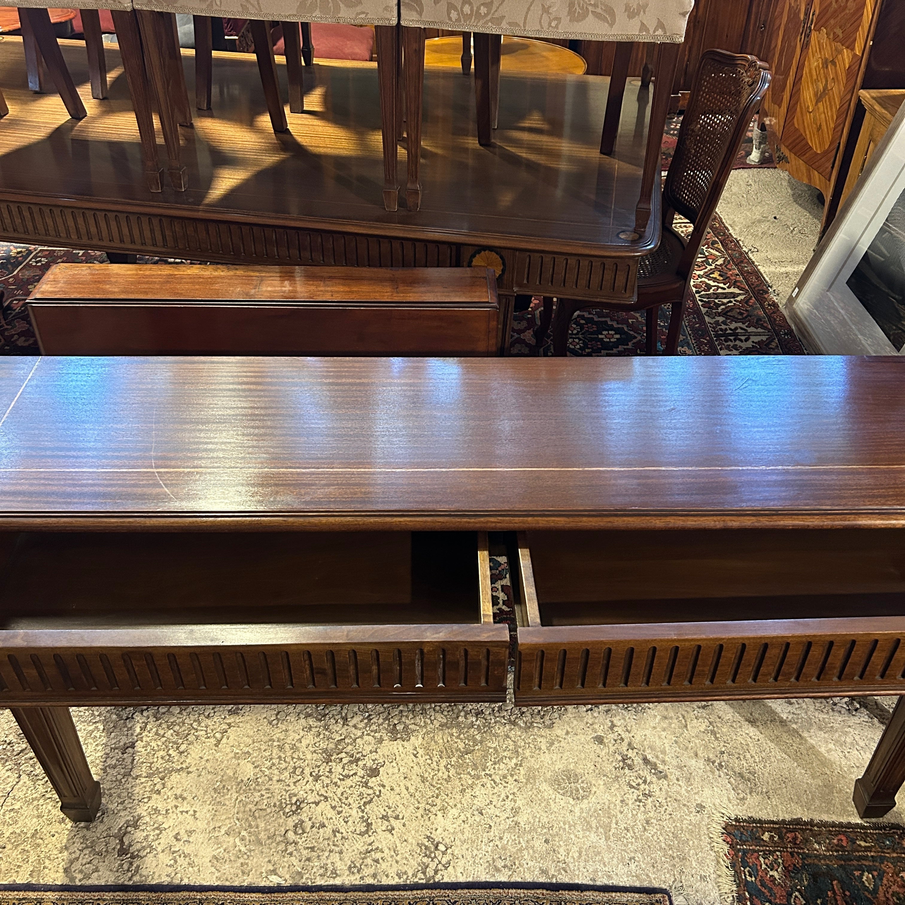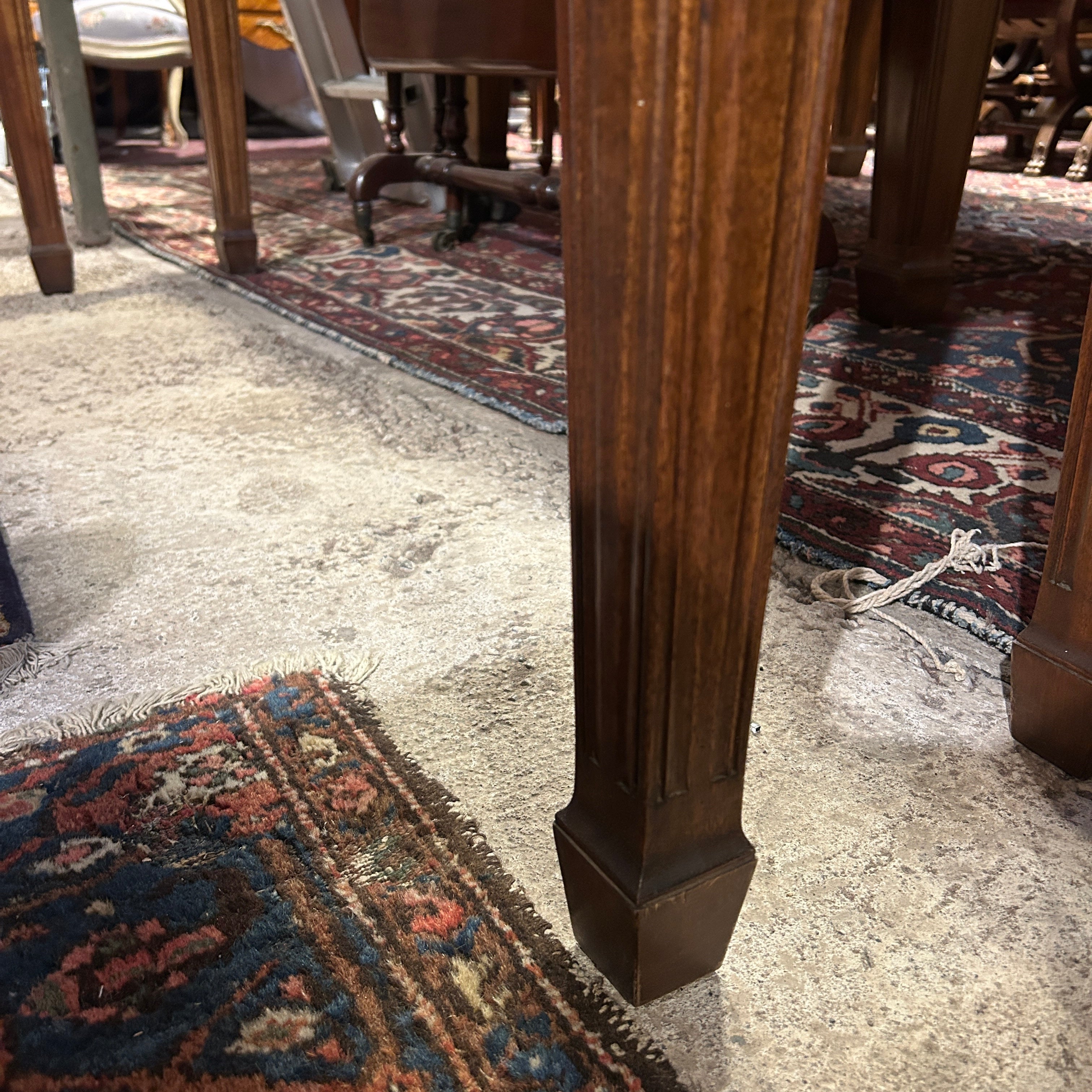 Bello amoblado compuesto de amplia mesa de comedor estilo inglés, Hepplwhite, en caoba rubia satinada, barniz original, con filetes y marqueteria, tallado a mano. Trae ocho sillas con respaldo tallado y asiento tapizado en tono crudo y motivos florales y además una mesa arrimo estilo inglés, Hepplwhite, en caoba satinada con dos amplios cajones.